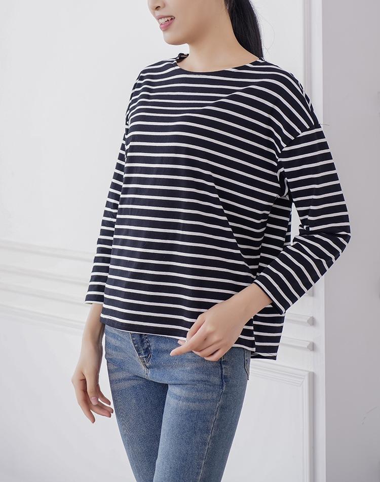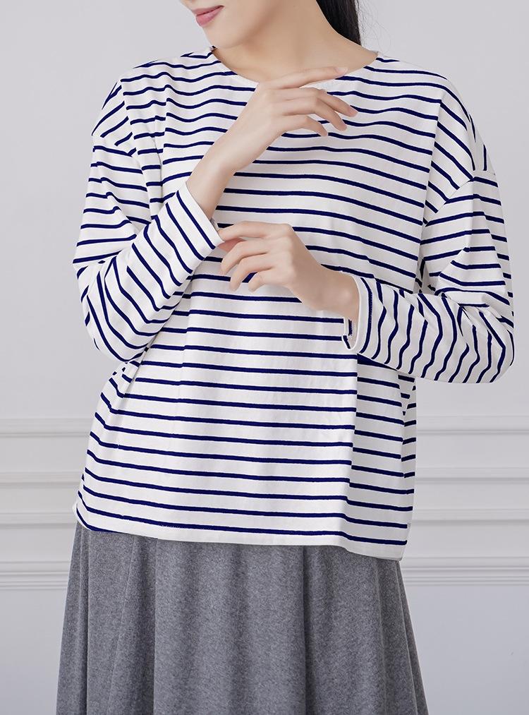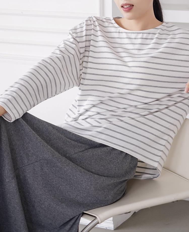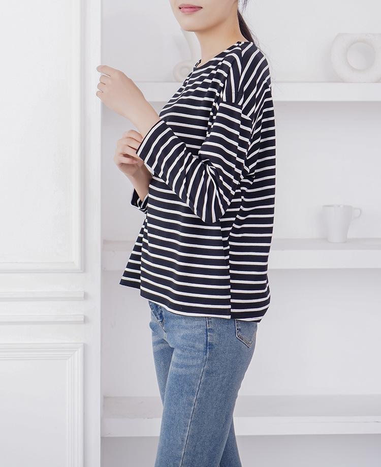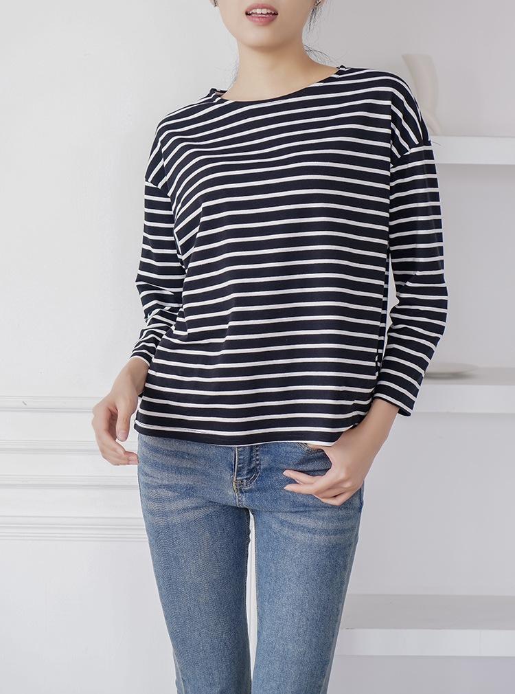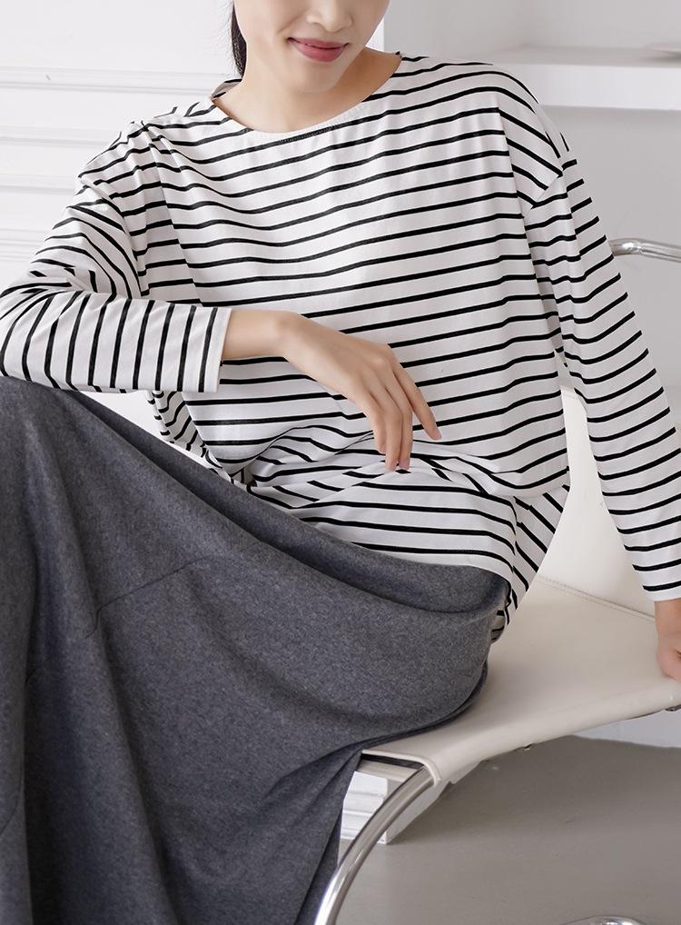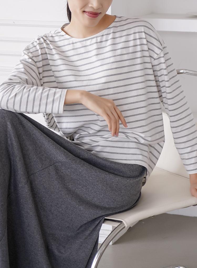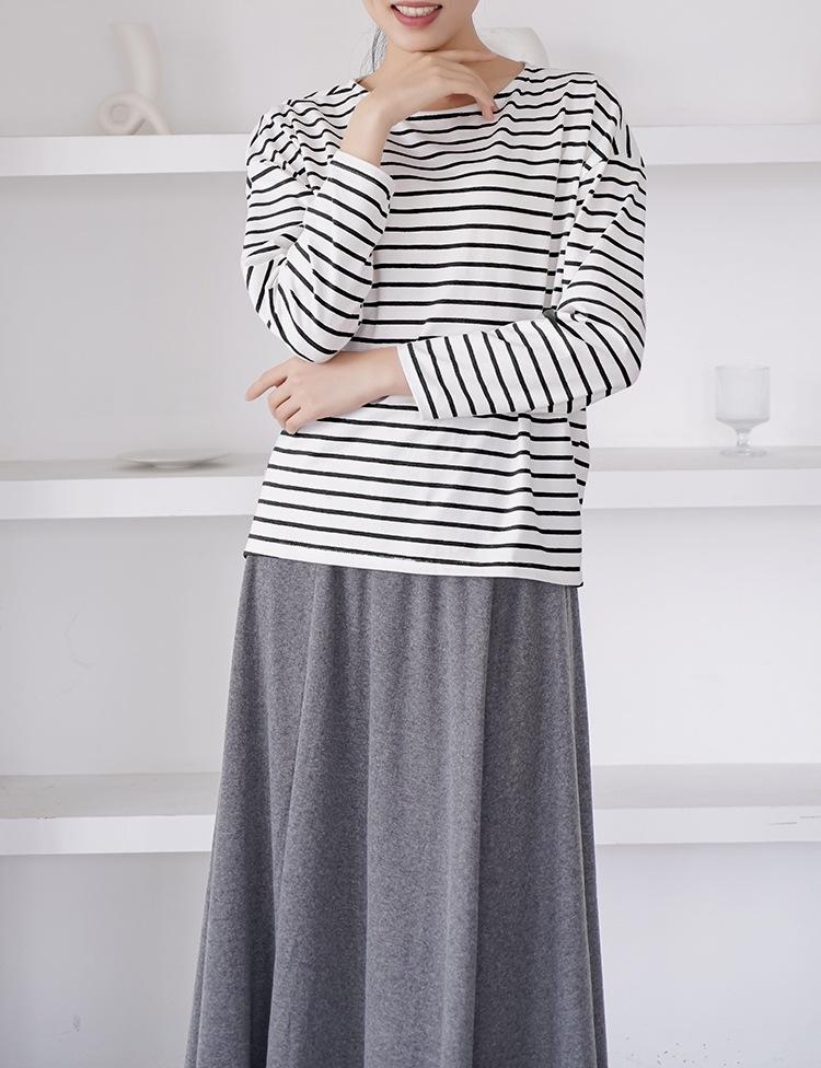 Camiseta japonesa de manga larga a rayas para mujer, jersey sencillo y combinable, cuello redondo holgado, para otoño e invierno.
