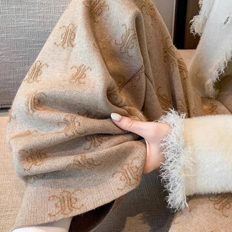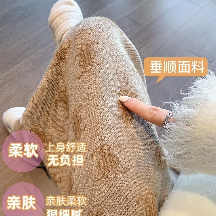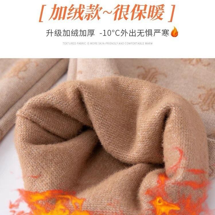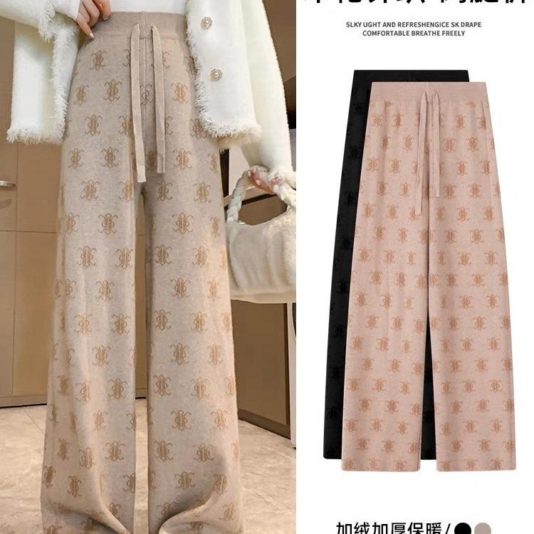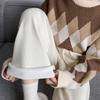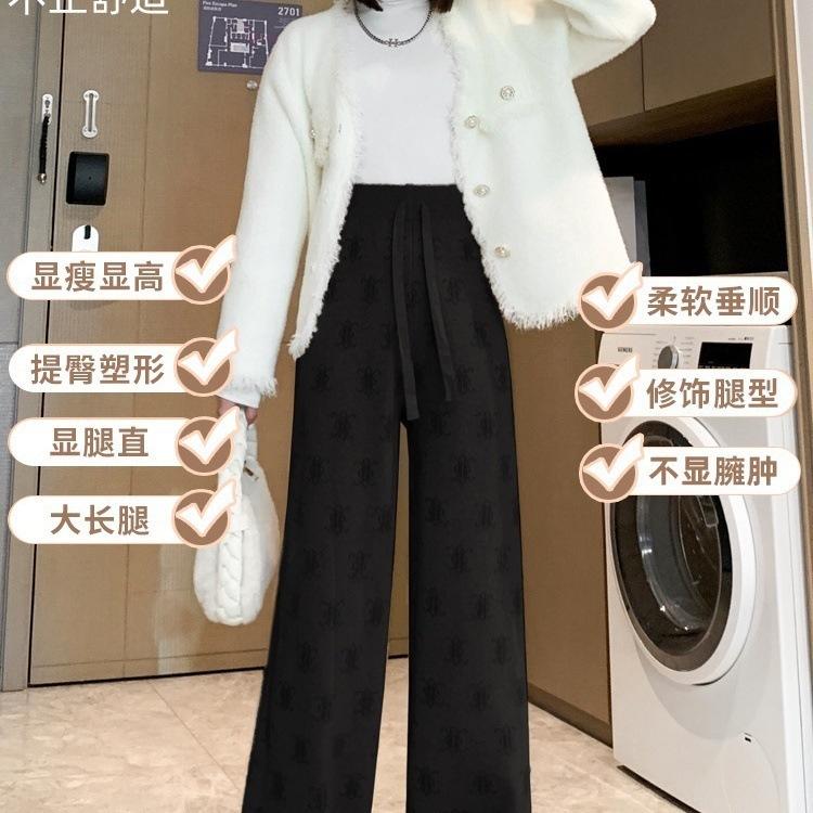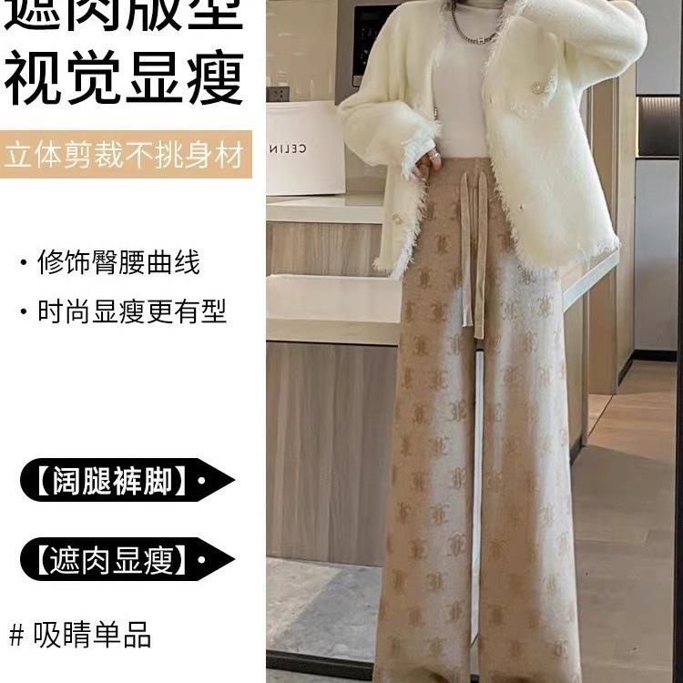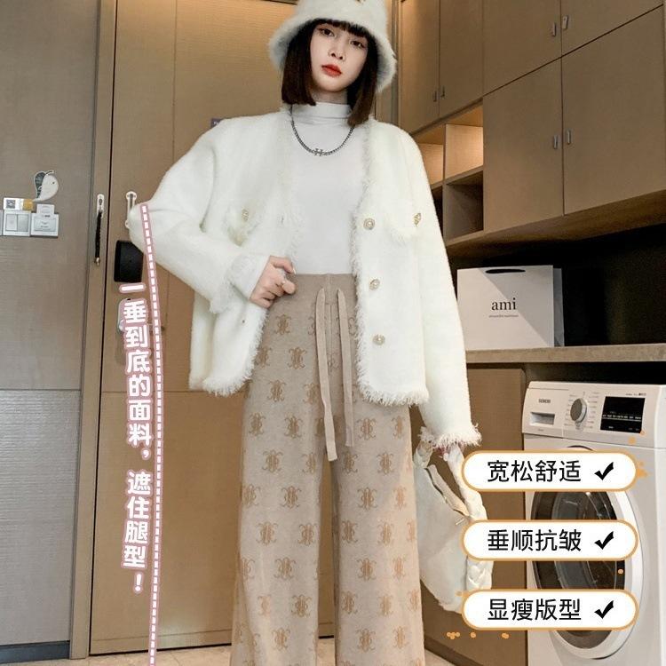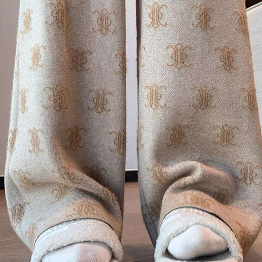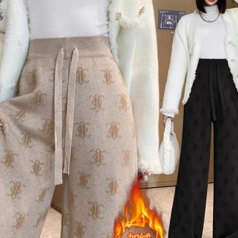 Pantalones anchos de punto jacquard gruesos con forro polar para mujer, otoño e invierno, nuevos pantalones holgados, adelgazantes, rectos, de cintura alta y con volteo.