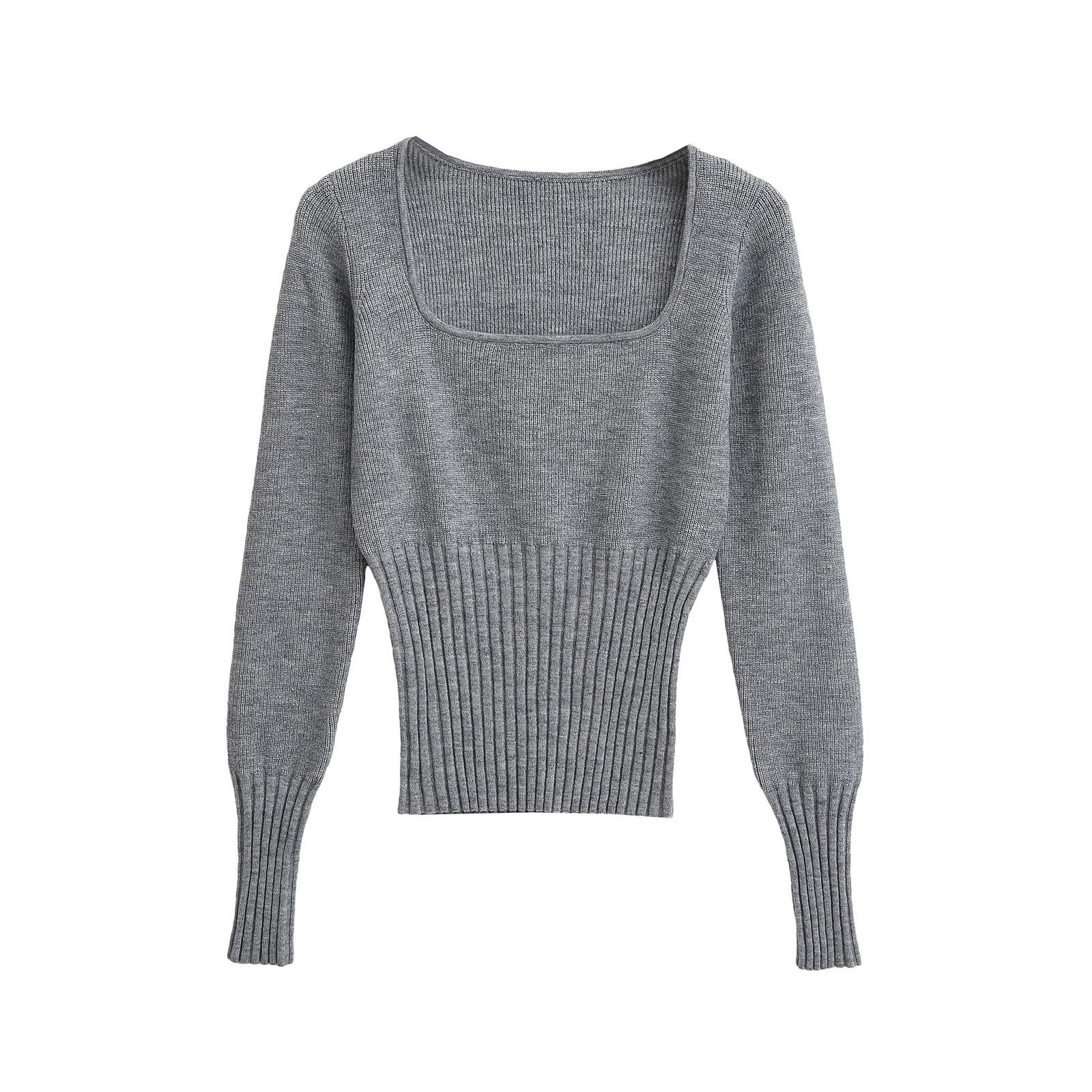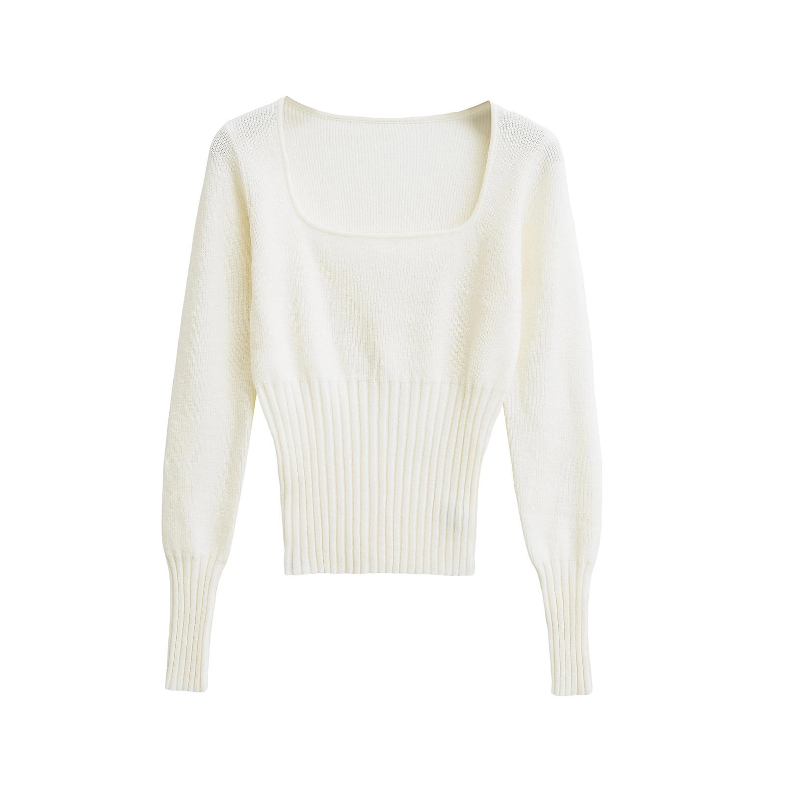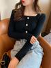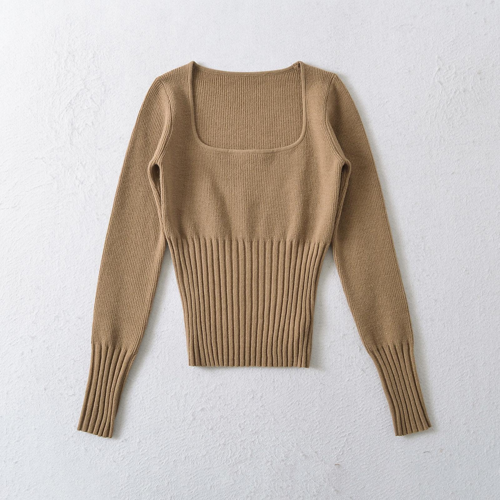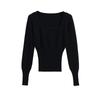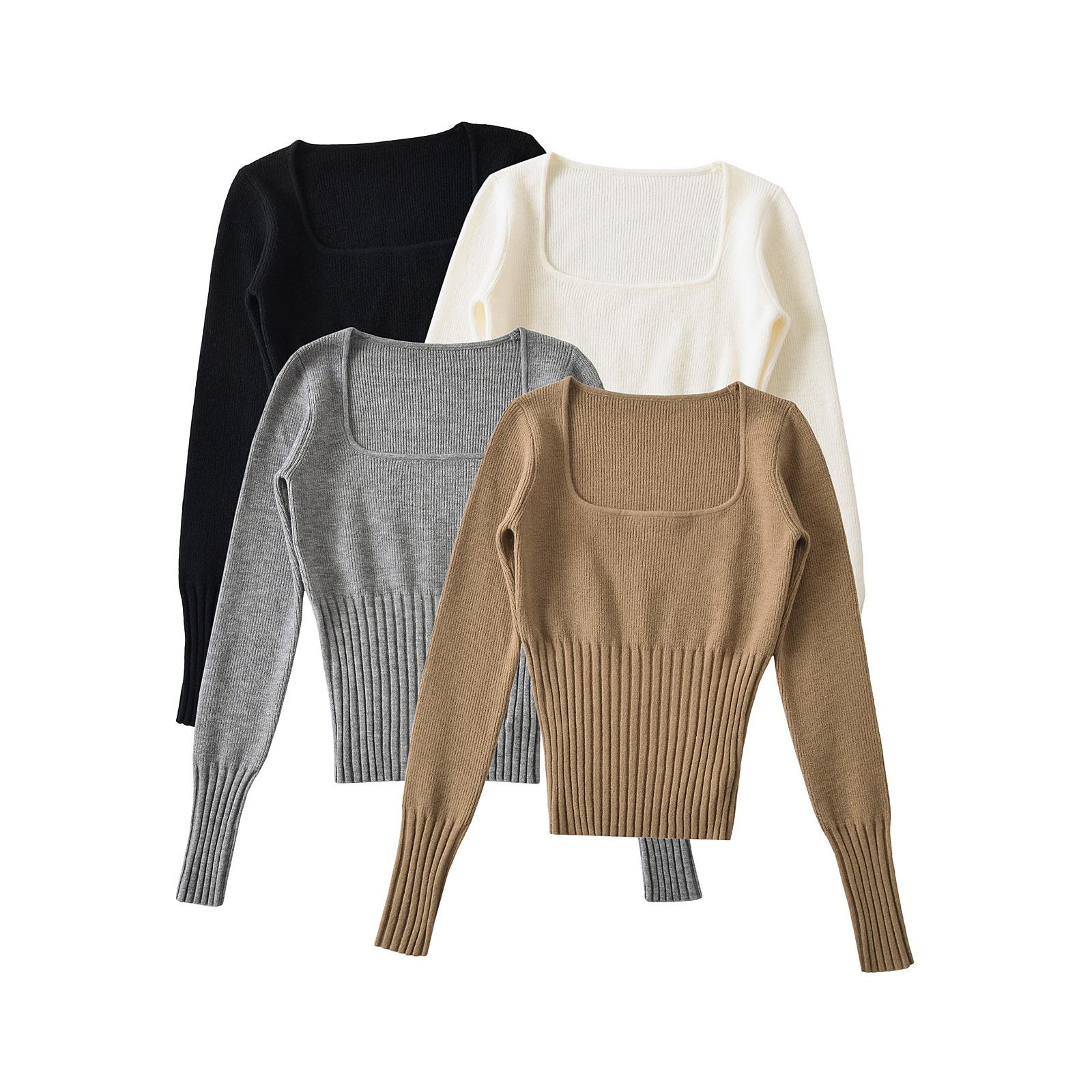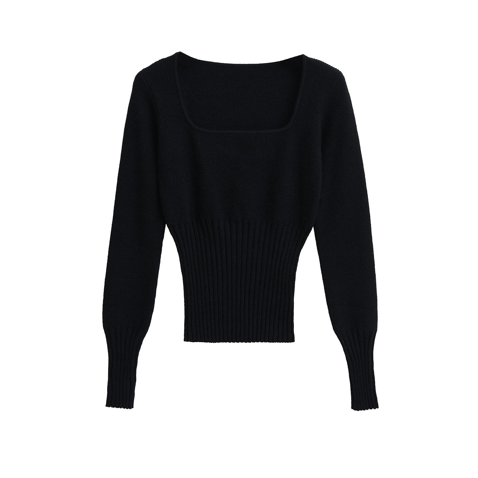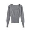 Camiseta elegante de manga larga de punto con cuello cuadrado grande y cintura alta para mujer, estilo francés, 2025, suéter ajustado, ropa para mujer.