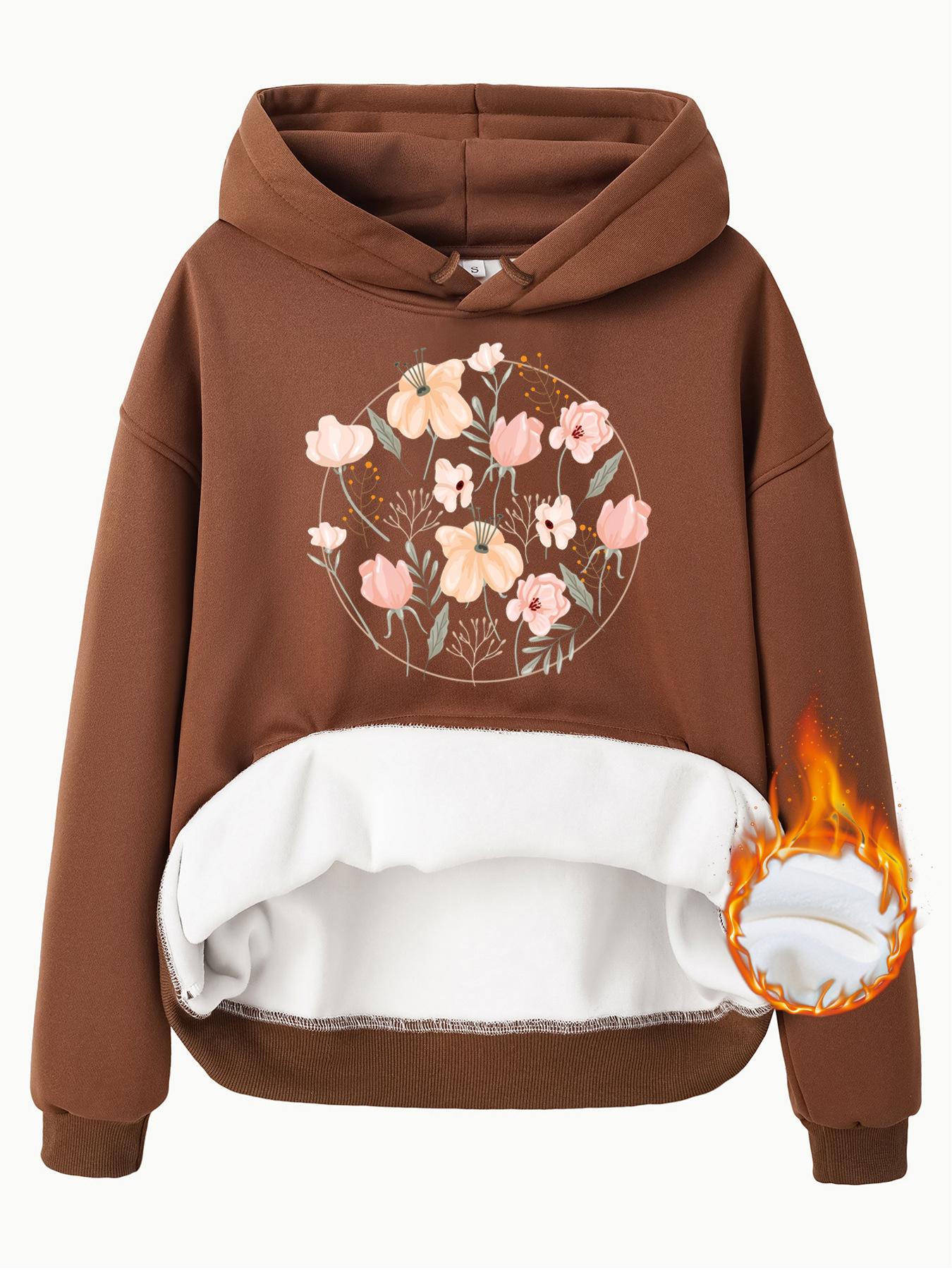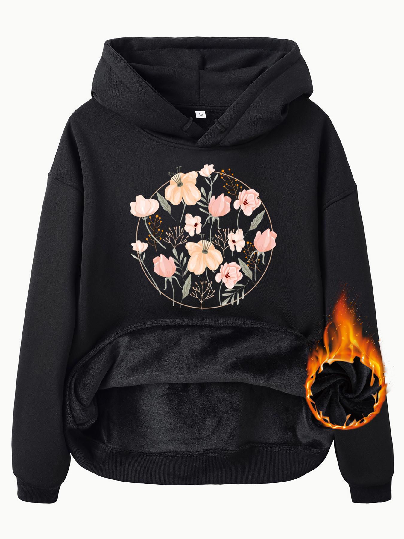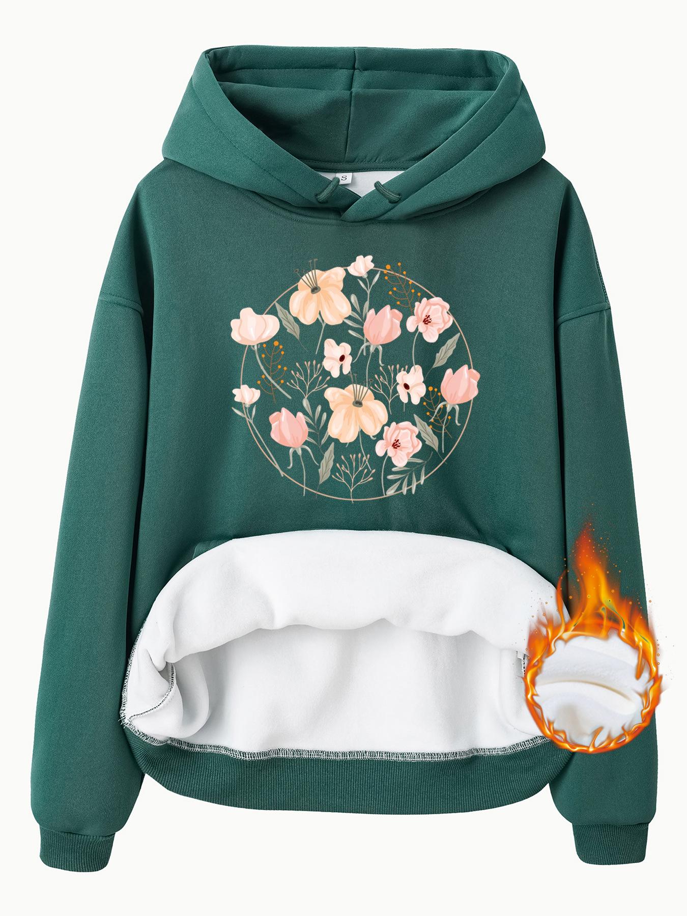 Sudadera de Otoño e Invierno para Mujer de Talla Europea Transfronteriza con Capucha, Manga Larga y Forro Polar, Bolsillo Canguro, Estampado Floral