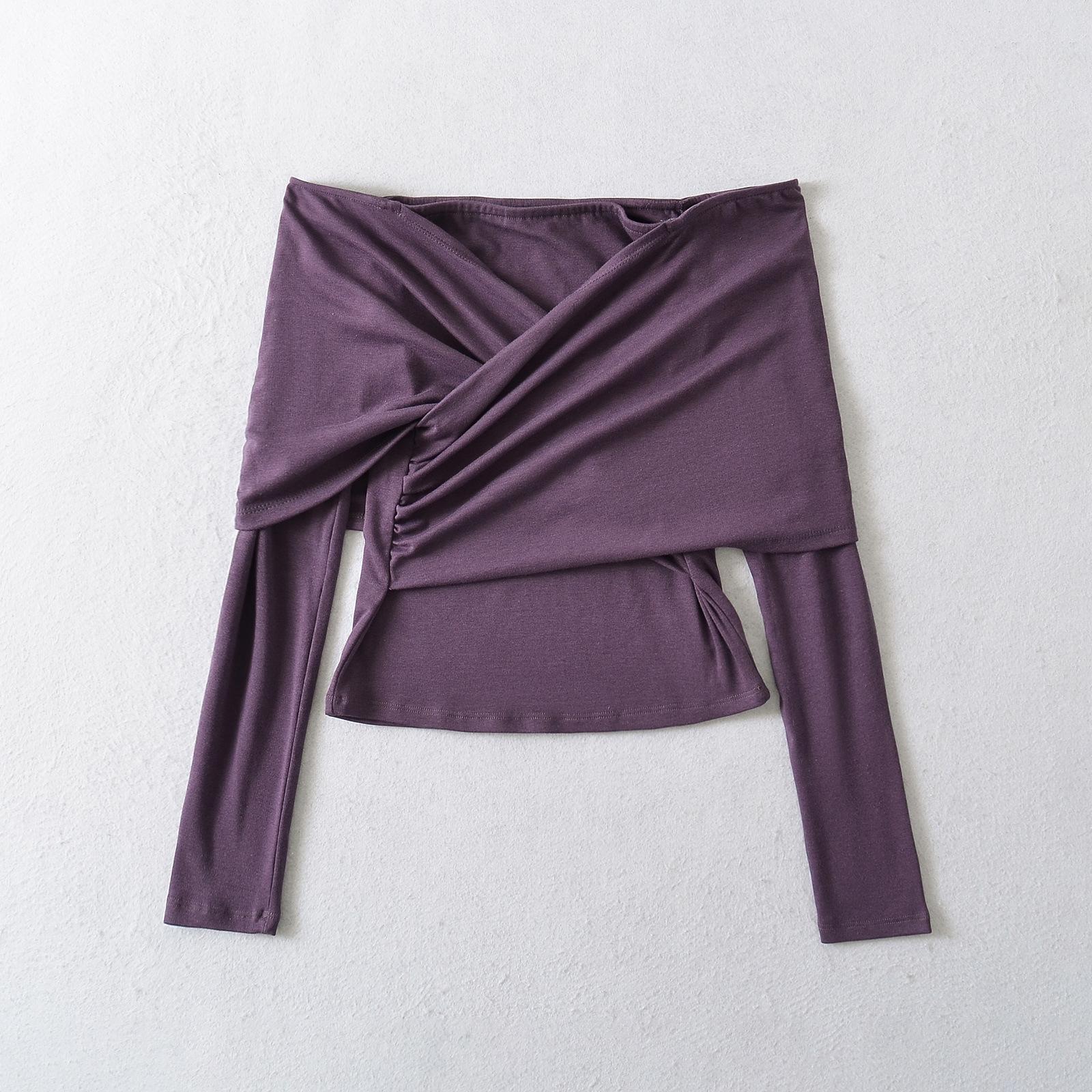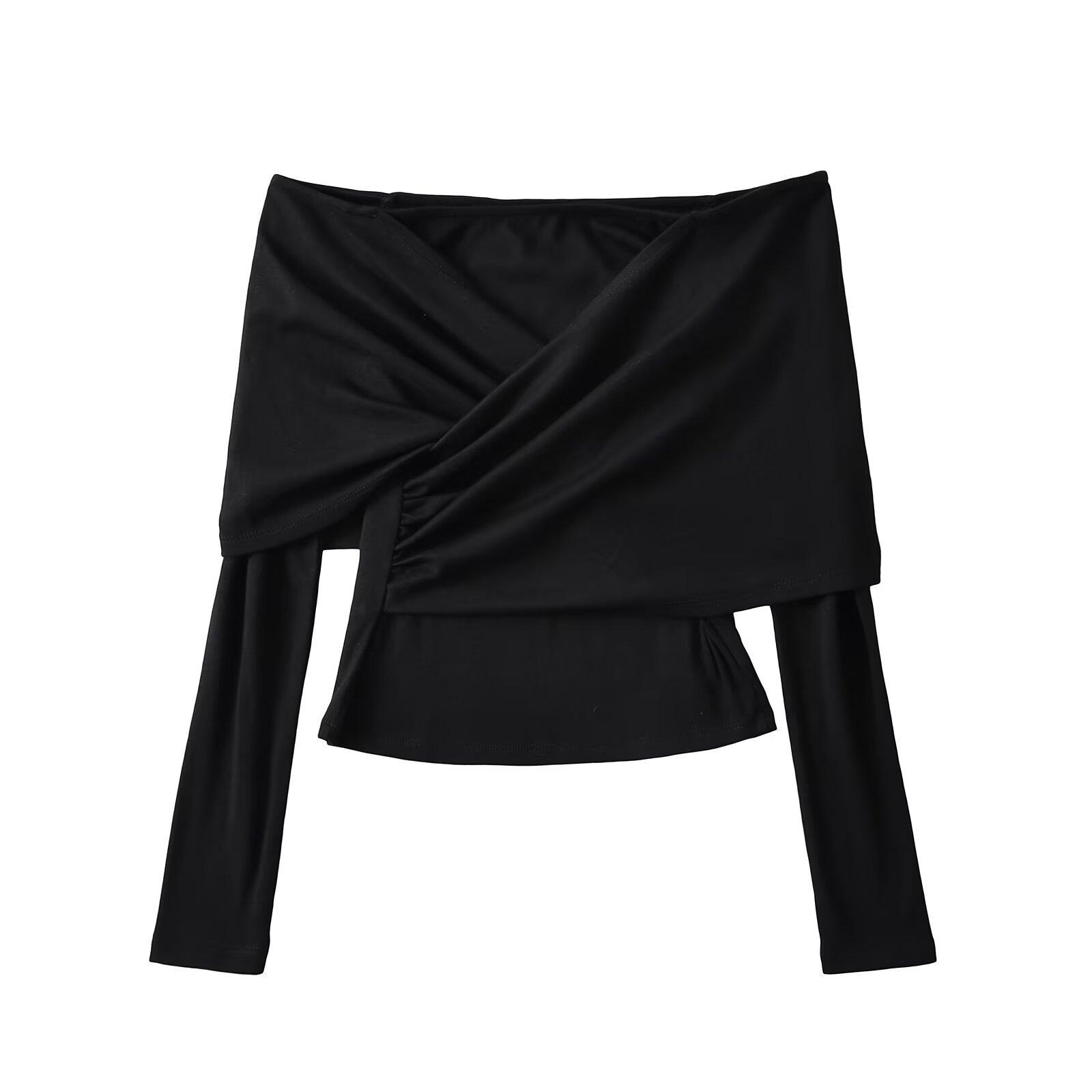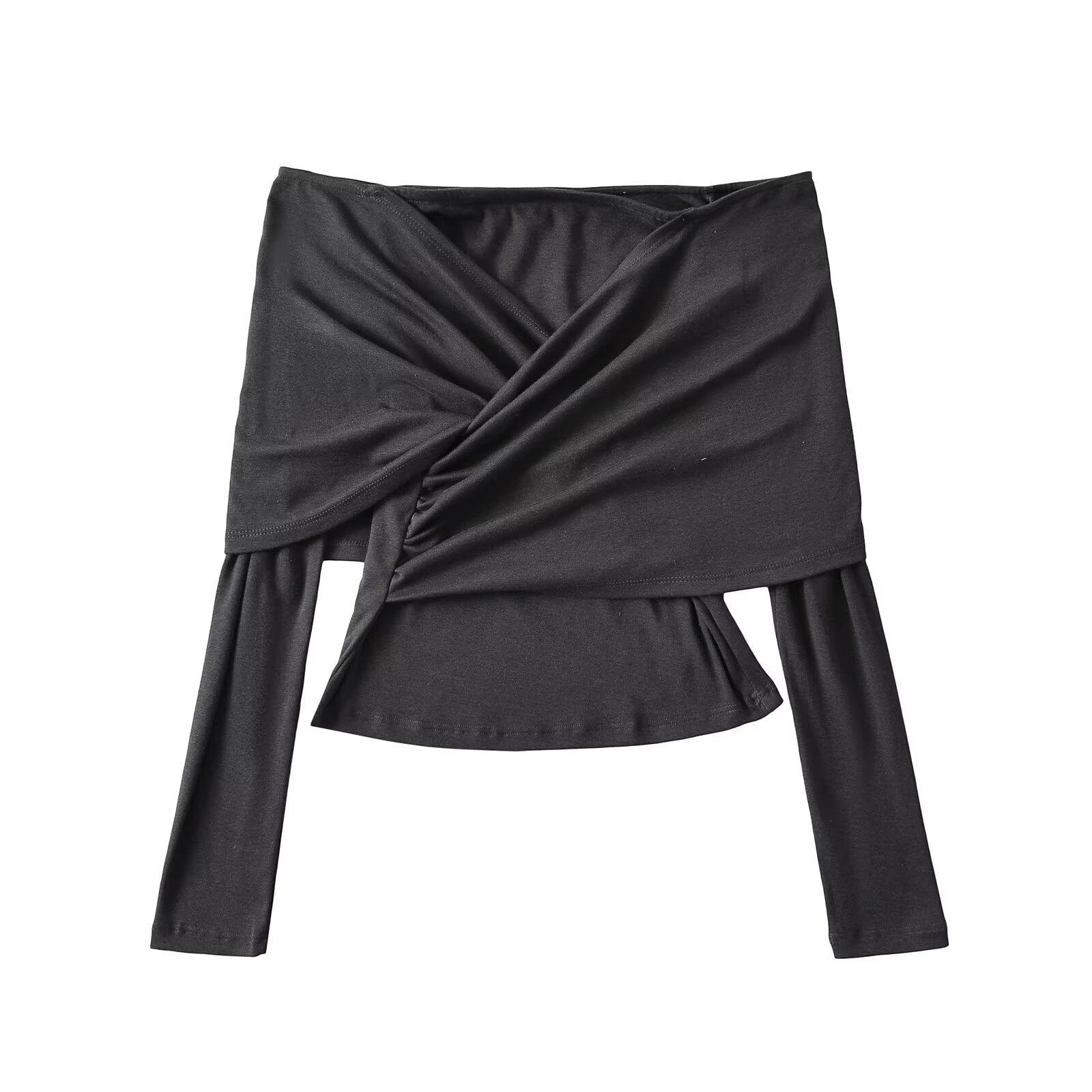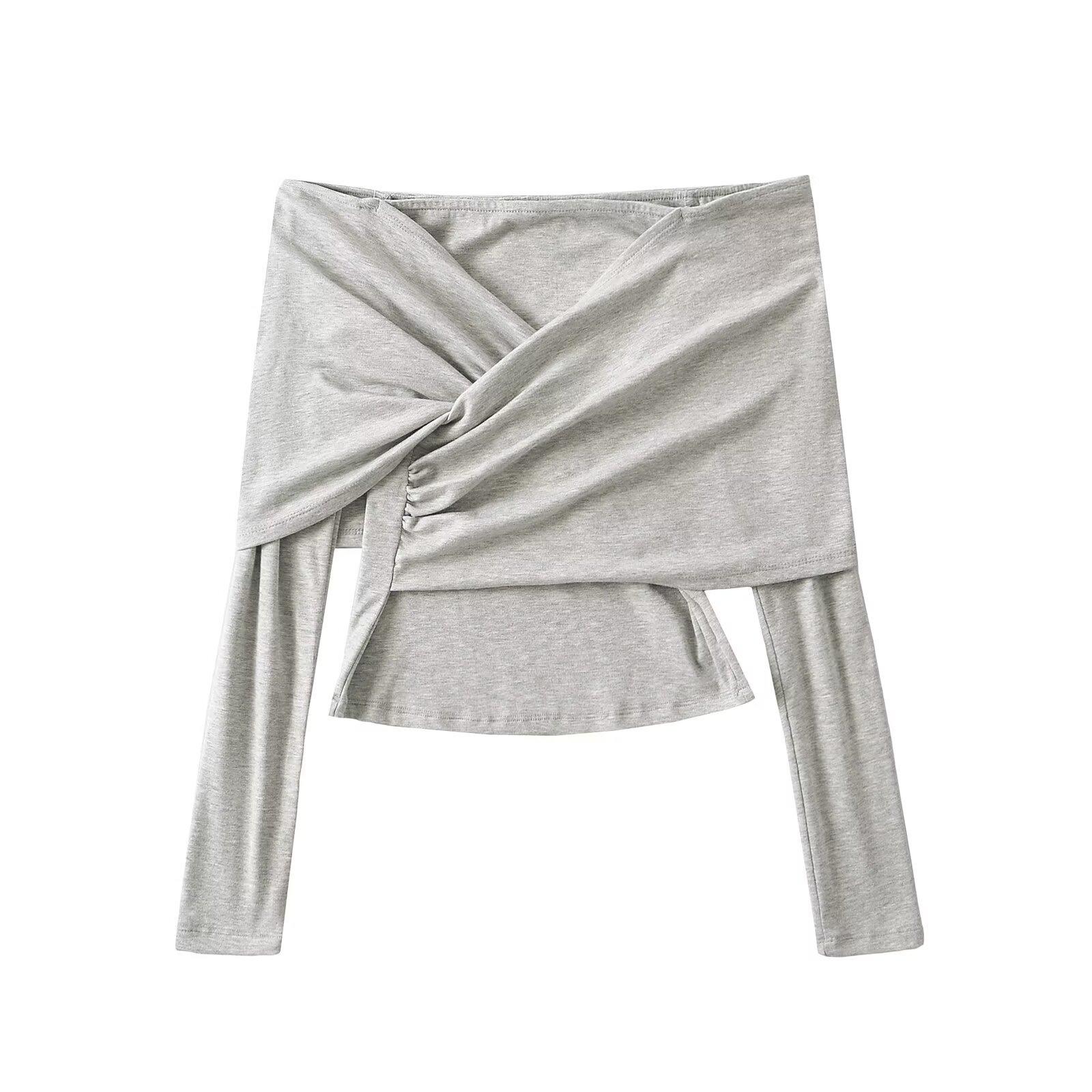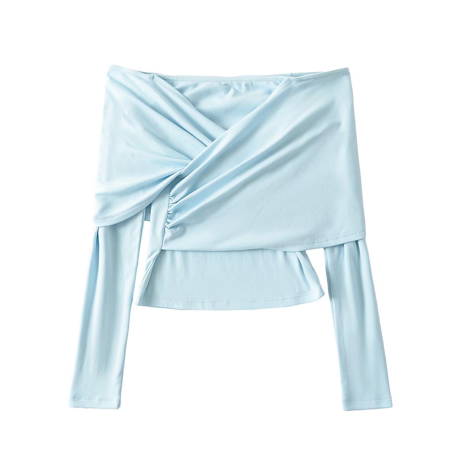 Camiseta ligera y sexy de estilo francés para mujer, estilo maduro, con hombros descubiertos, primavera 2025. Top cruzado plisado de manga larga para mujer.