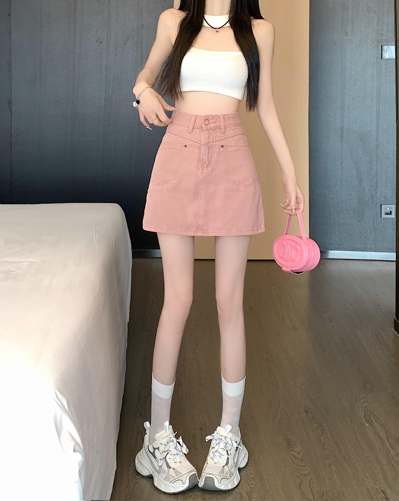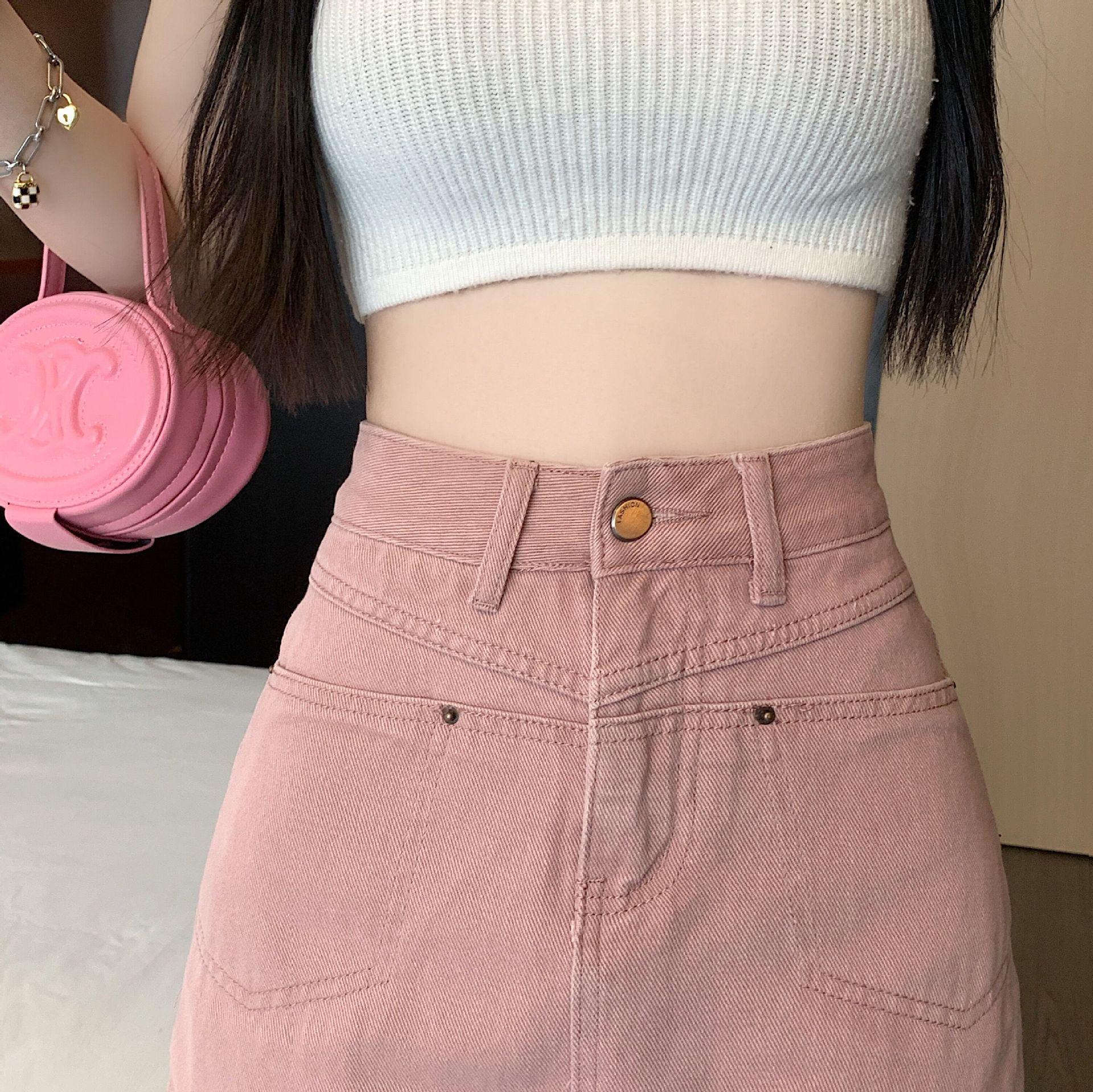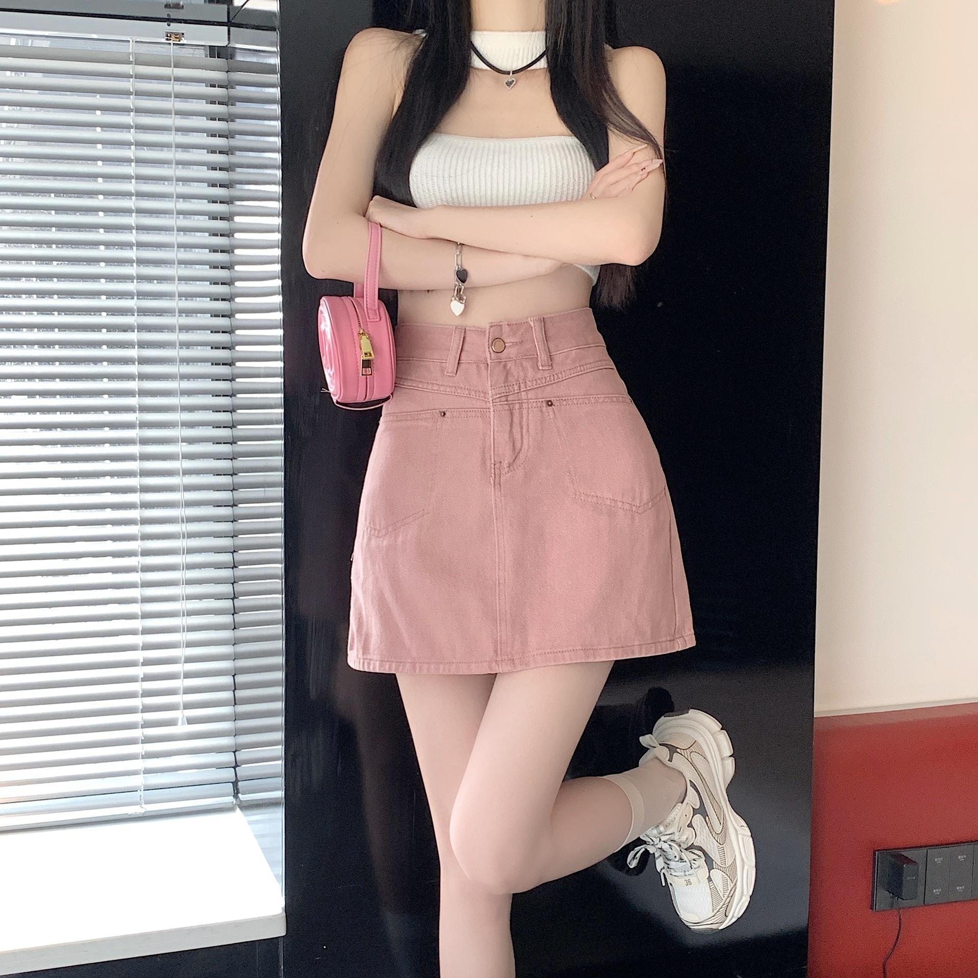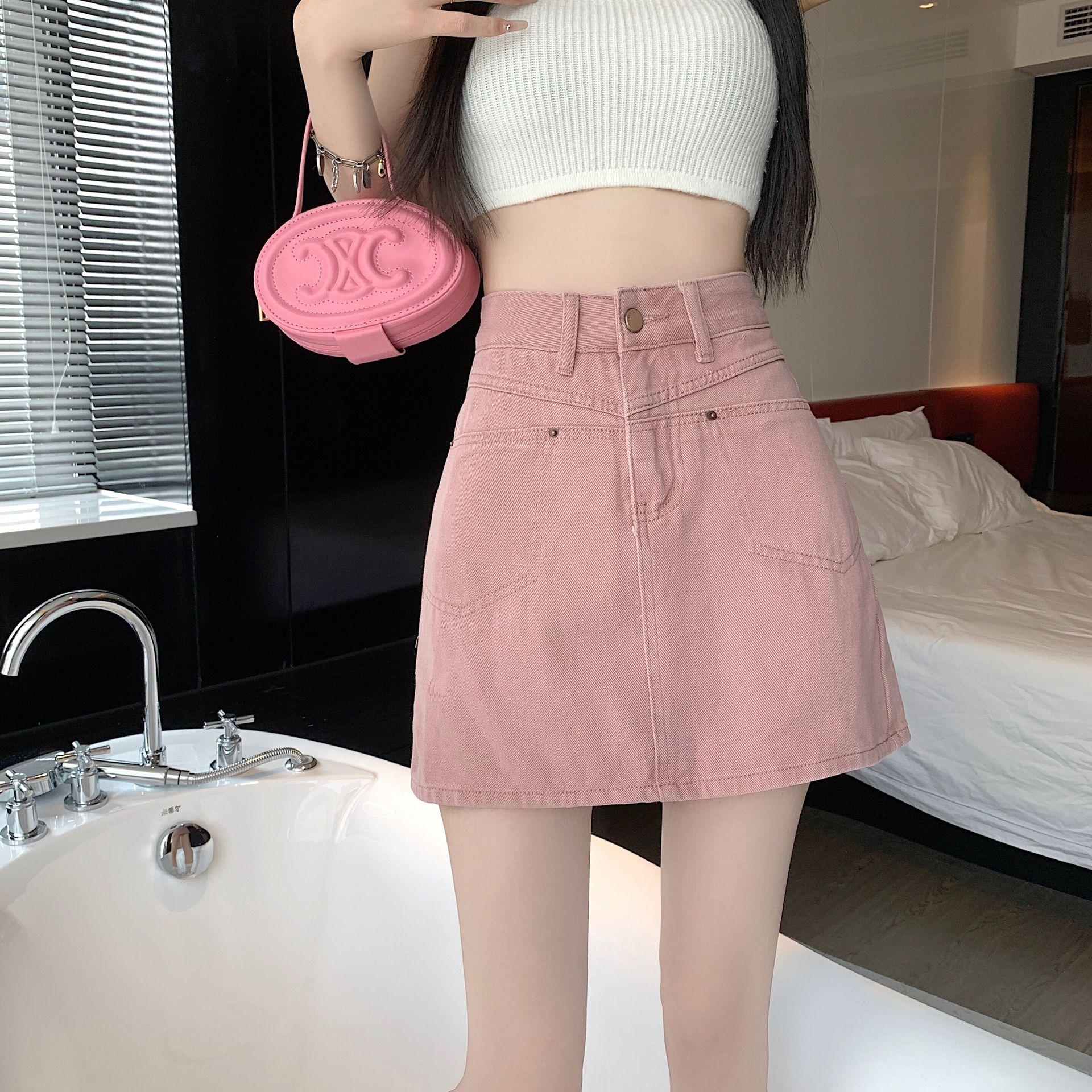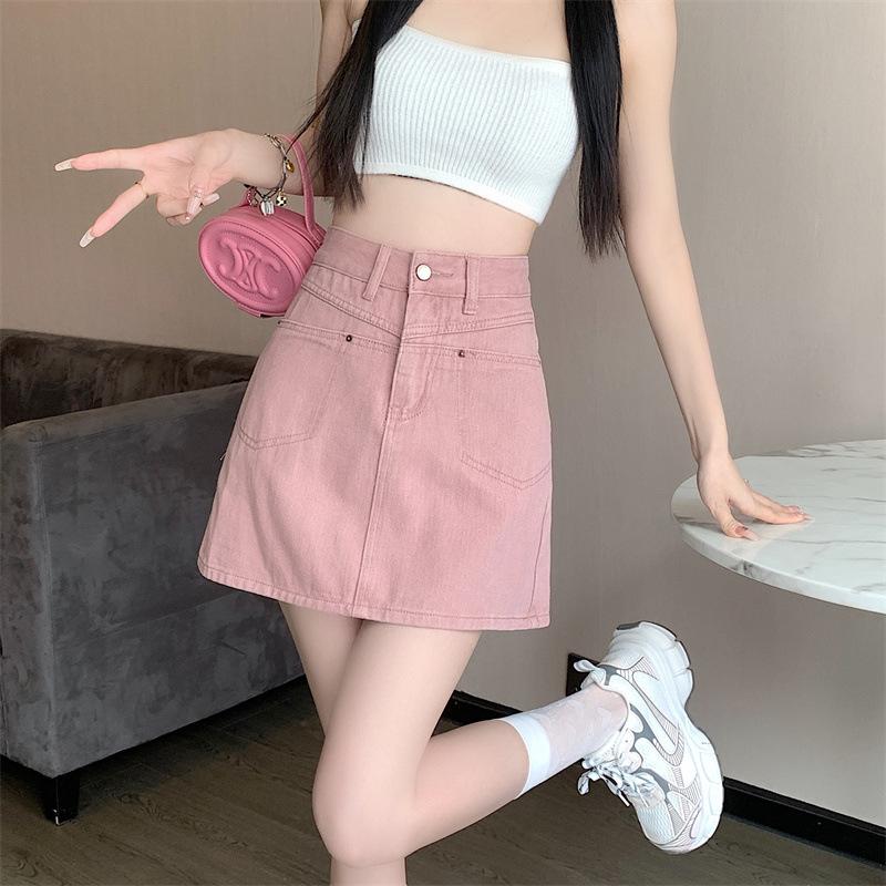 Falda de mezclilla rosa de talla grande para mujer en verano, gorda mm, cintura alta, aspecto adelgazante, chic, antiexposición, cubre caderas, falda corta acampanada