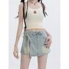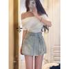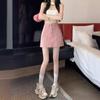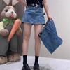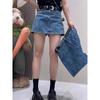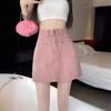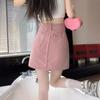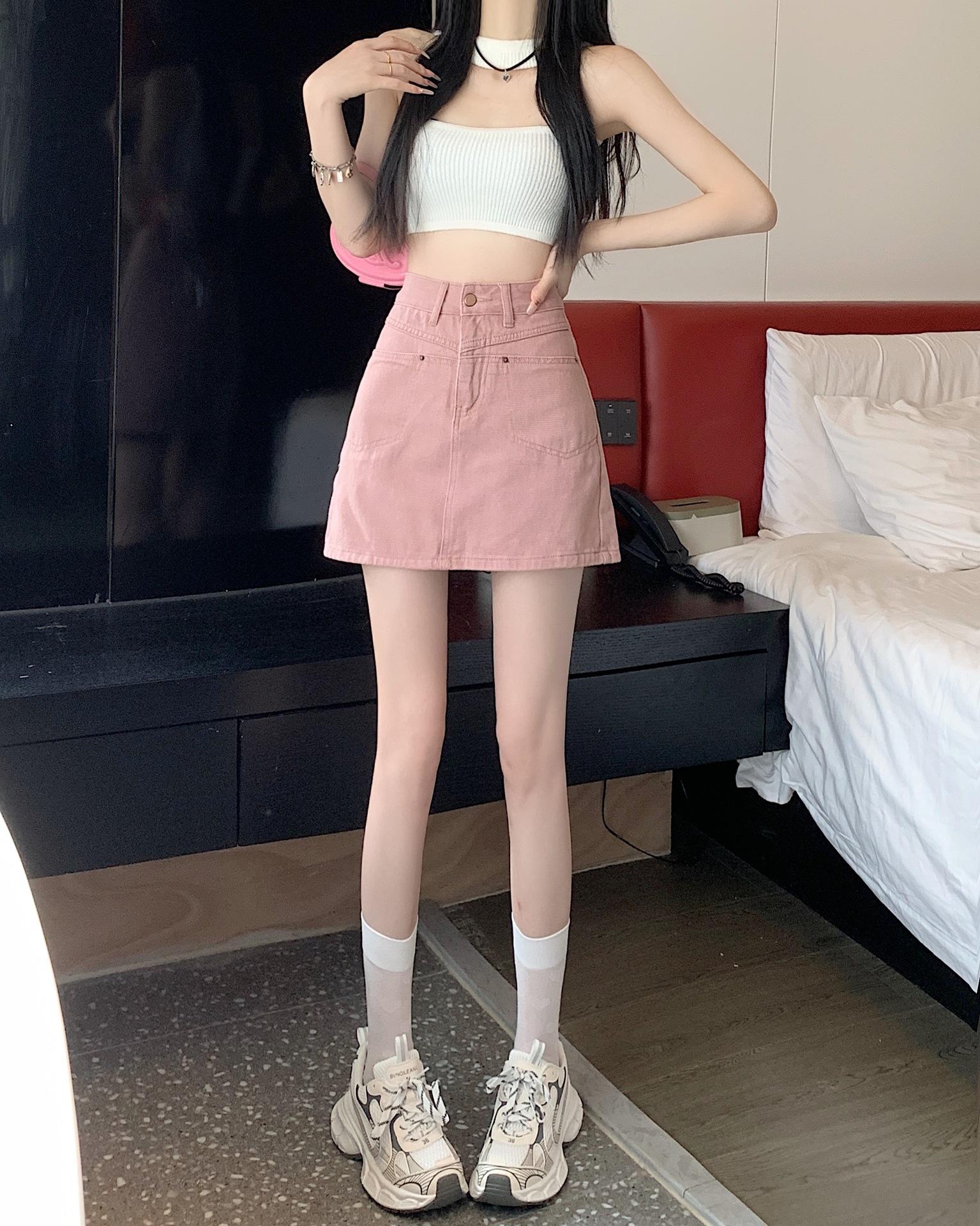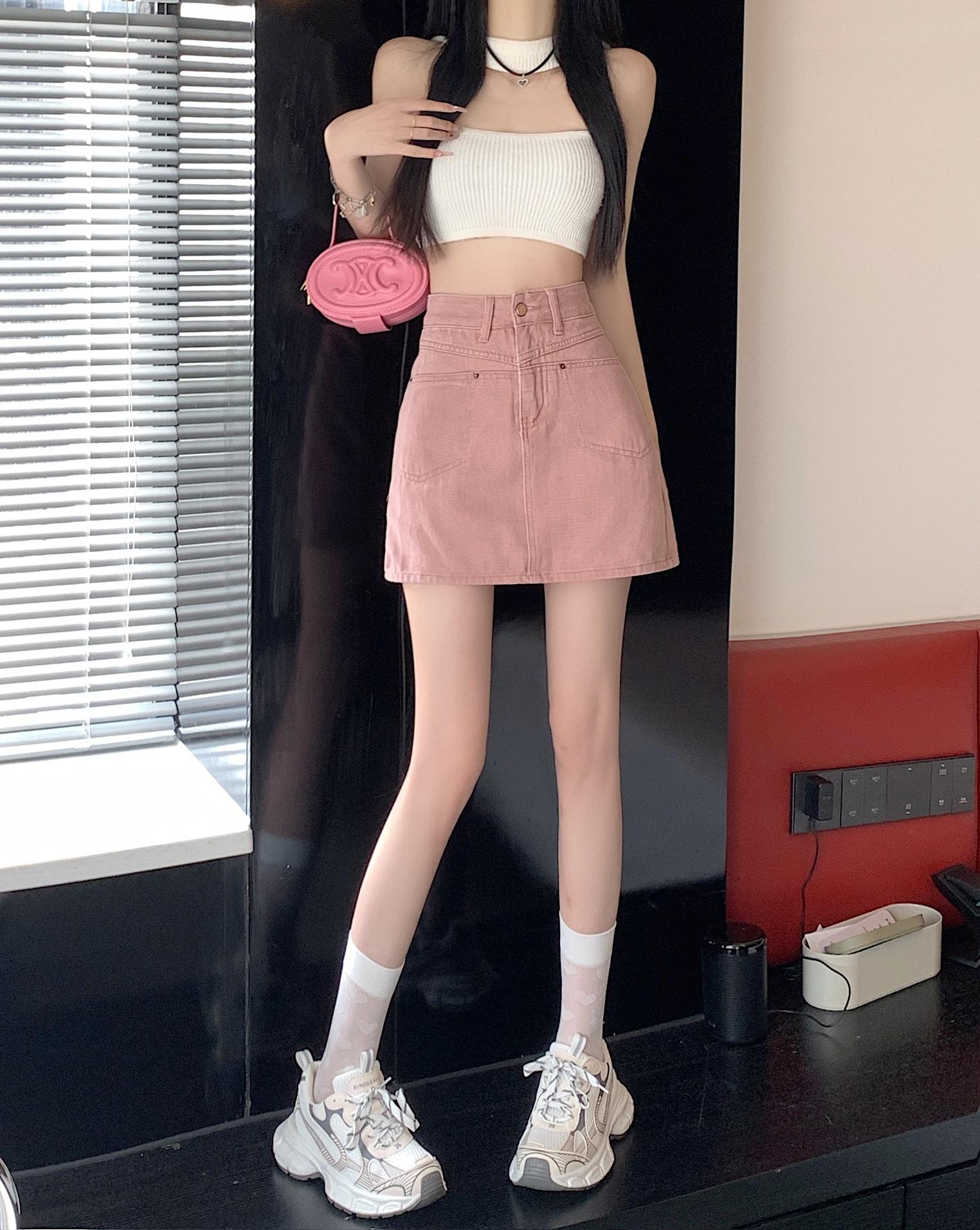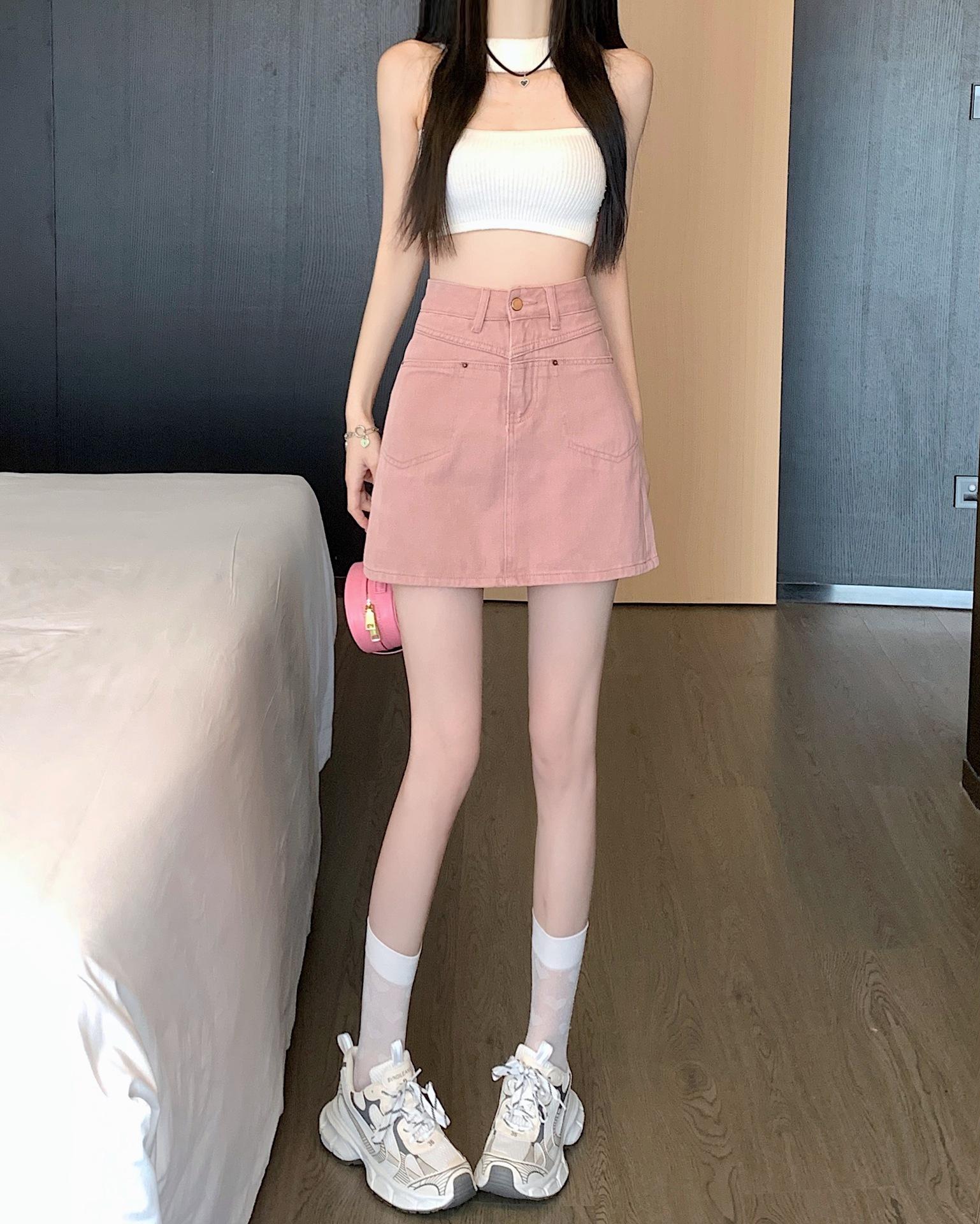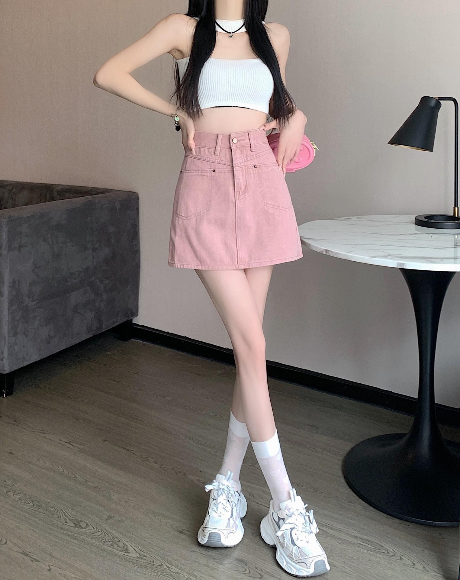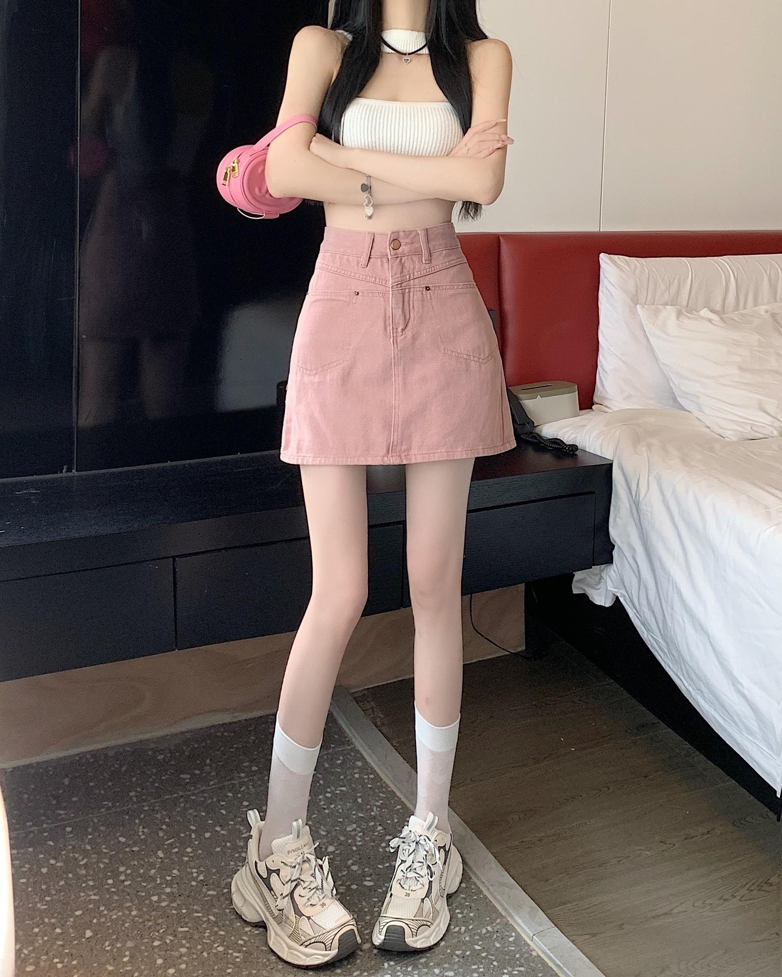 Falda de mezclilla rosa de talla grande para mujer en verano, gorda mm, cintura alta, aspecto adelgazante, chic, antiexposición, cubre caderas, falda corta acampanada