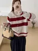 Suéter tipo cárdigan con solapa a rayas en contraste estilo coreano vintage para mujer, abrigo holgado de punto pequeño estilo perezoso para otoño e invierno.
