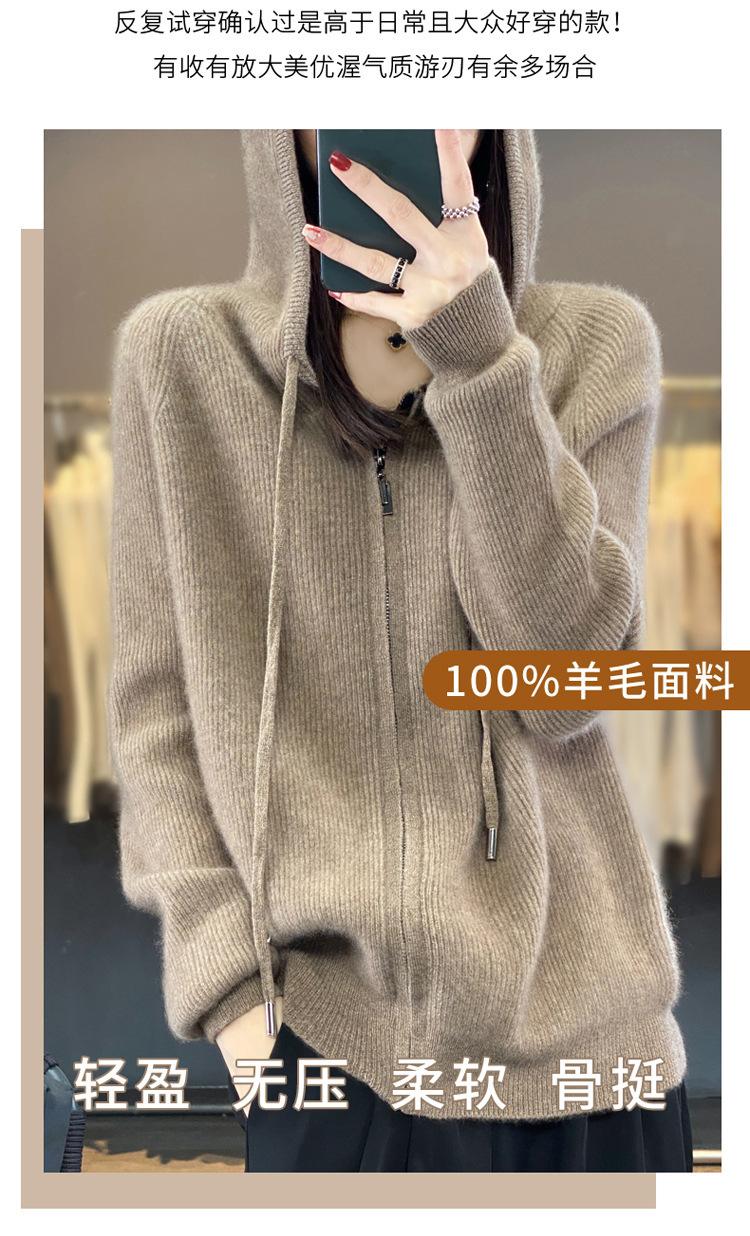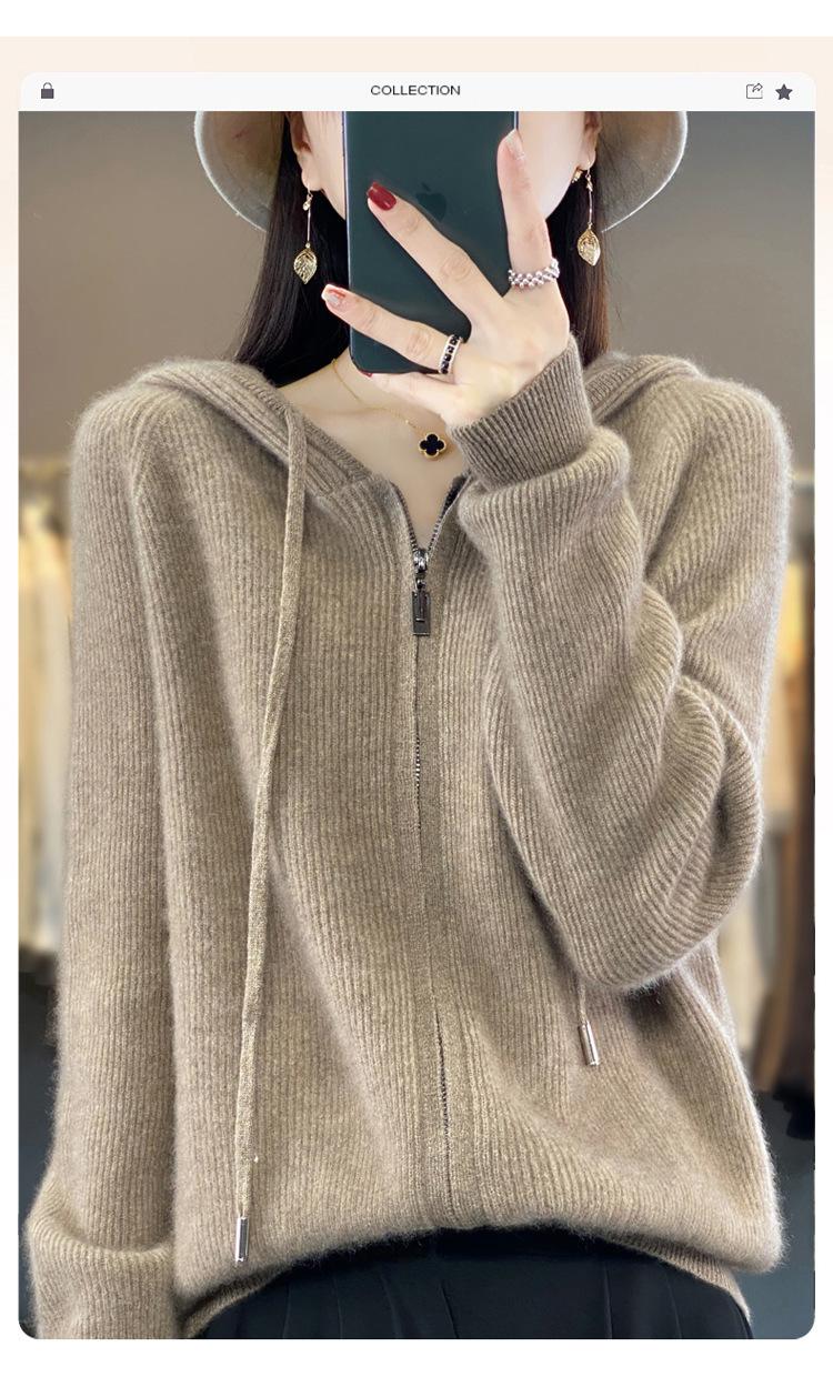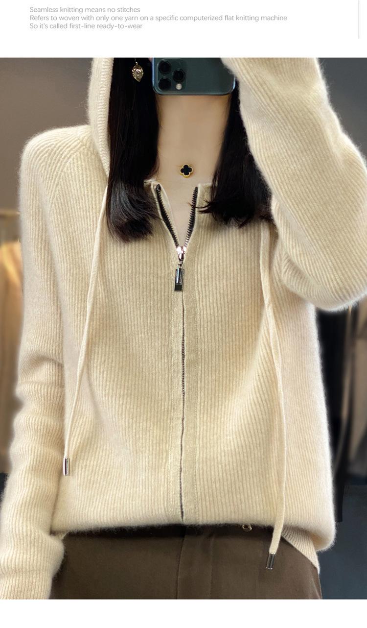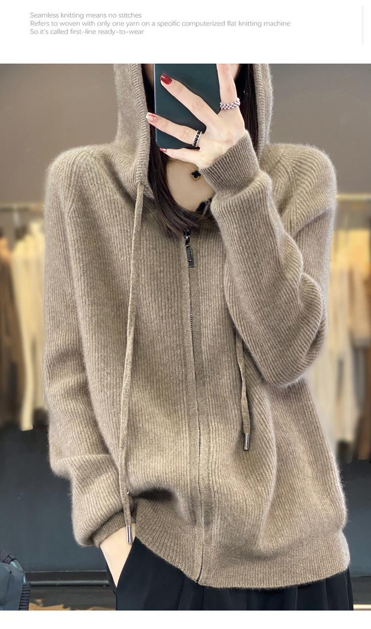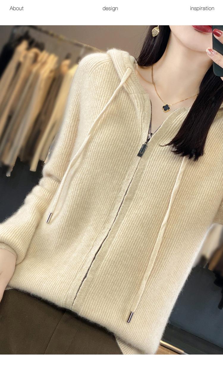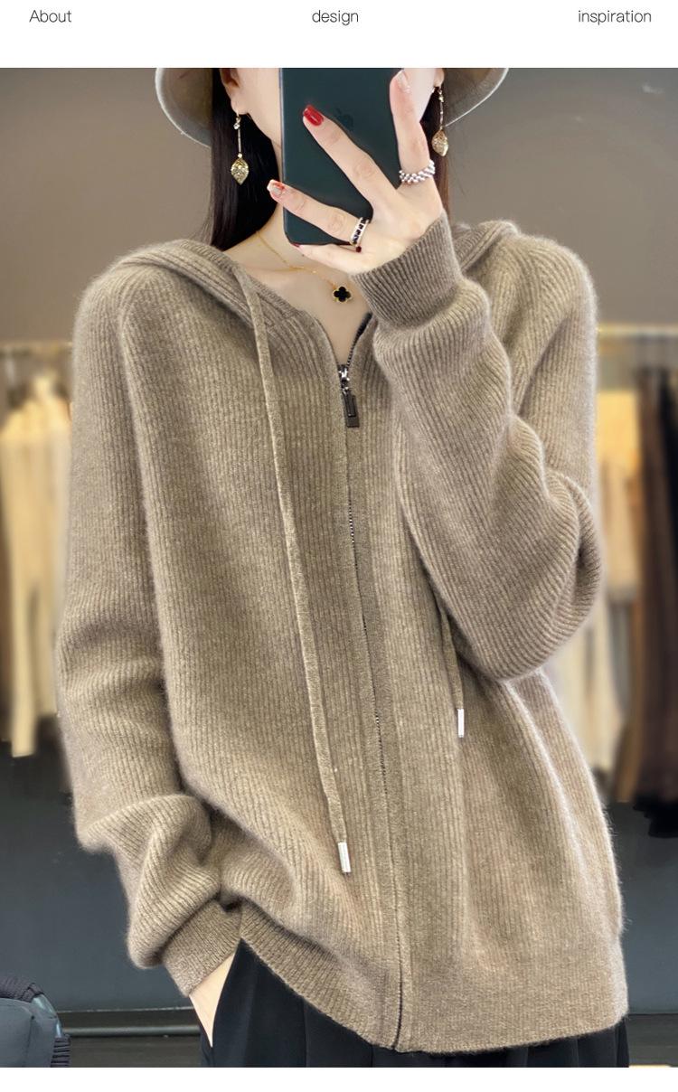 Cárdigan de lana nueva para otoño e invierno, suéter de punto con base de lana 100% pura para mujer, suéter de lana con capucha antiedad y cordón ajustable.