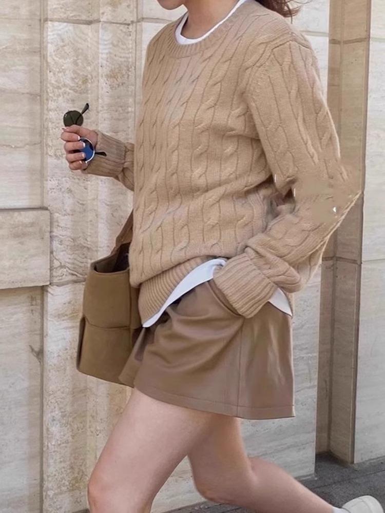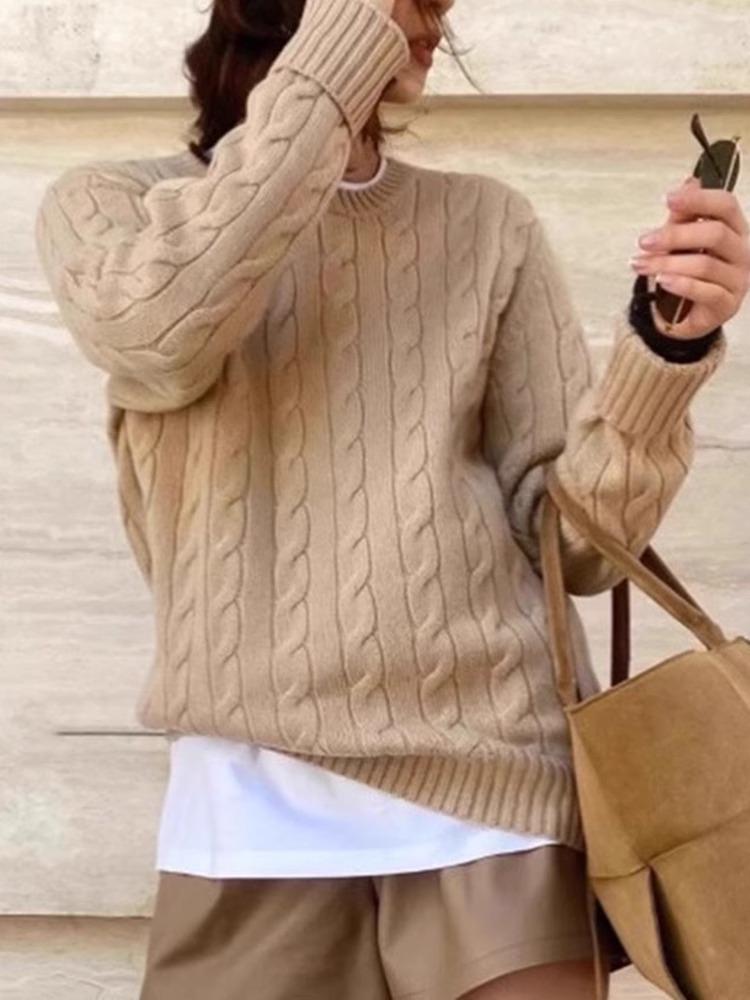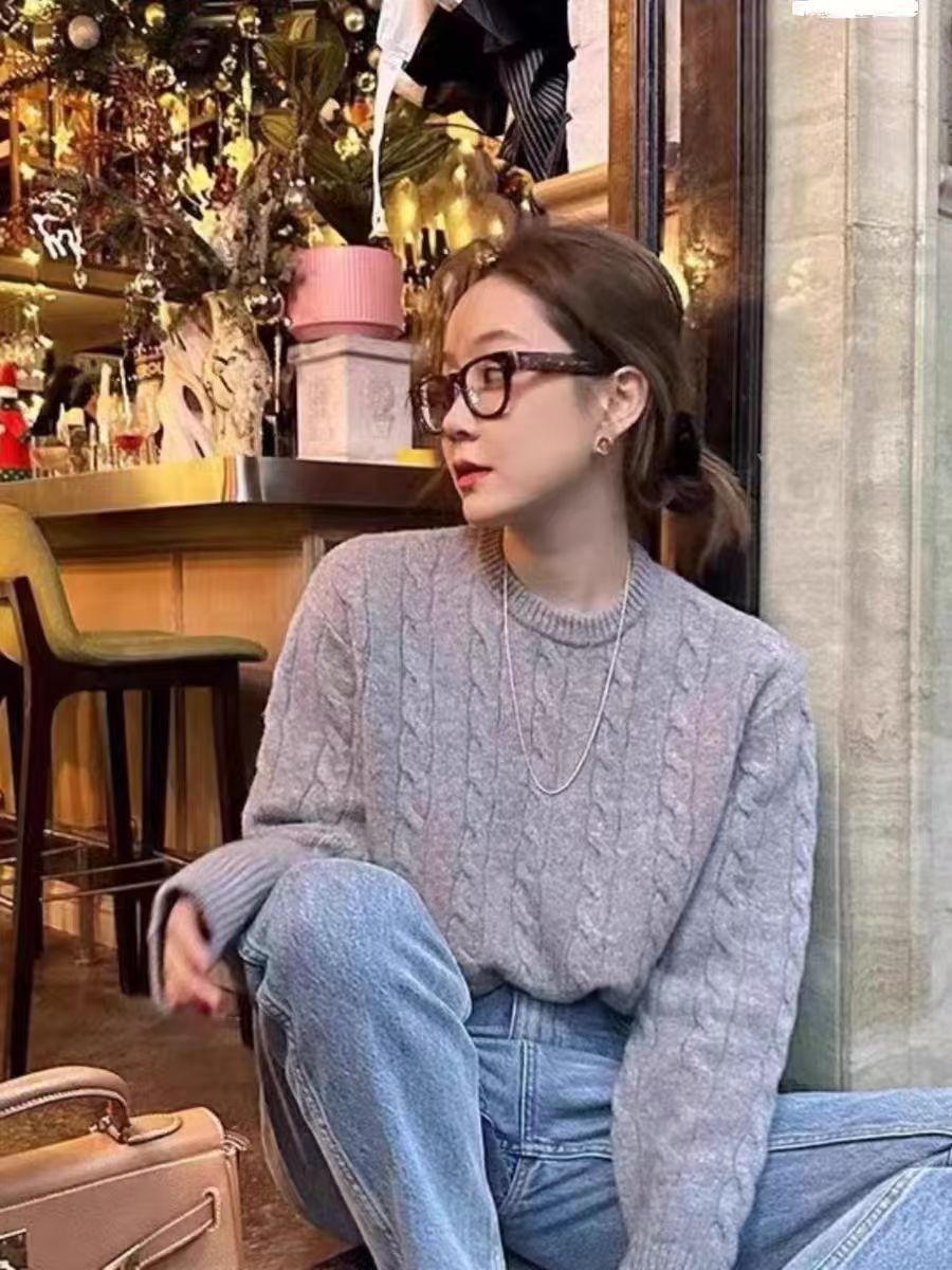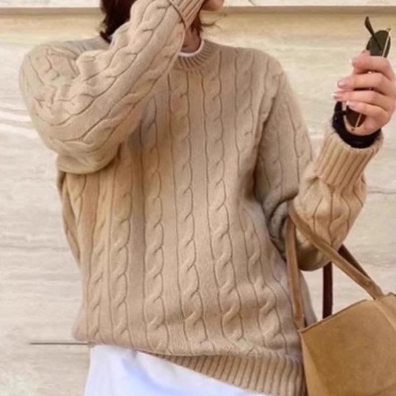 Suéter de punto de lana pura gruesa con cuello redondo y color sólido para mujer, camisa adelgazante holgada, otoño e invierno, nuevo