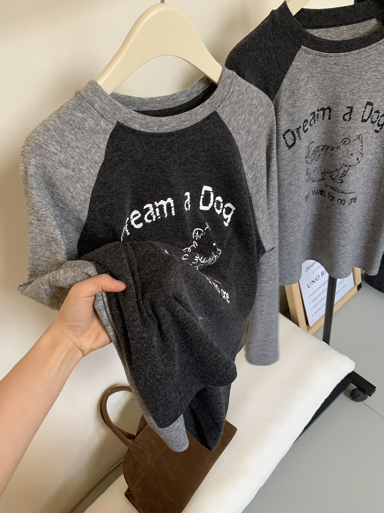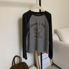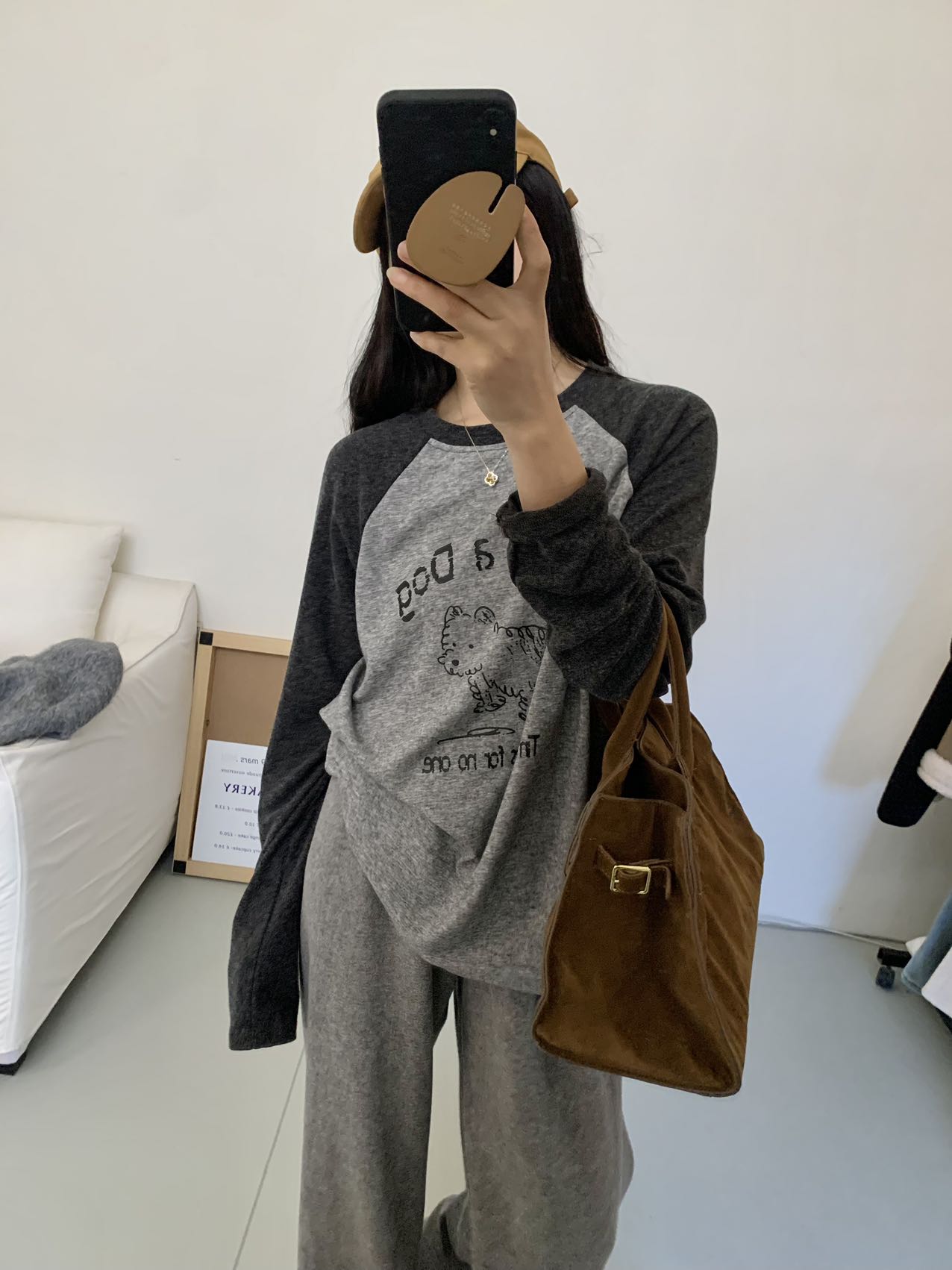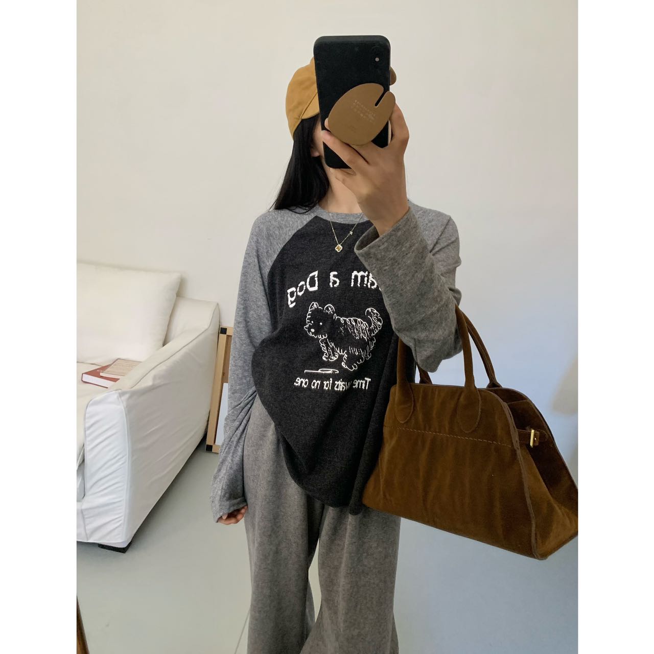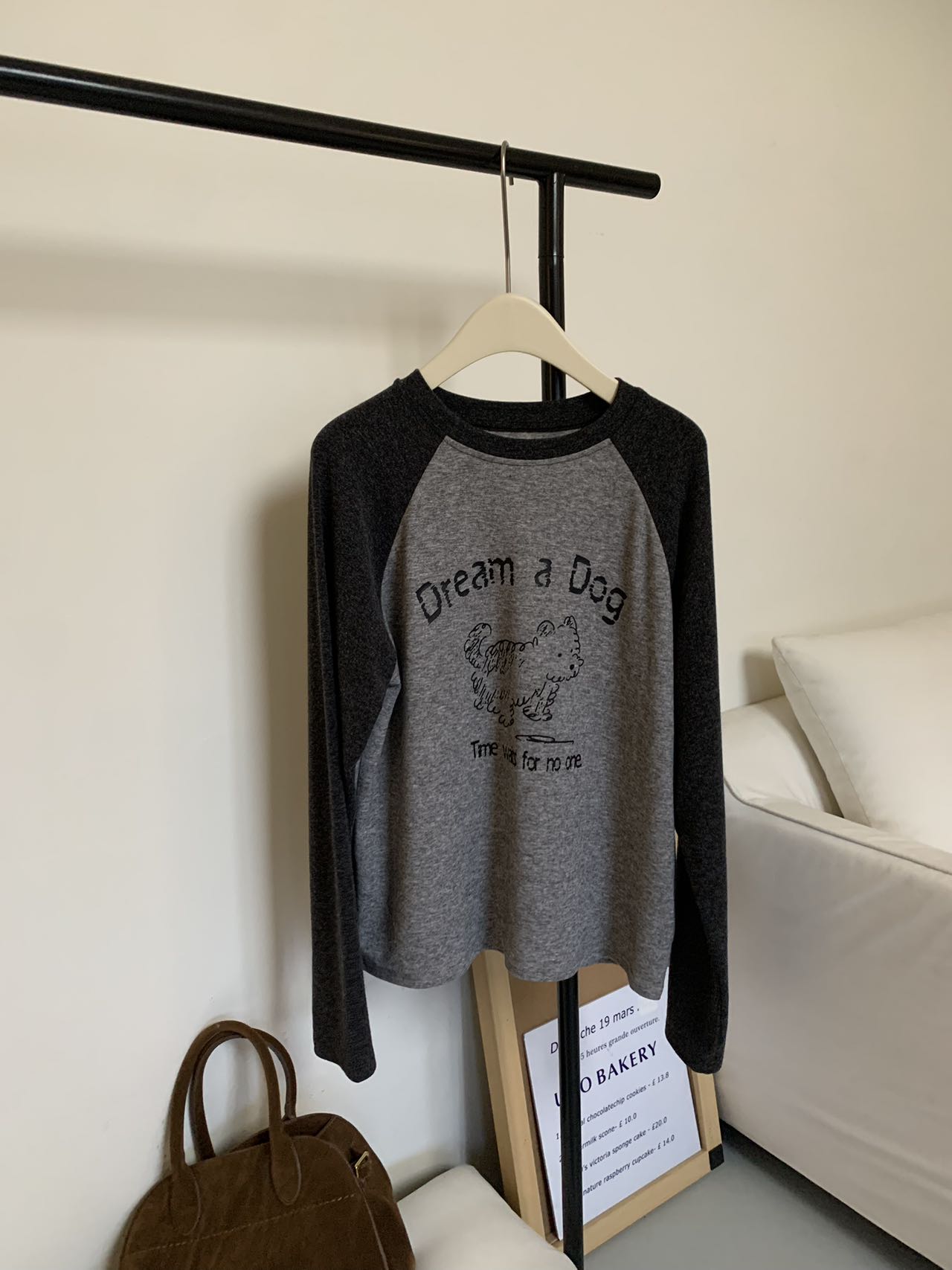Otoño e Invierno 2024 Nueva Moda Coreana Cuello Redondo Manga Raglán Combinación de Colores Reductor de Edad Holgado Versátil Camiseta de Manga Larga Top
