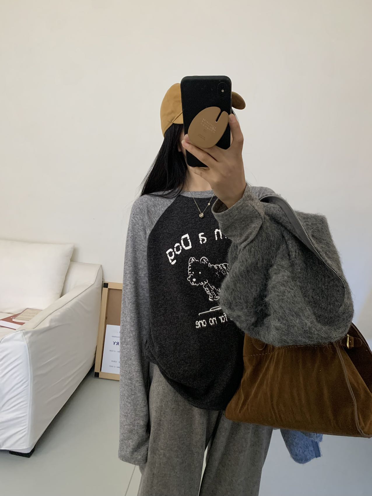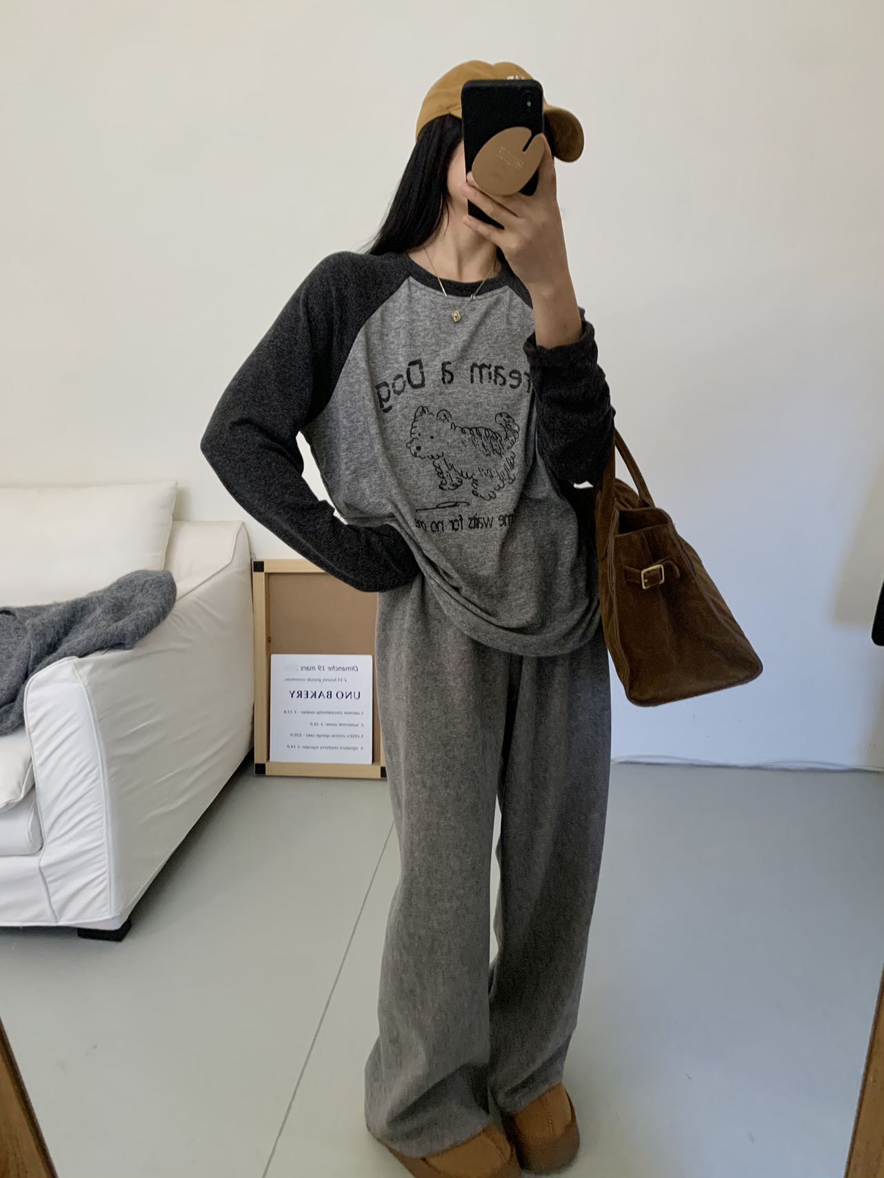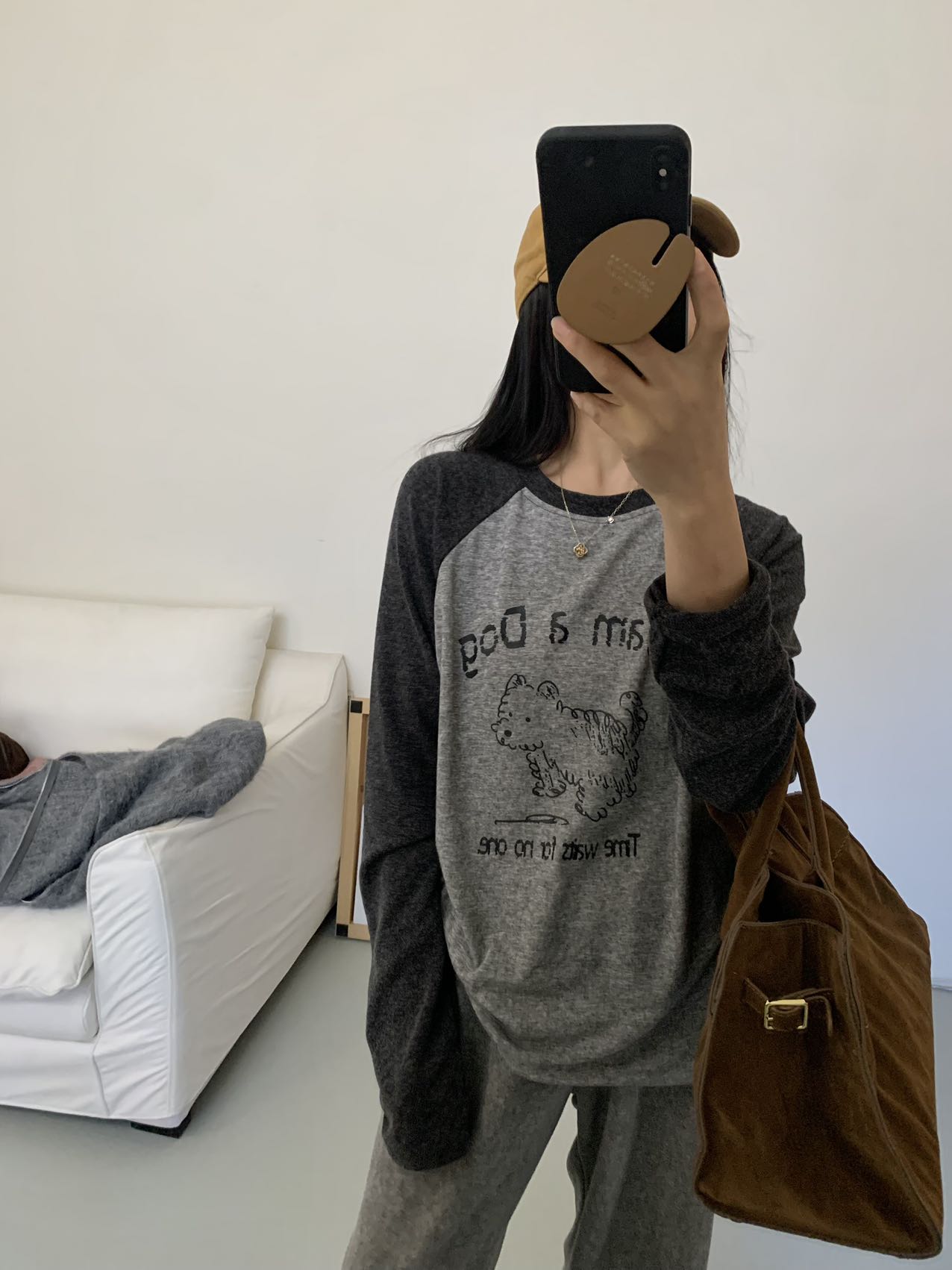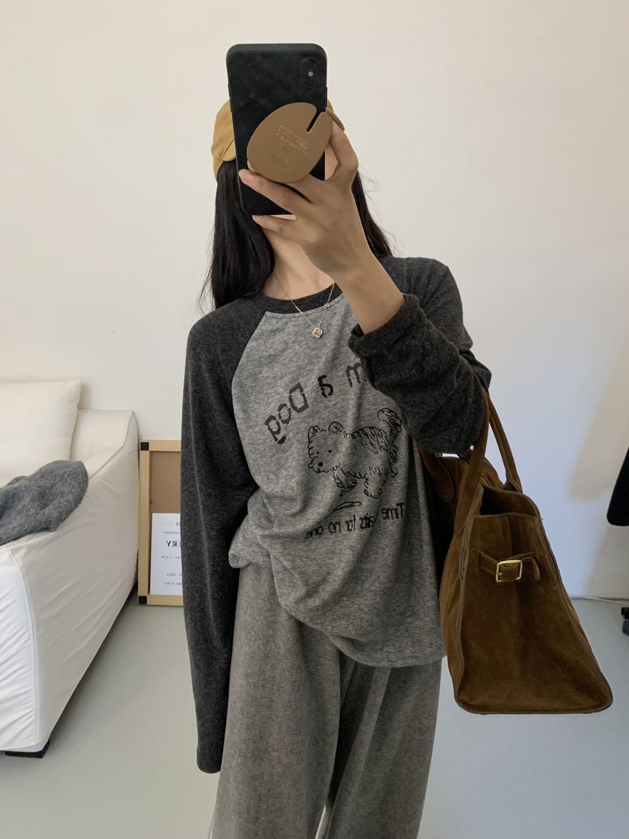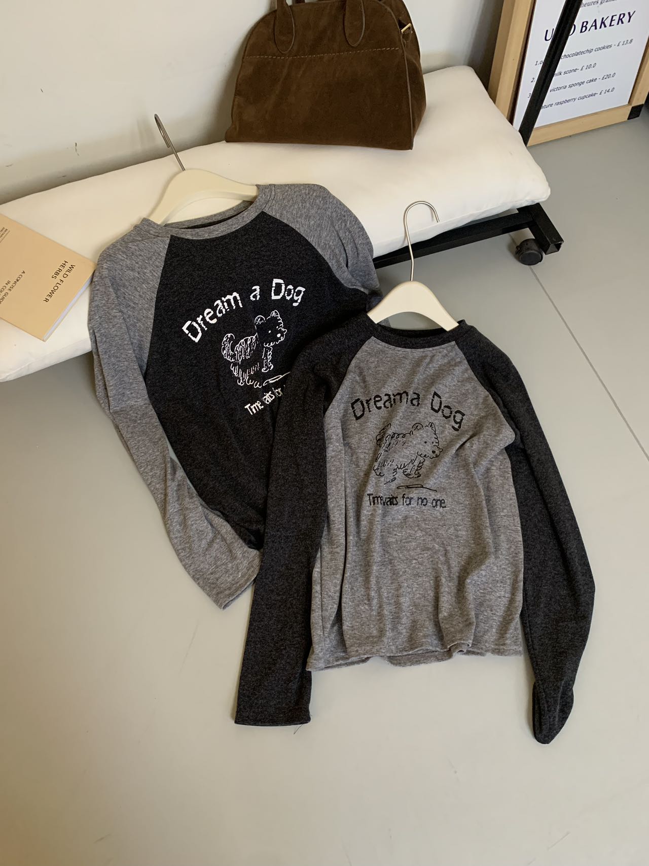 Otoño e Invierno 2024 Nueva Moda Coreana Cuello Redondo Manga Raglán Combinación de Colores Reductor de Edad Holgado Versátil Camiseta de Manga Larga Top