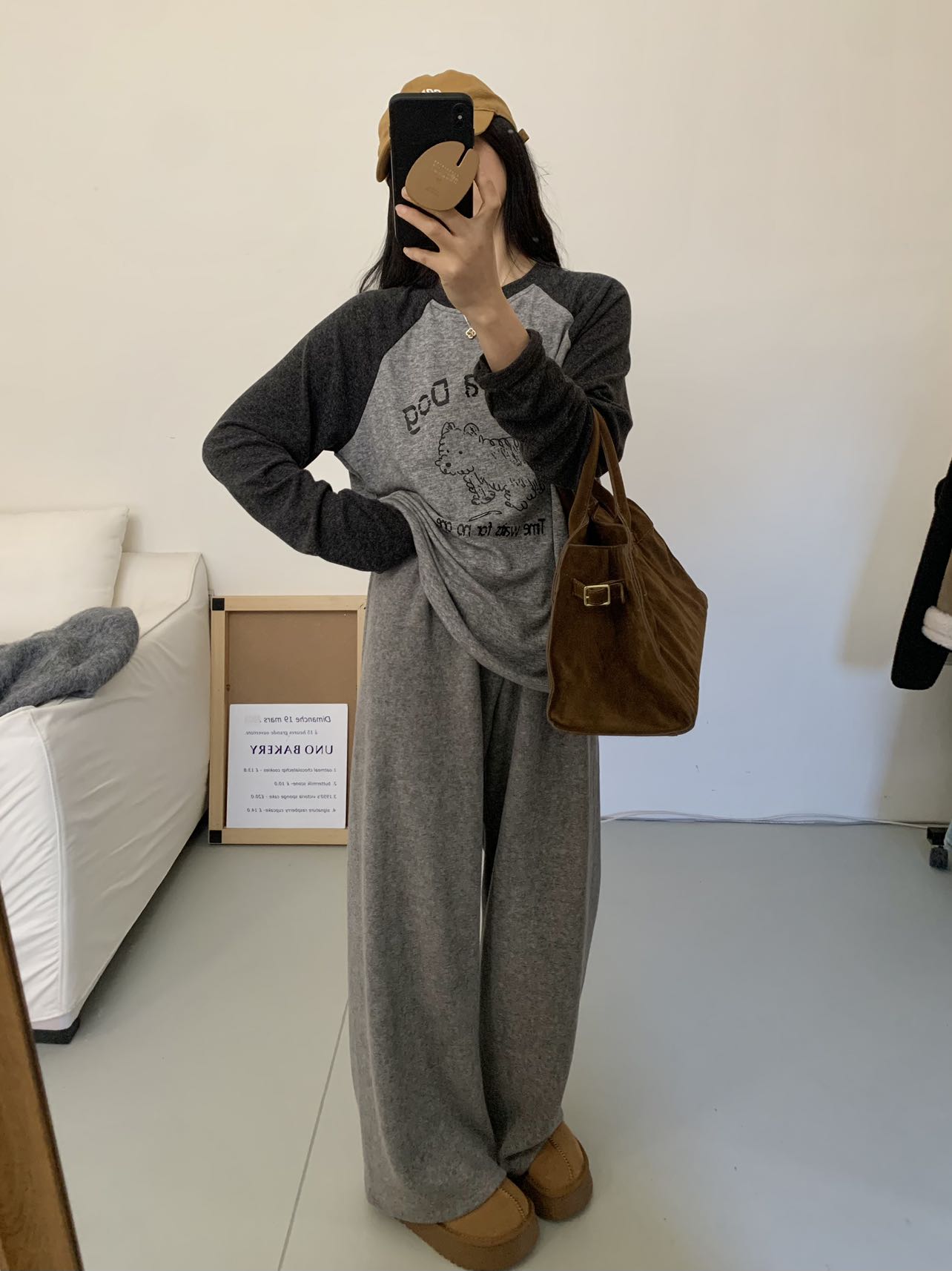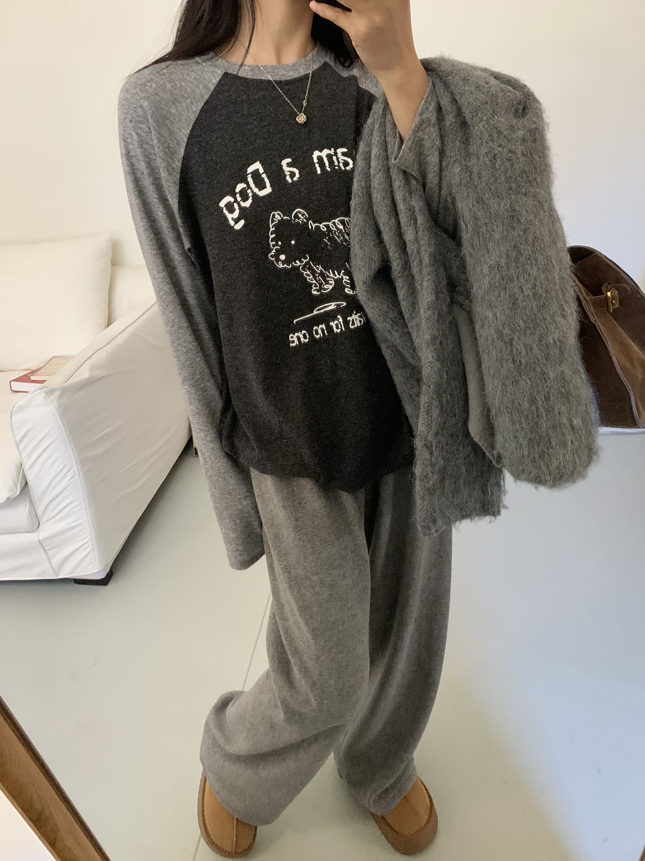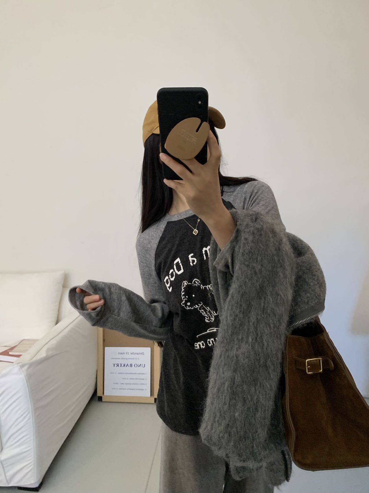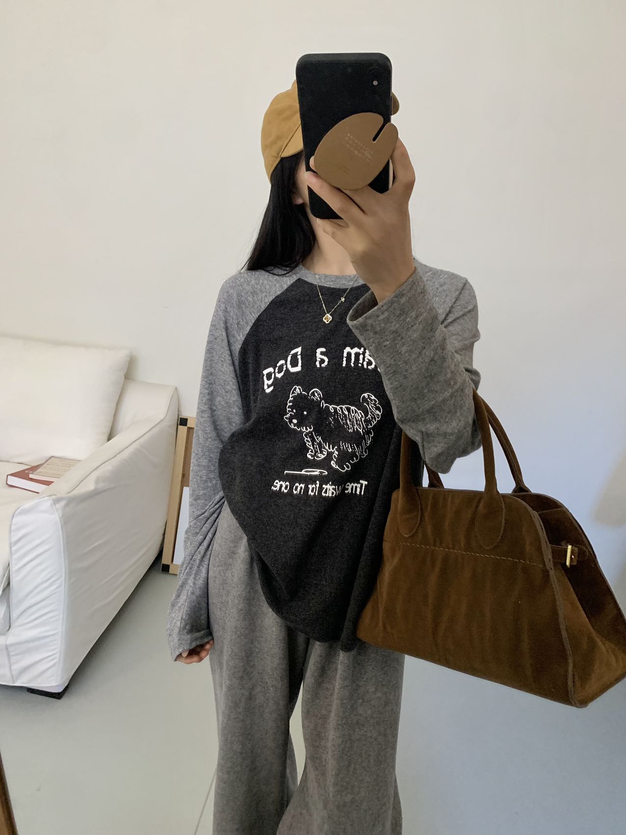 Otoño e Invierno 2024 Nueva Moda Coreana Cuello Redondo Manga Raglán Combinación de Colores Reductor de Edad Holgado Versátil Camiseta de Manga Larga Top