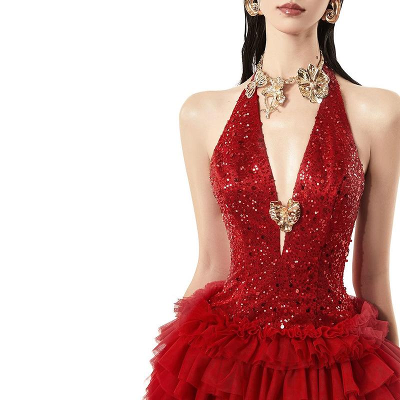 2024 estilo europeo y americano transfronterizo otoño e invierno nuevo vestido de mujer de color sólido ajustado de cintura alta moda callejera cuello espalda descubierta