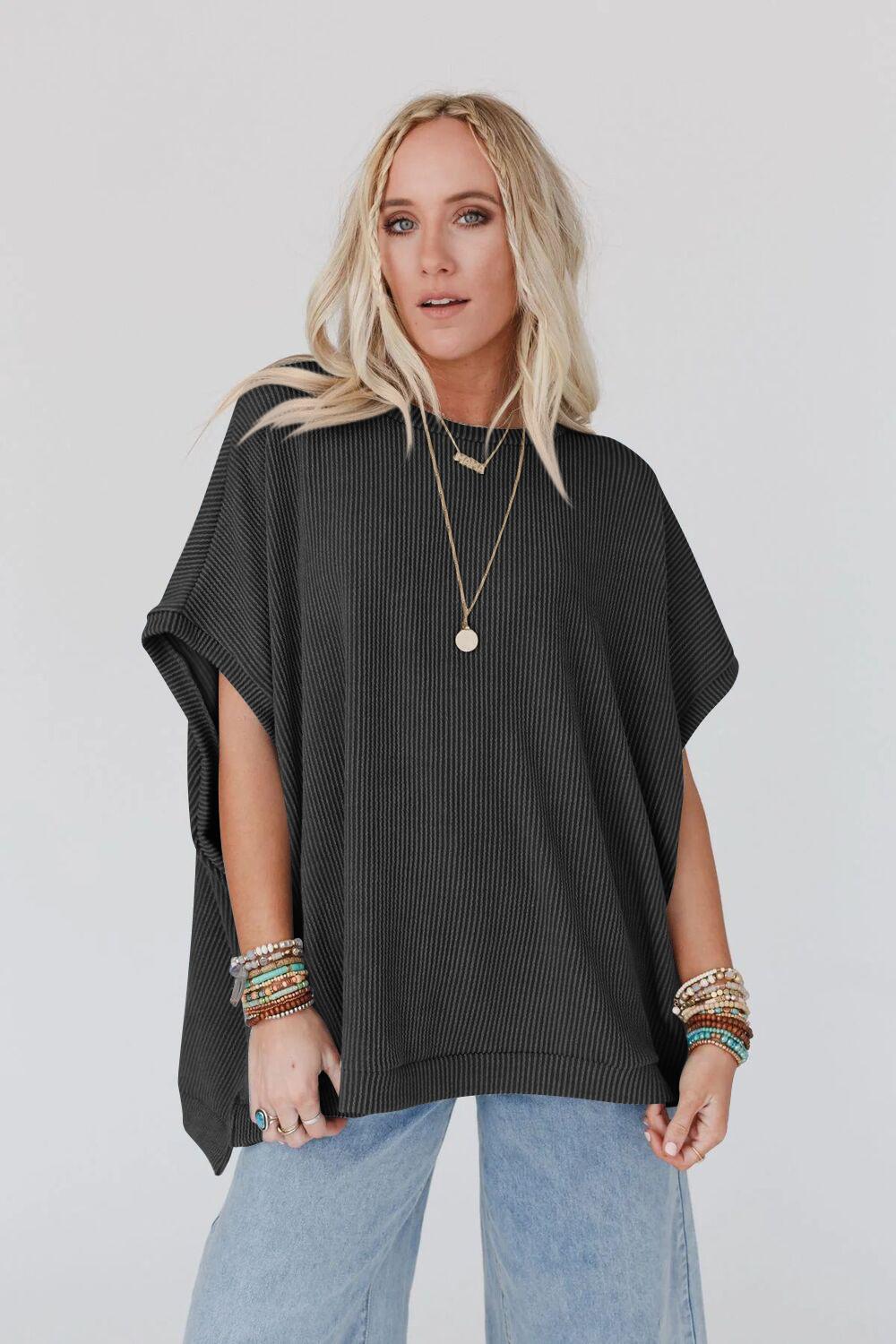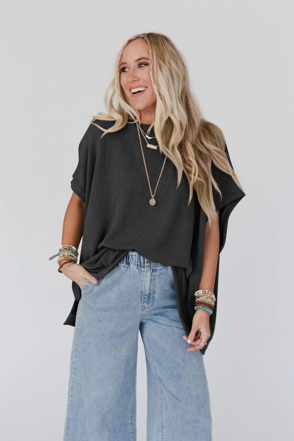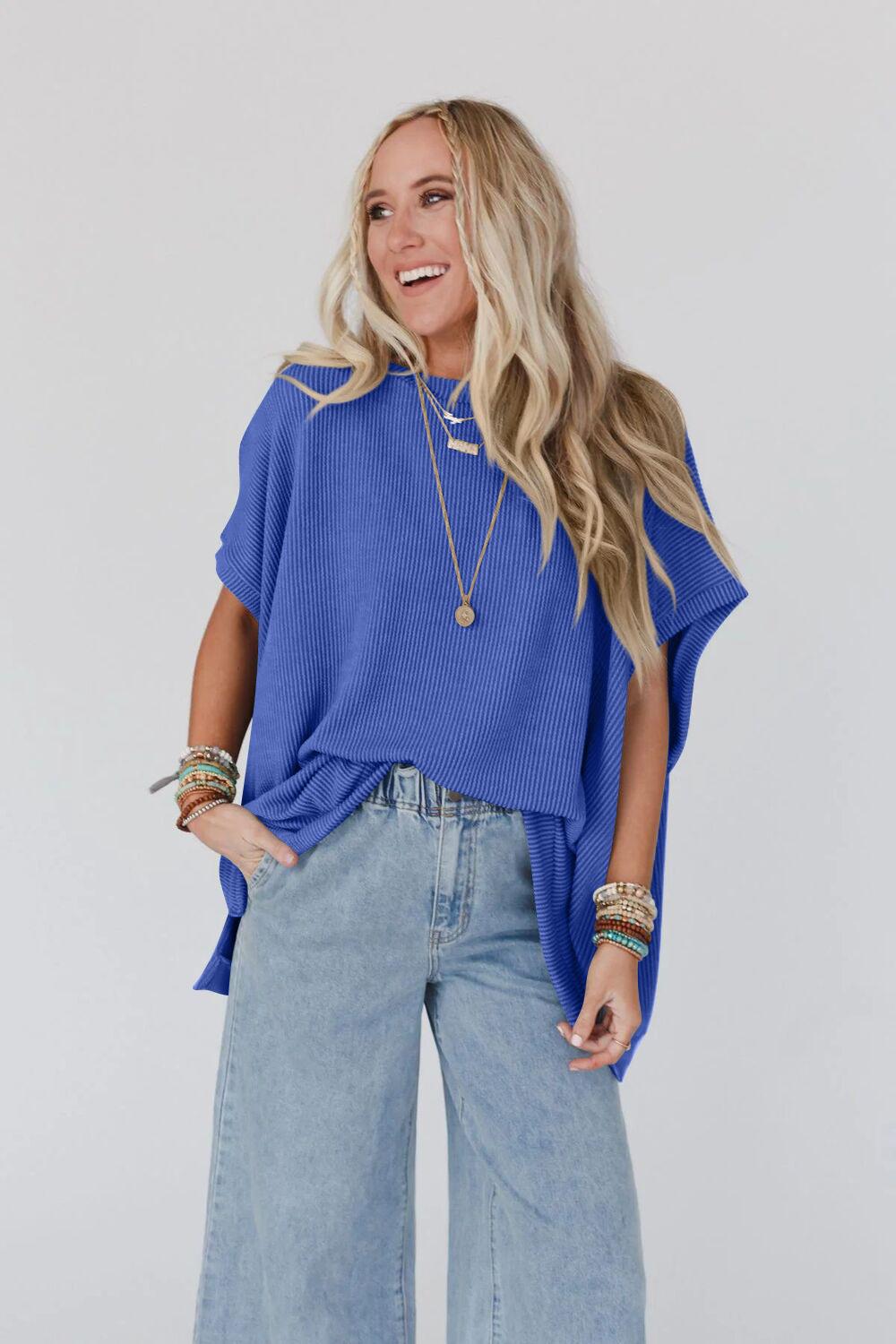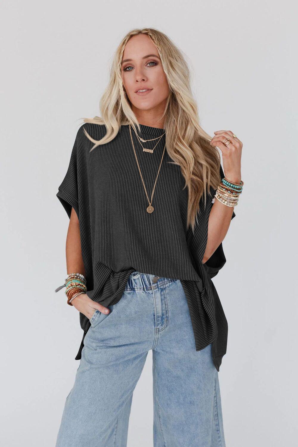 Camiseta de verano TK2025 de punto de color liso con cuello redondo y mangas murciélago para mujer, ropa transfronteriza europea y americana.
