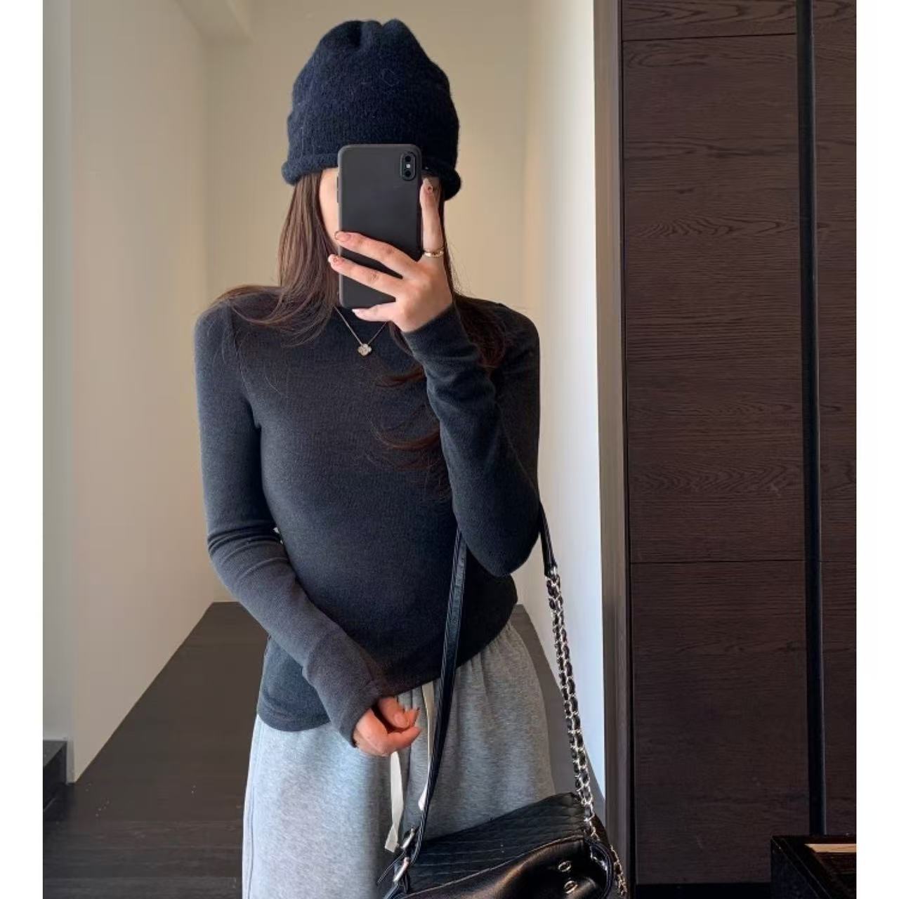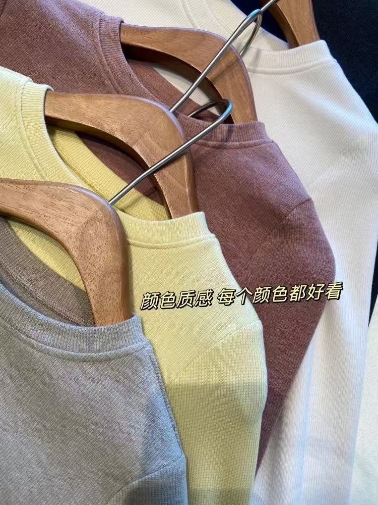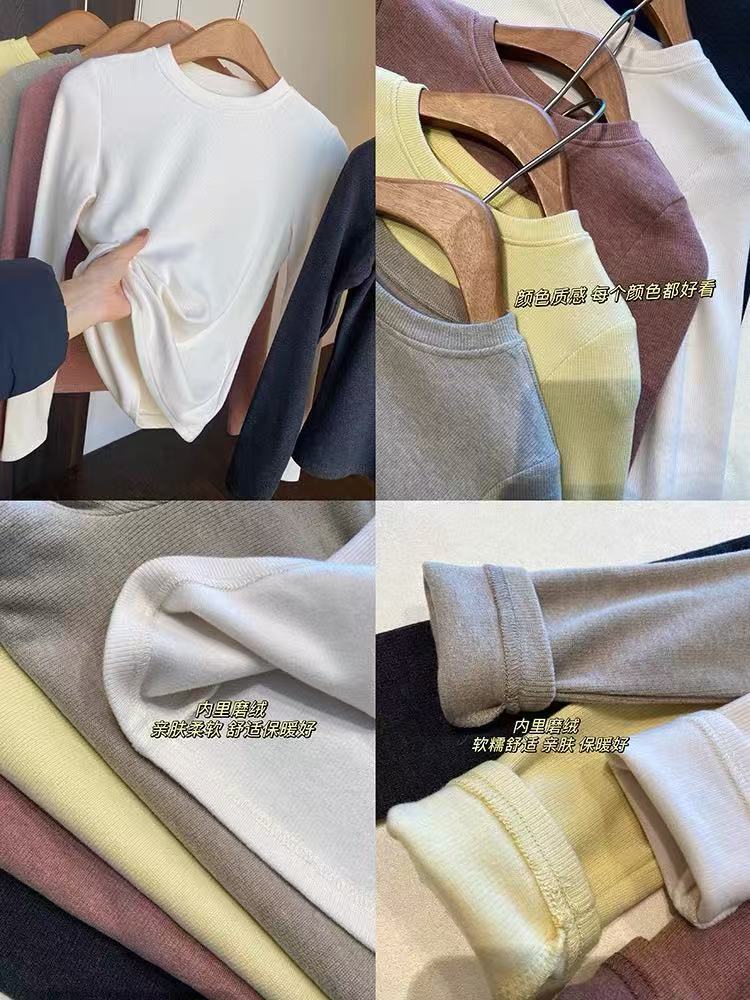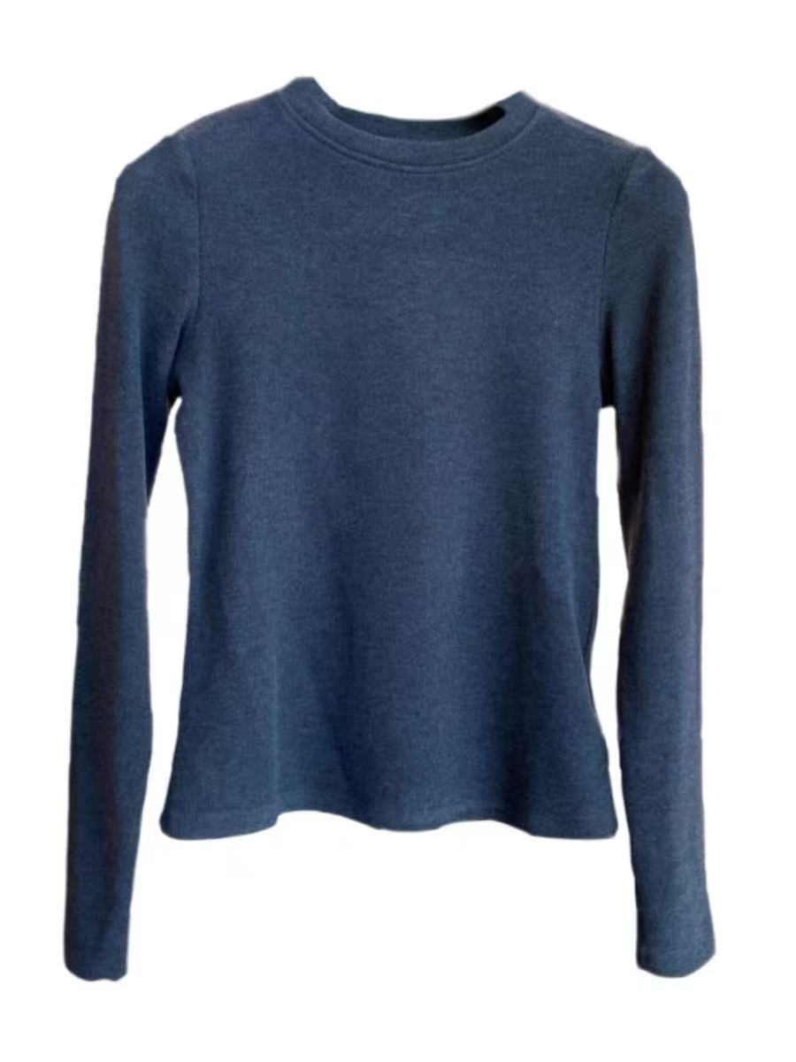 ¡Camiseta básica de manga larga con cuello redondo acanalado vertical de muselina cepillada de doble cara!
