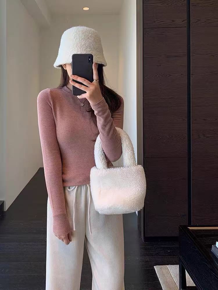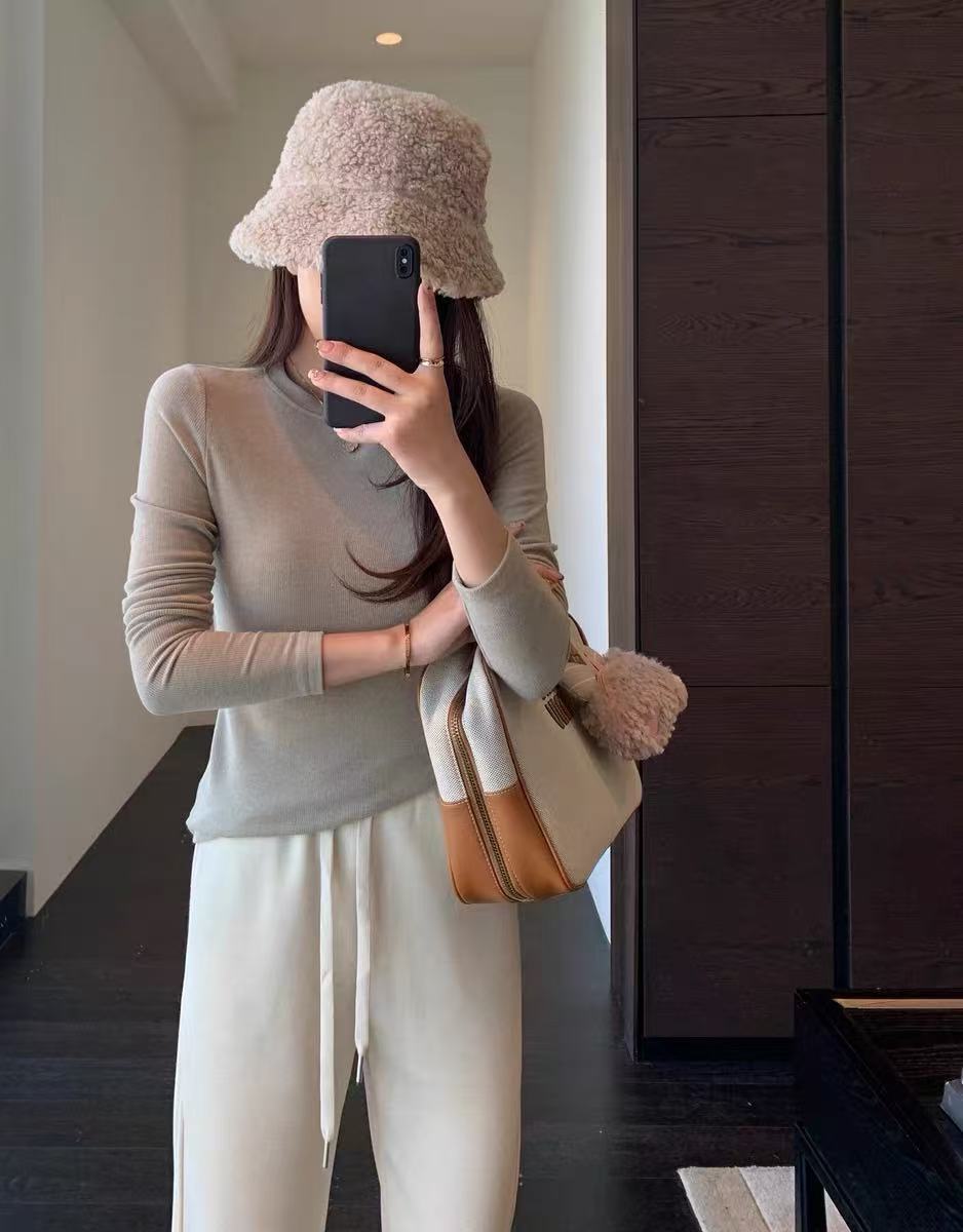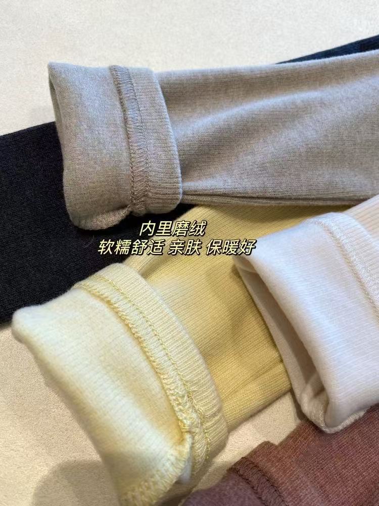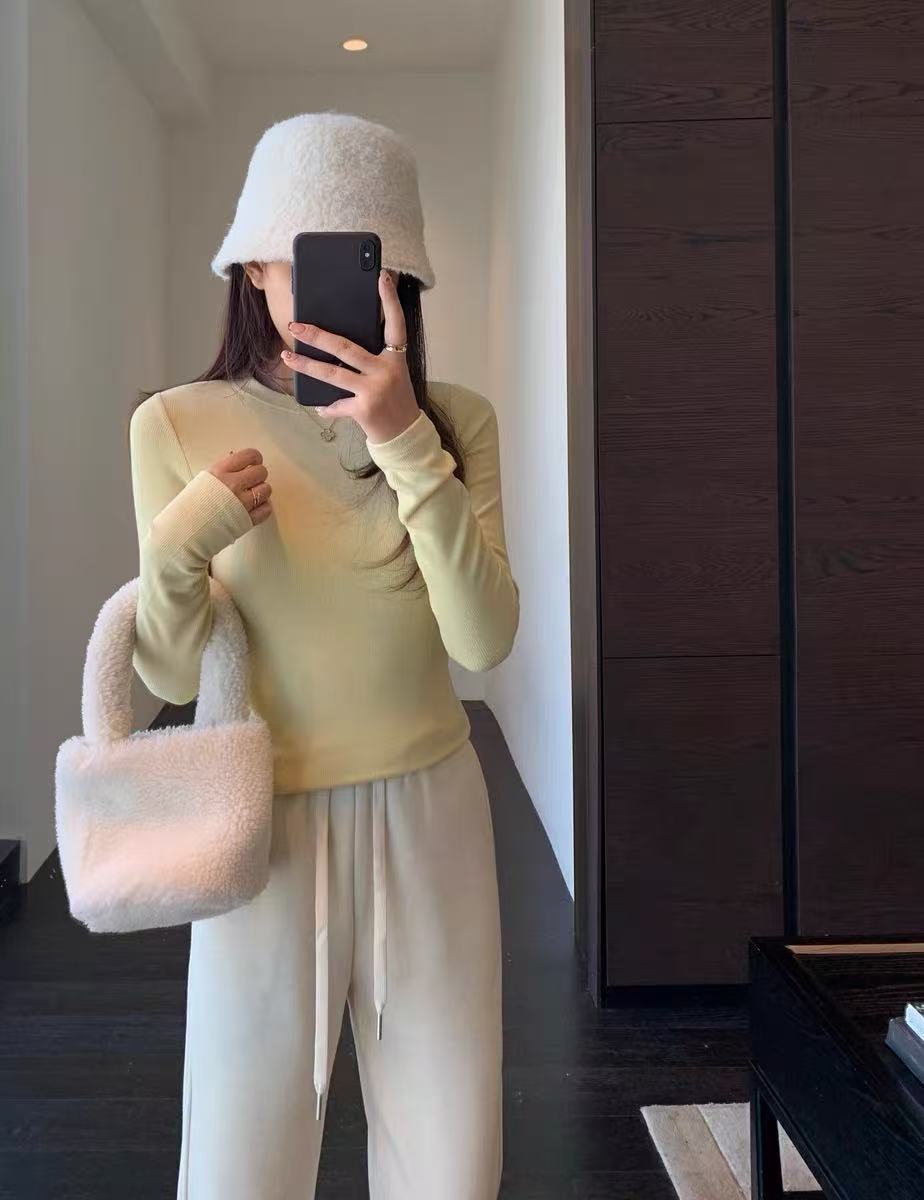 ¡Camiseta básica de manga larga con cuello redondo acanalado vertical de muselina cepillada de doble cara!