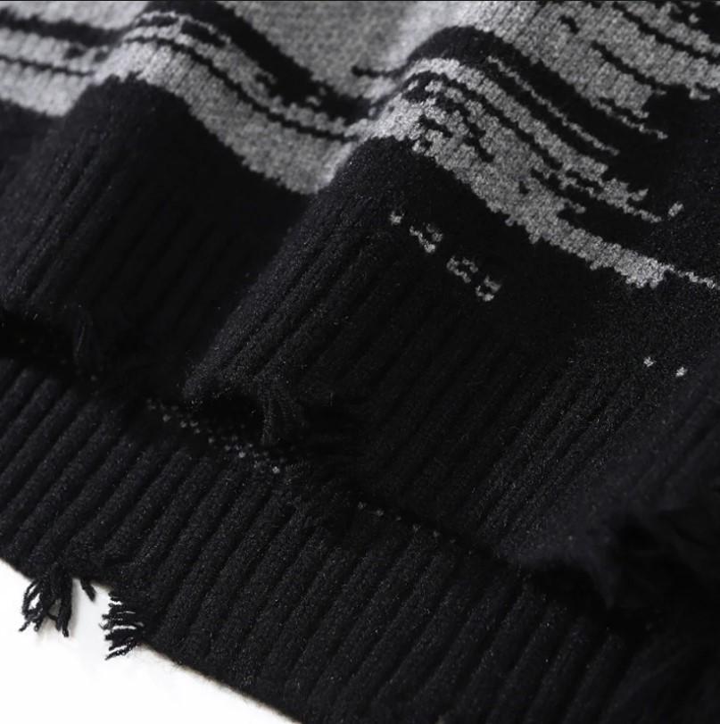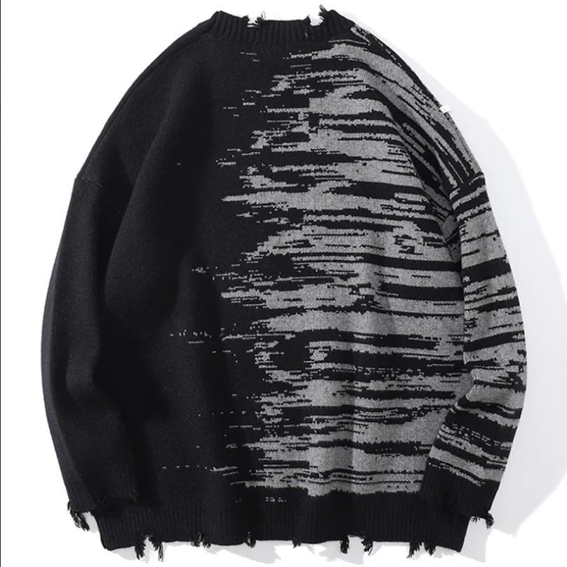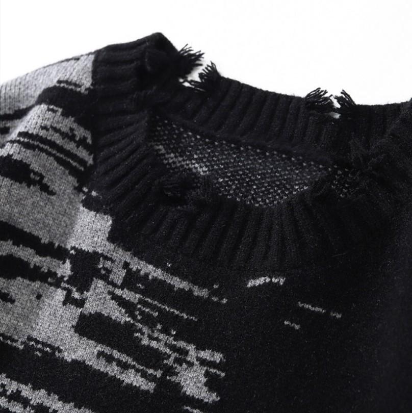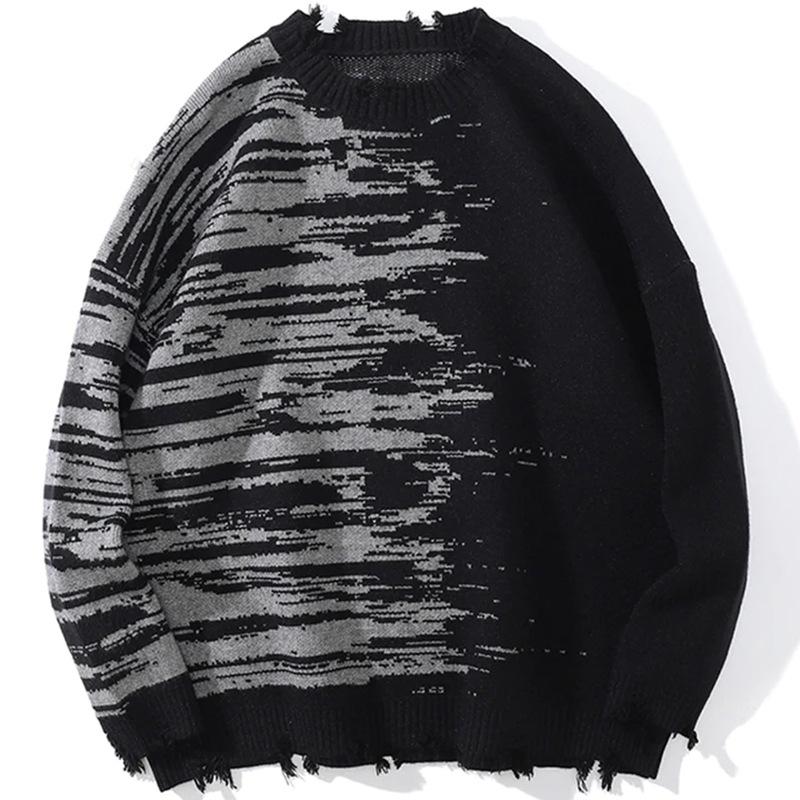 Suéteres Europeos y Americanos de Calle Hip-Hop con Personalidad y Sentido del Diseño, Tejido de Punto con Costuras Degradadas Gris-Negro, Cuello Redondo, Rotos y Holgados para Hombre y Mujer
