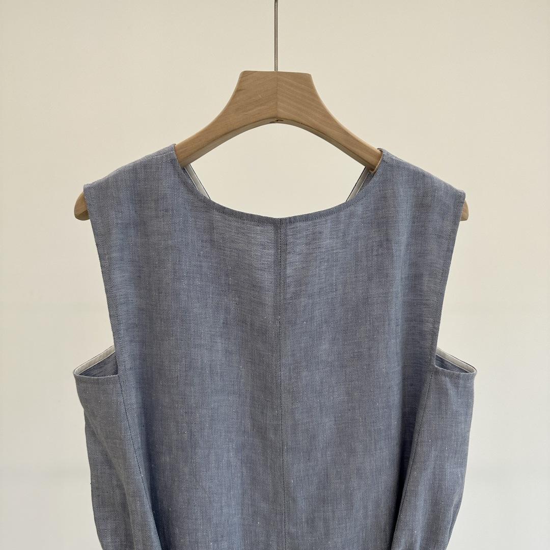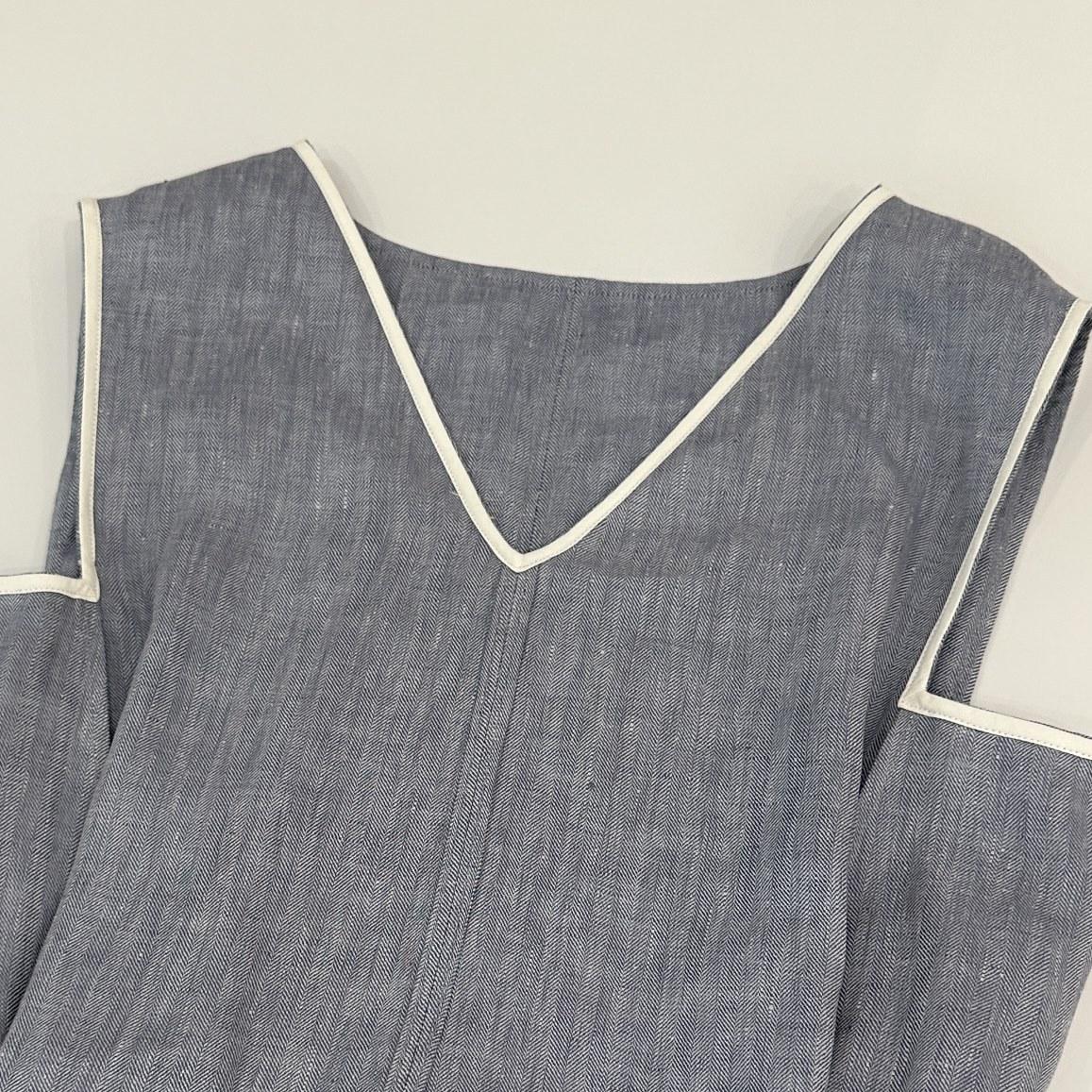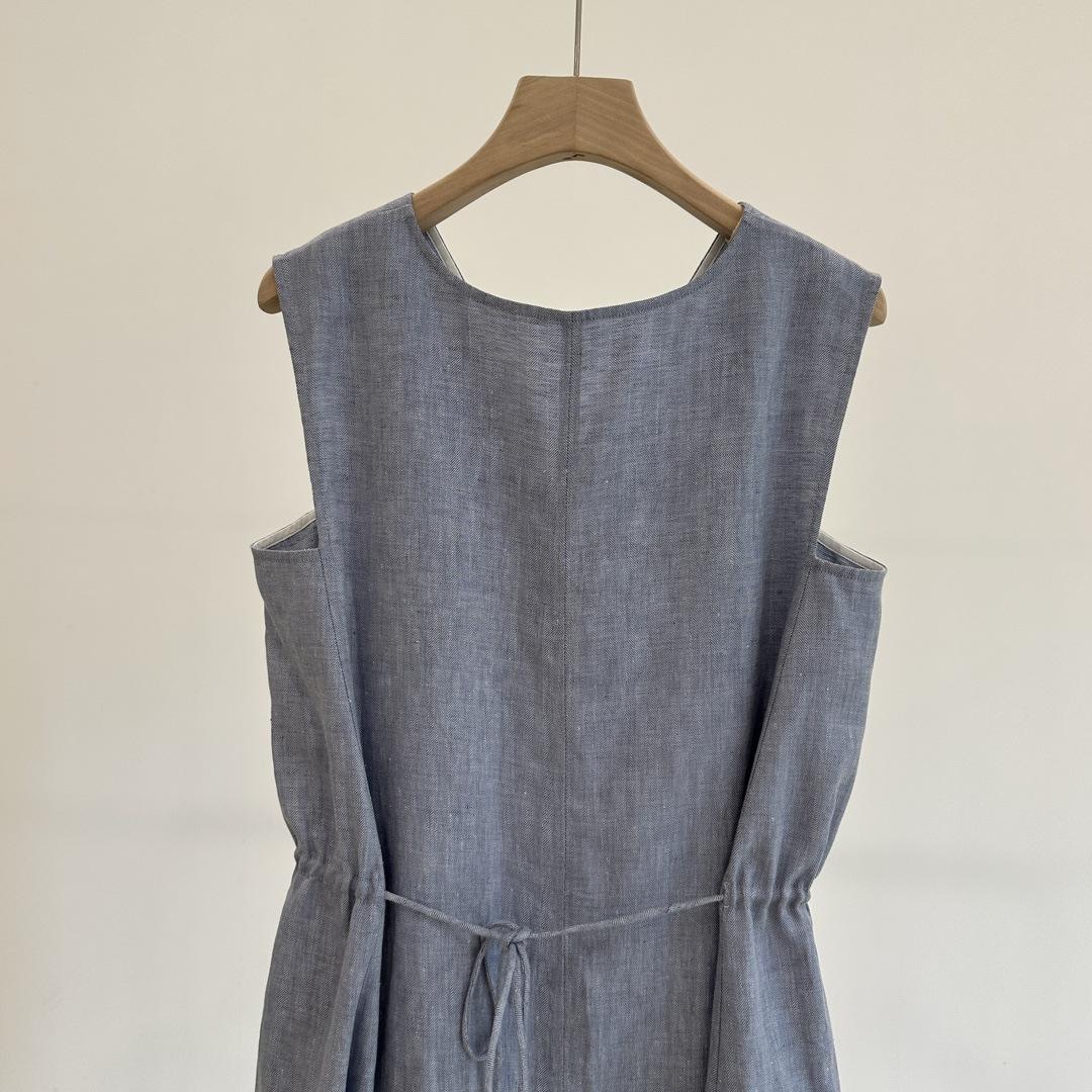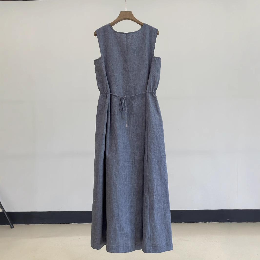 Vestido clásico de lino con escote en V y chaleco francés azul sin mangas