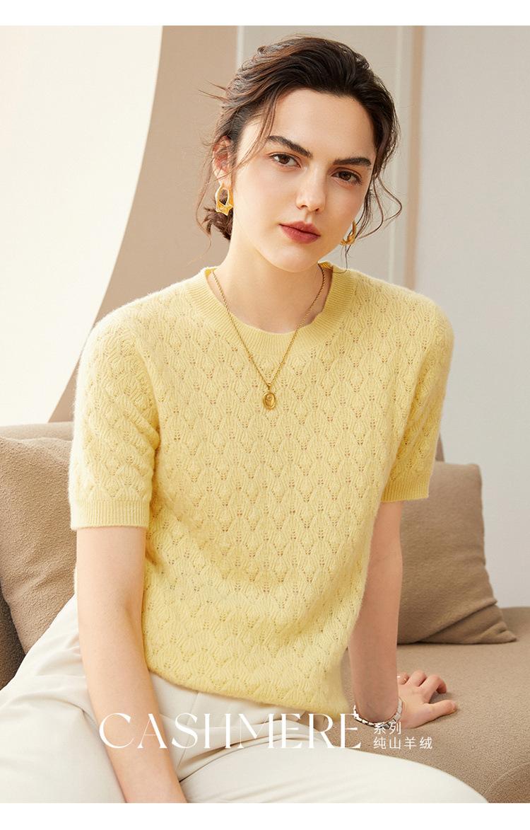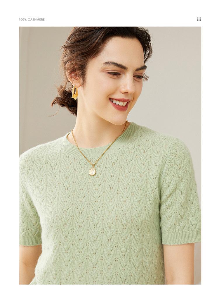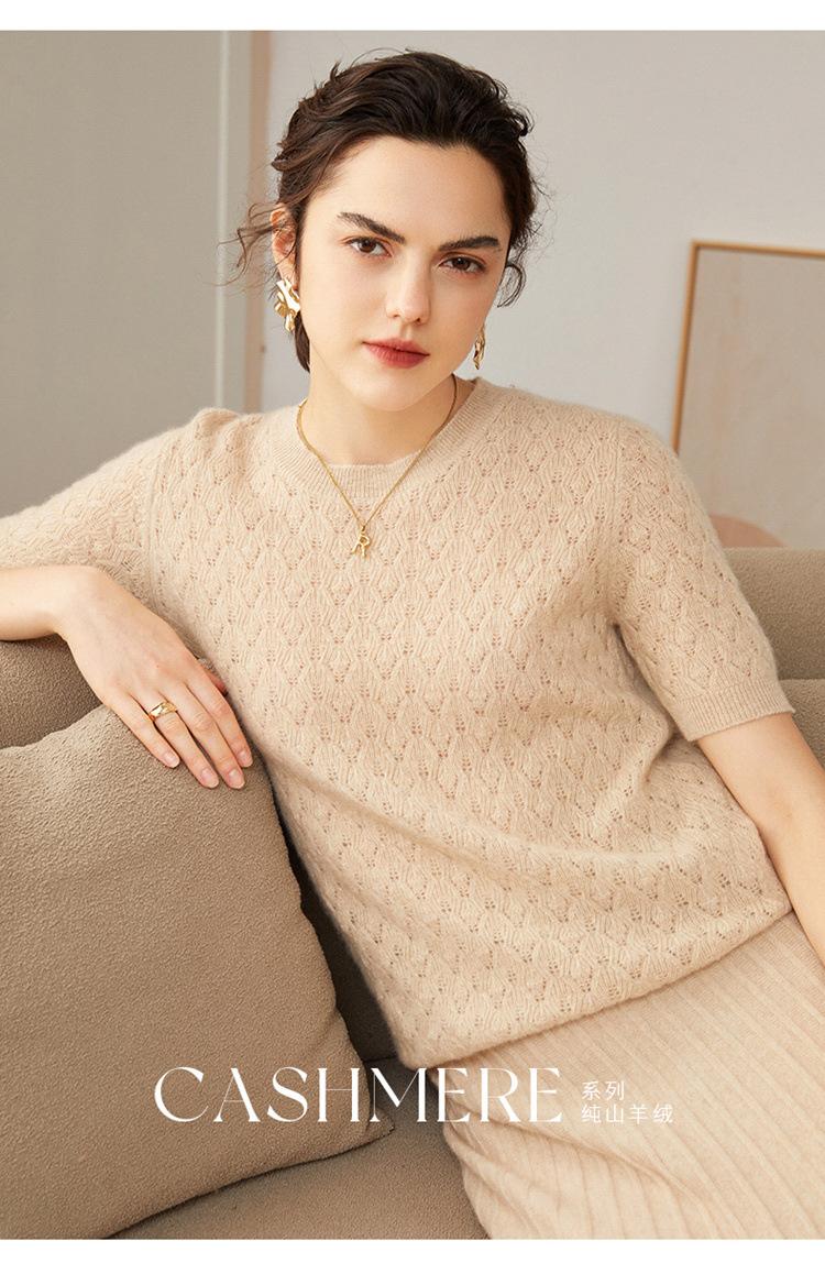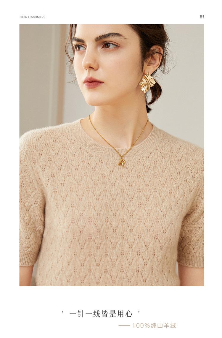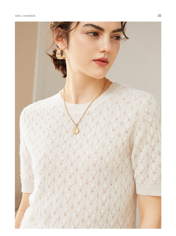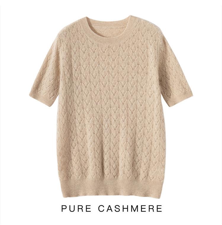 Suéter de cachemira para mujer, manga corta, 100% cachemira pura, primavera y otoño, nuevo, cuello redondo, jersey hueco, suéter de punto, manga corta
