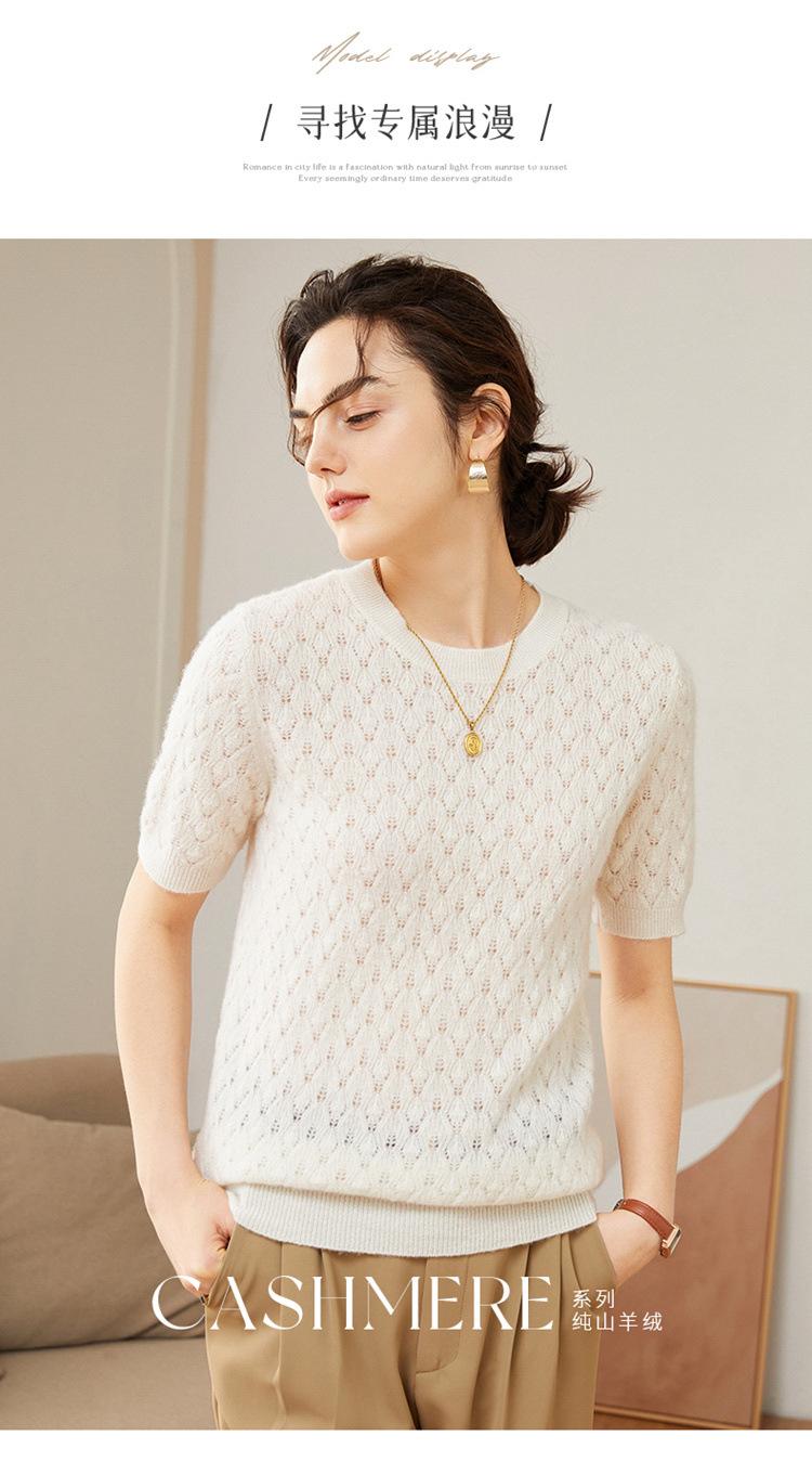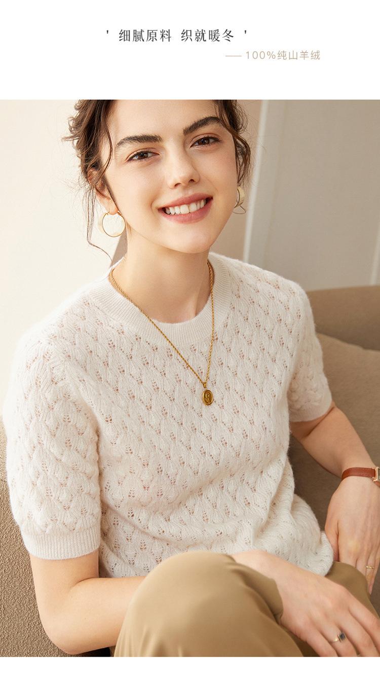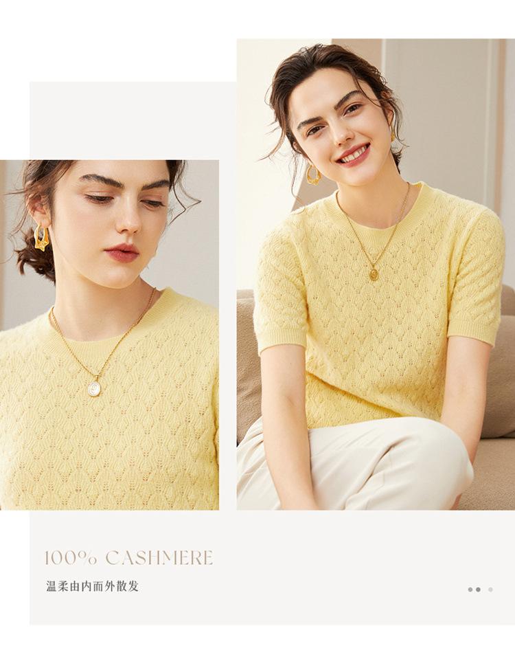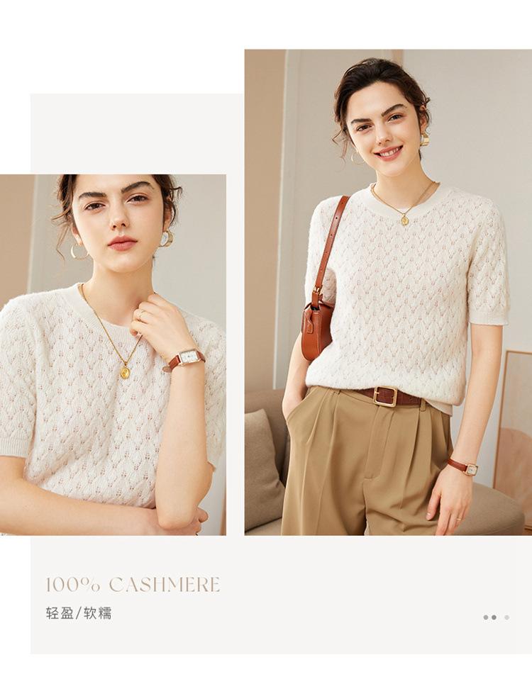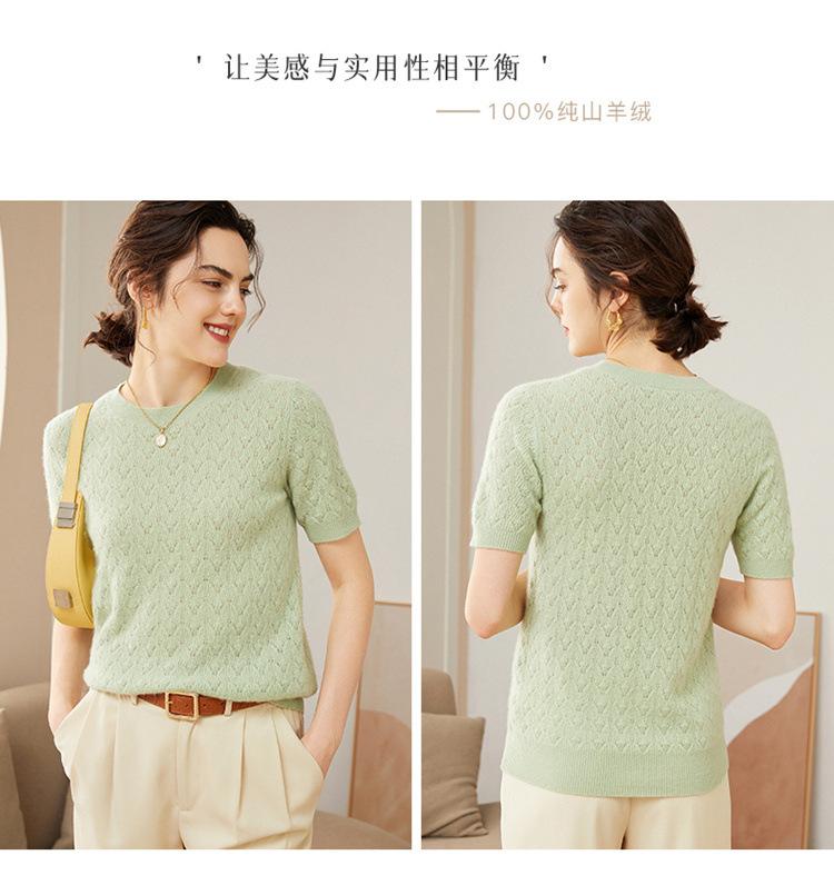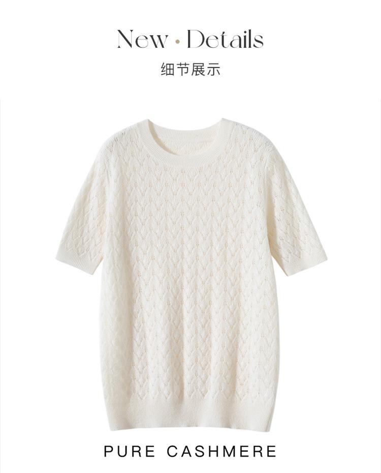 Suéter de cachemira para mujer, manga corta, 100% cachemira pura, primavera y otoño, nuevo, cuello redondo, jersey hueco, suéter de punto, manga corta