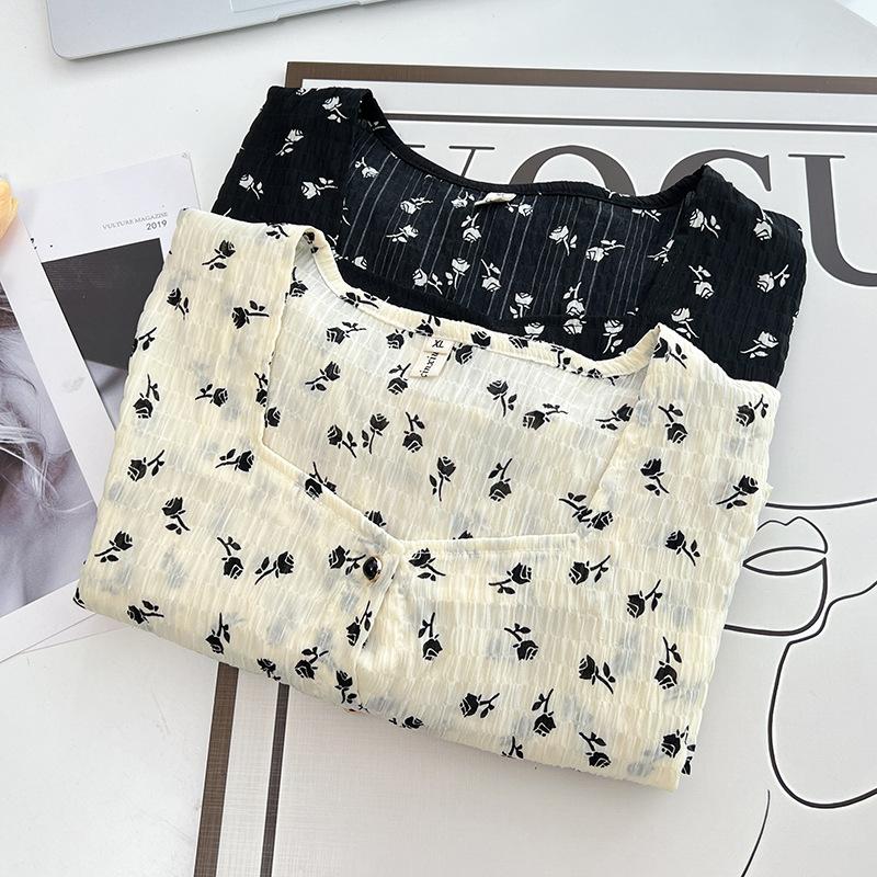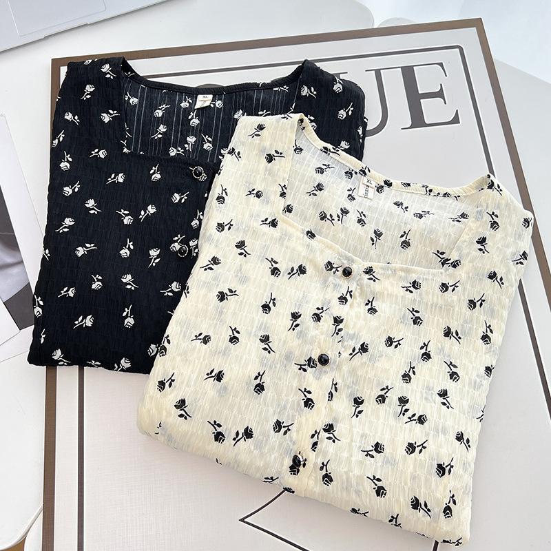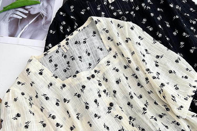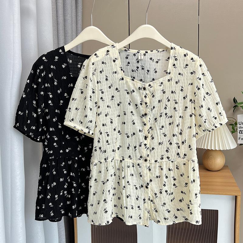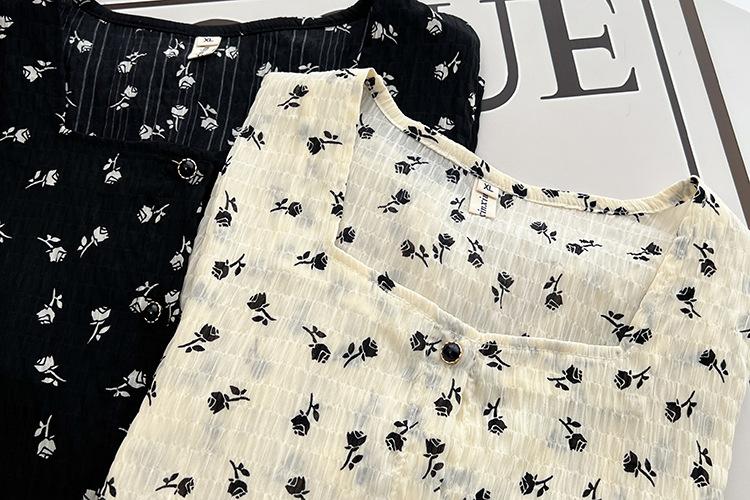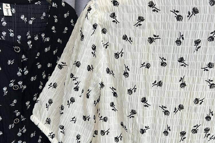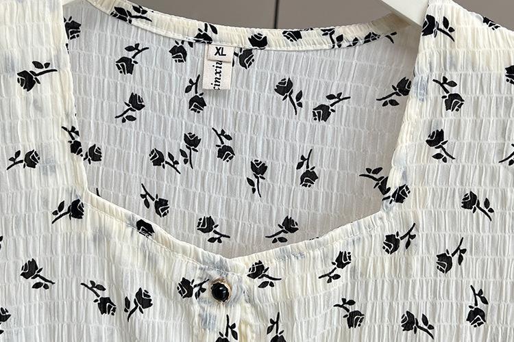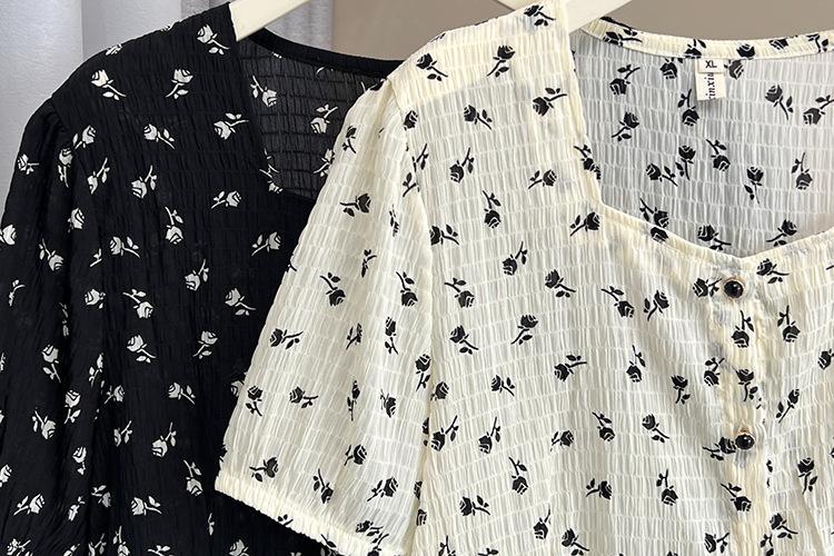 Camisa informal de cuello cuadrado con estampado floral y manga corta, estilo fresco 4240