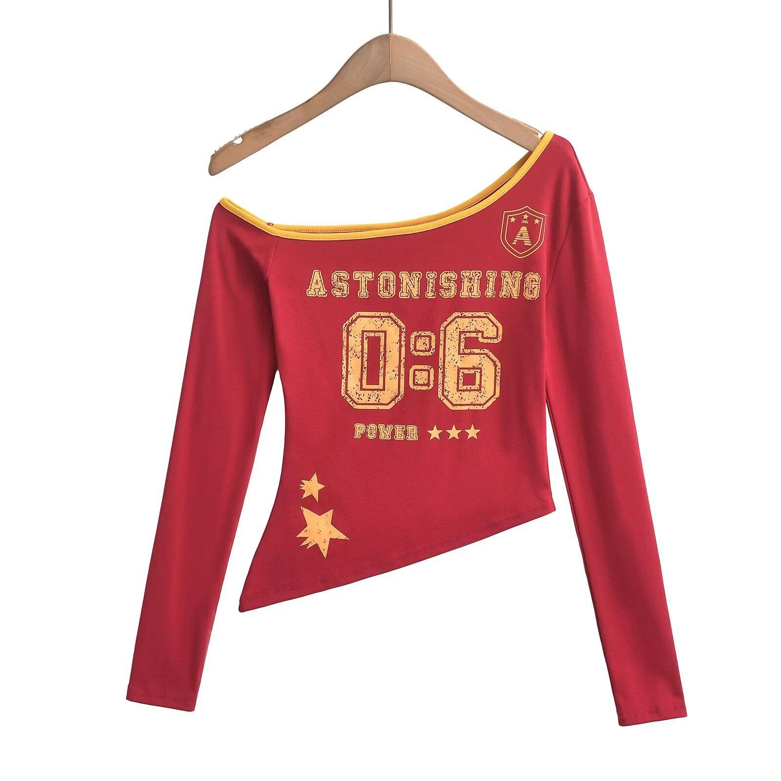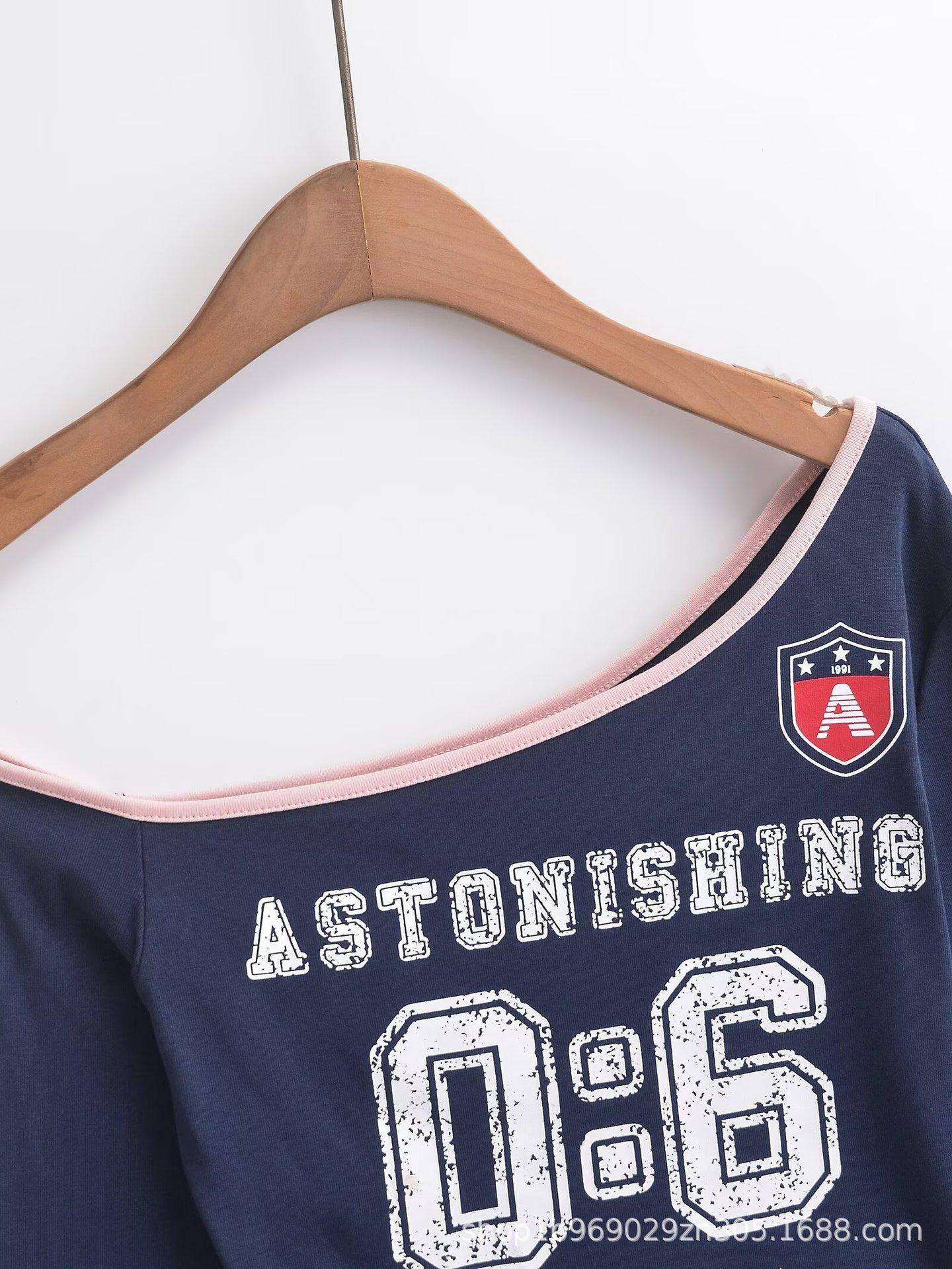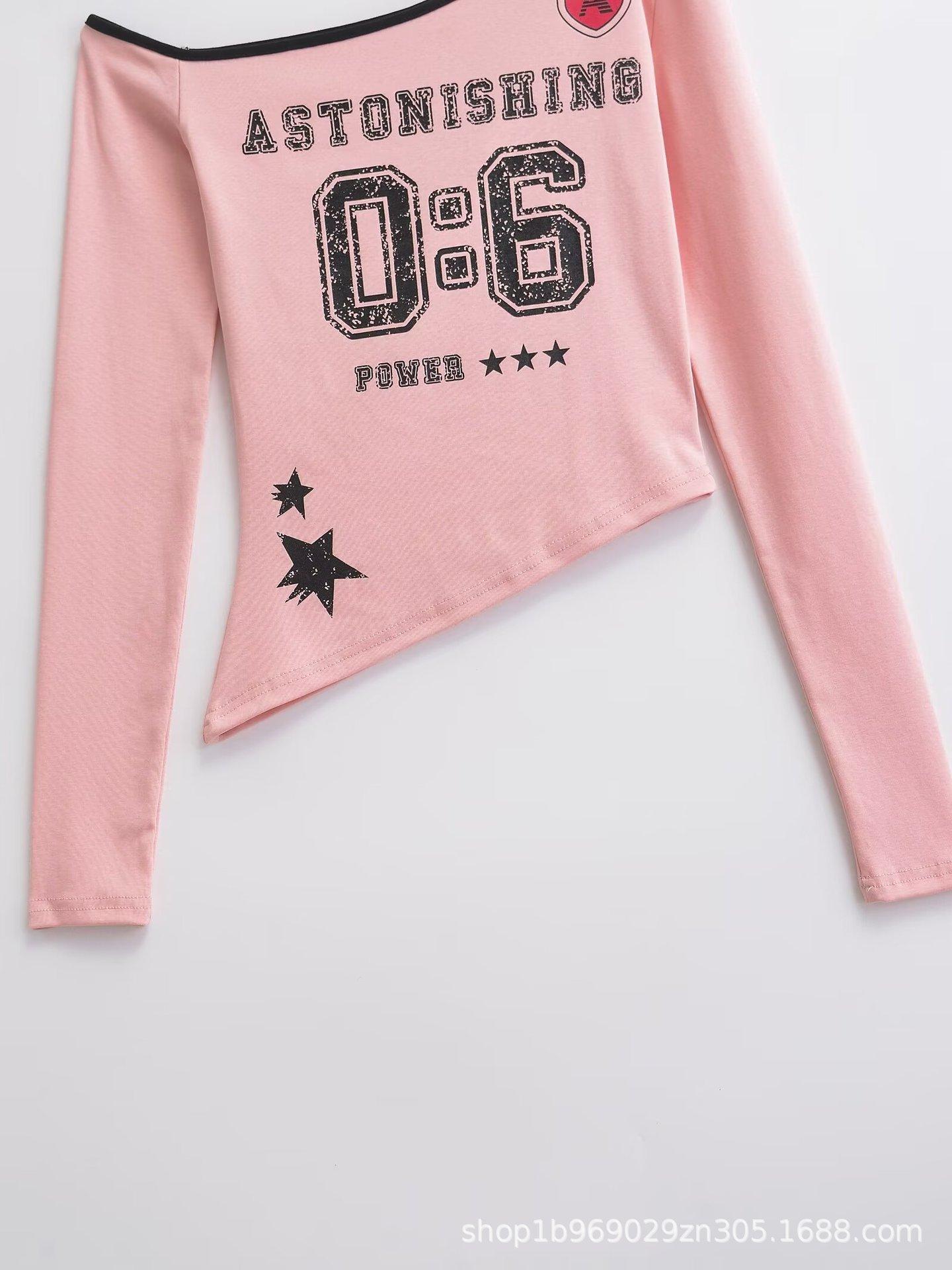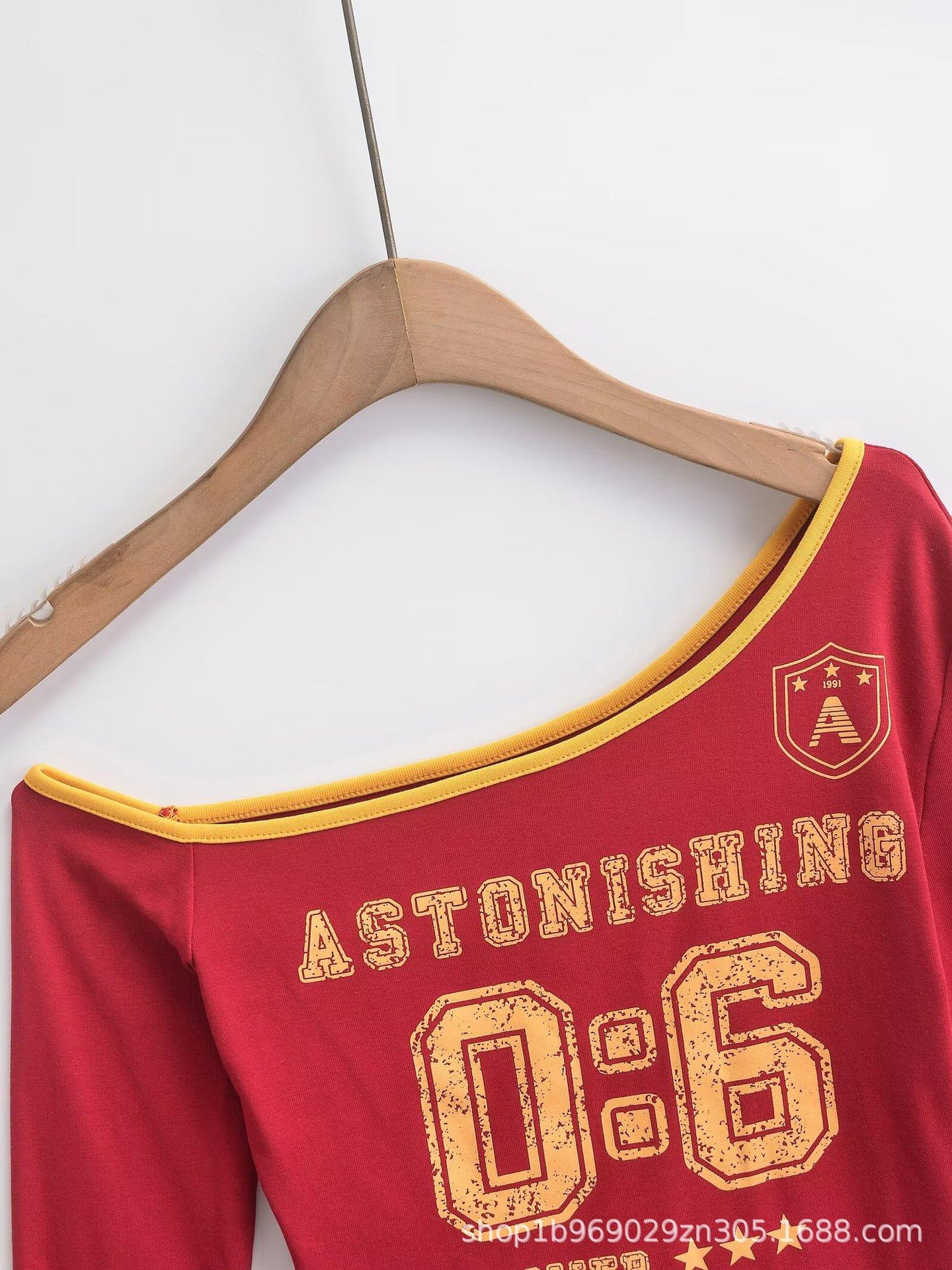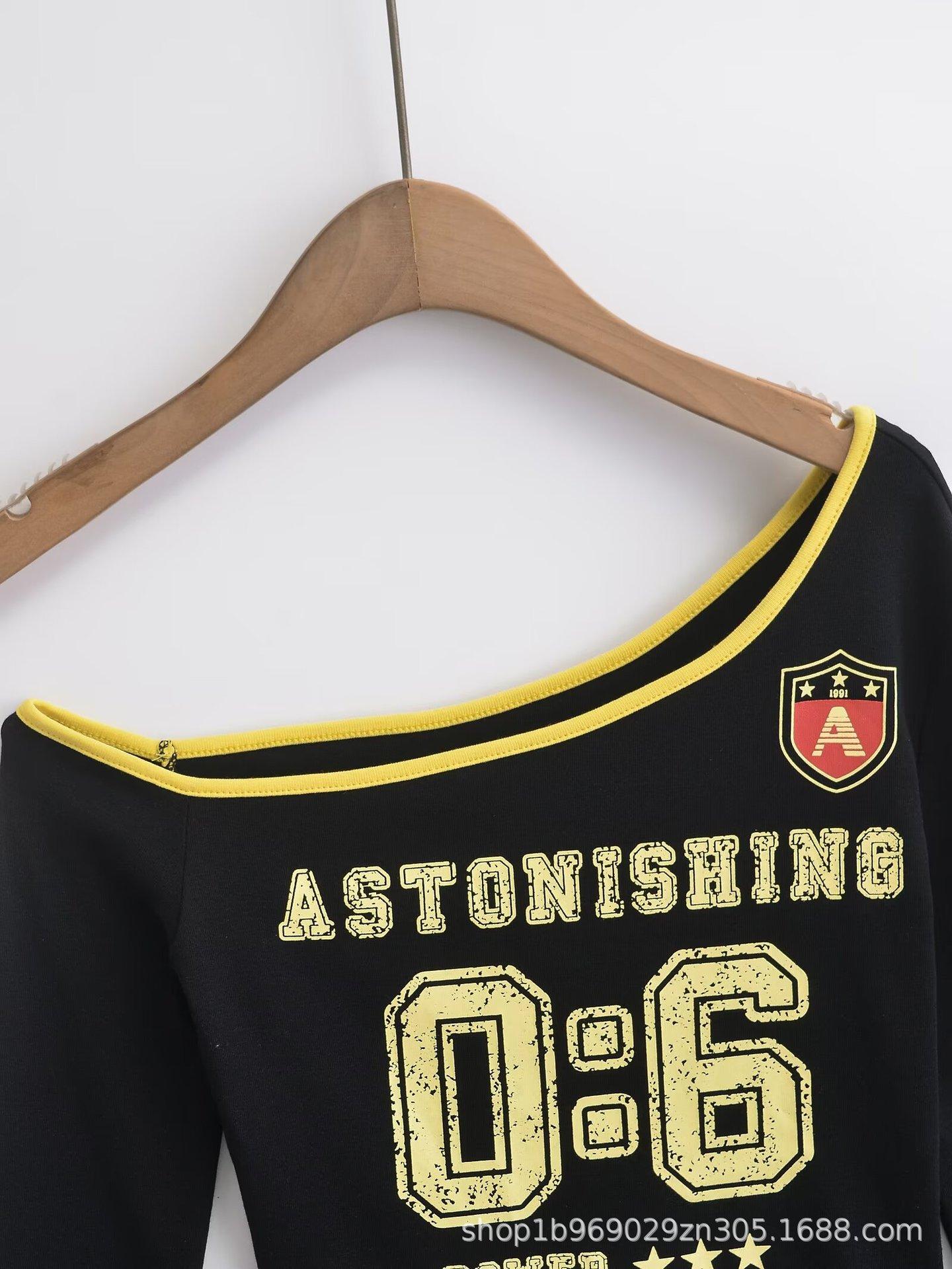 2024 Transfronterizo Estilo Spice Girl Francés Cuello Cruzado Hombro Descubierto Estampado de Letras Color en Contraste Camiseta de Manga Larga Otoño Nuevo Top de Ajuste Ceñido