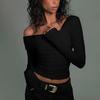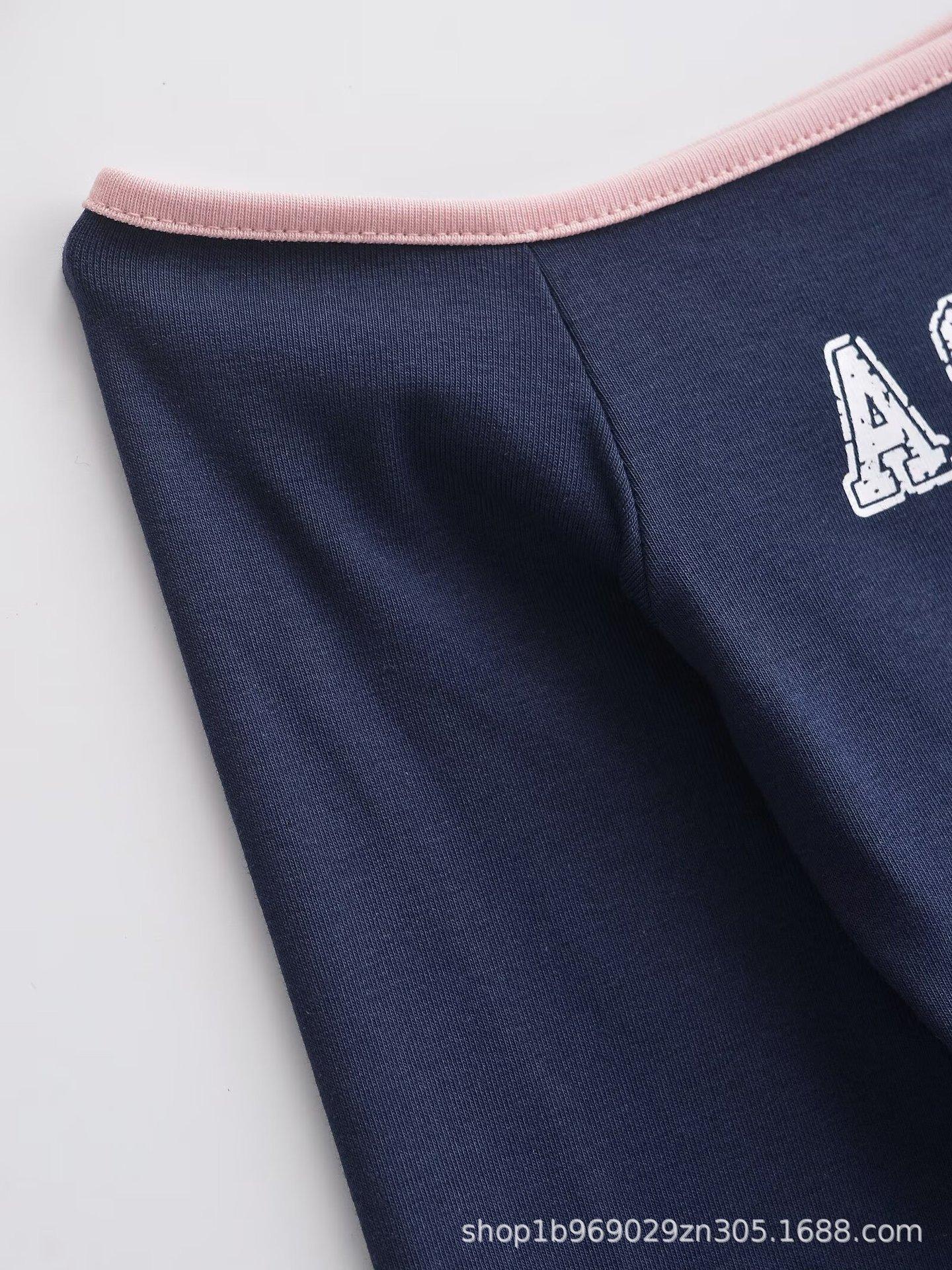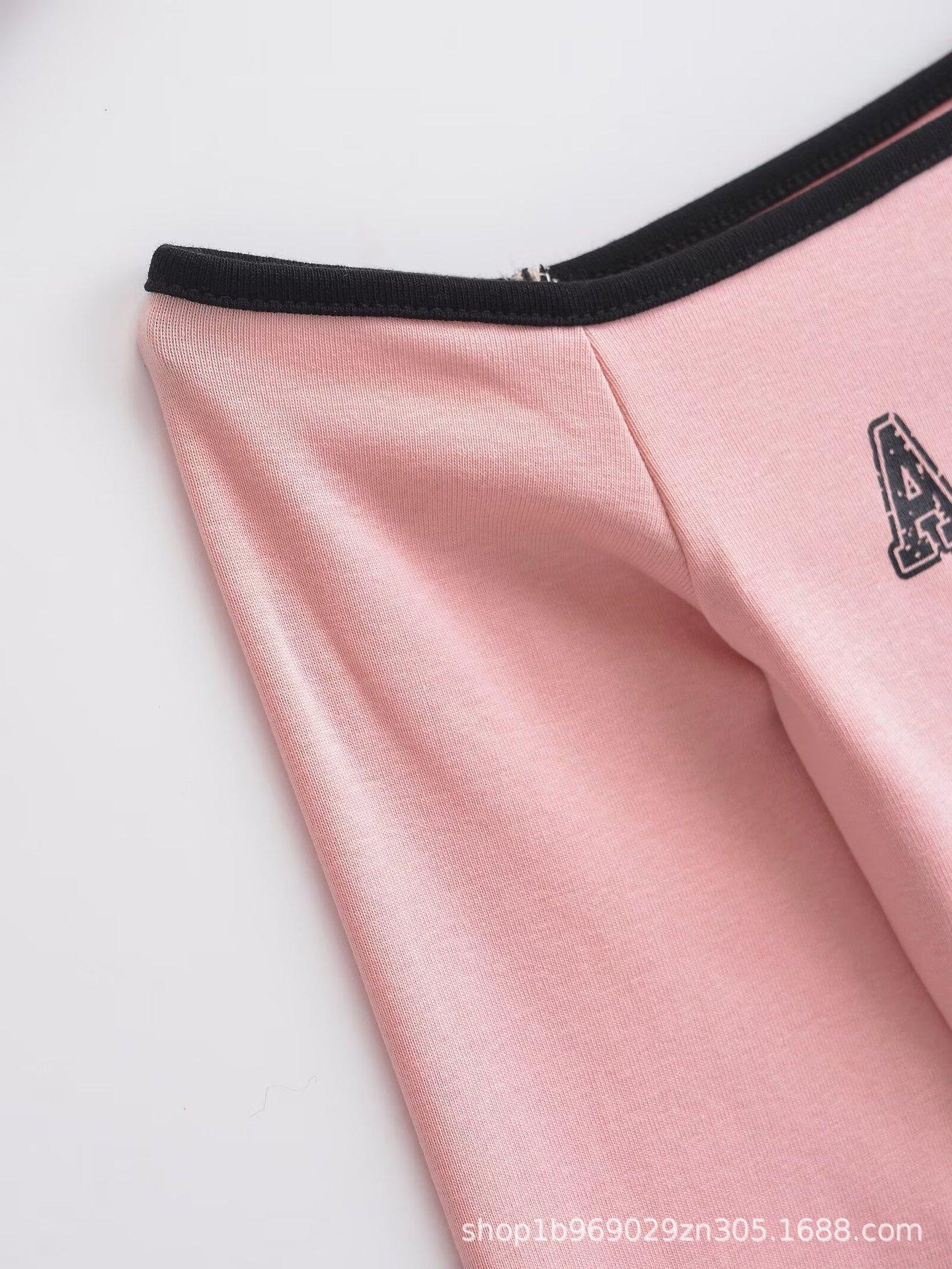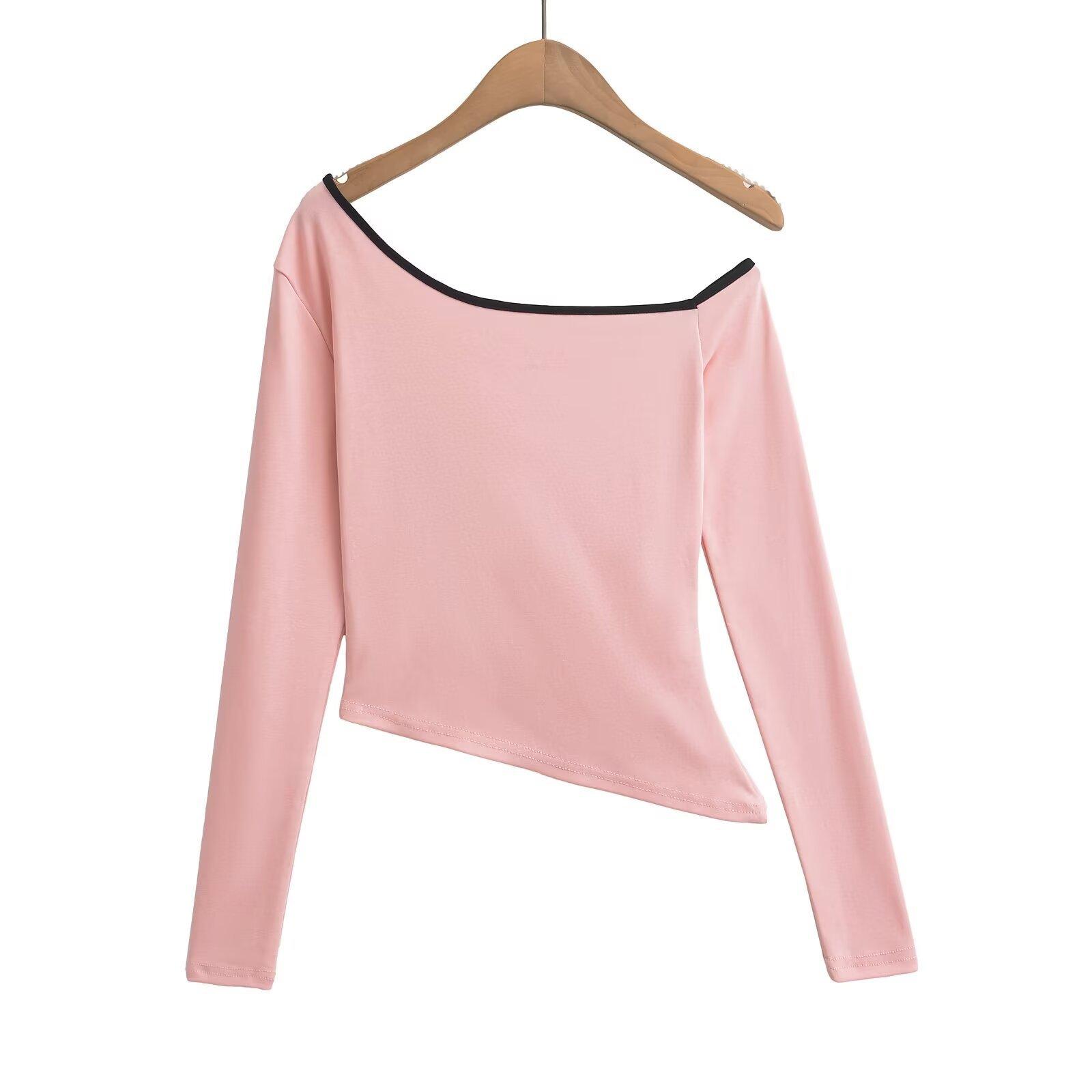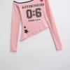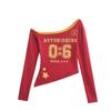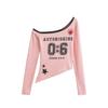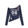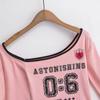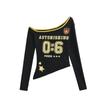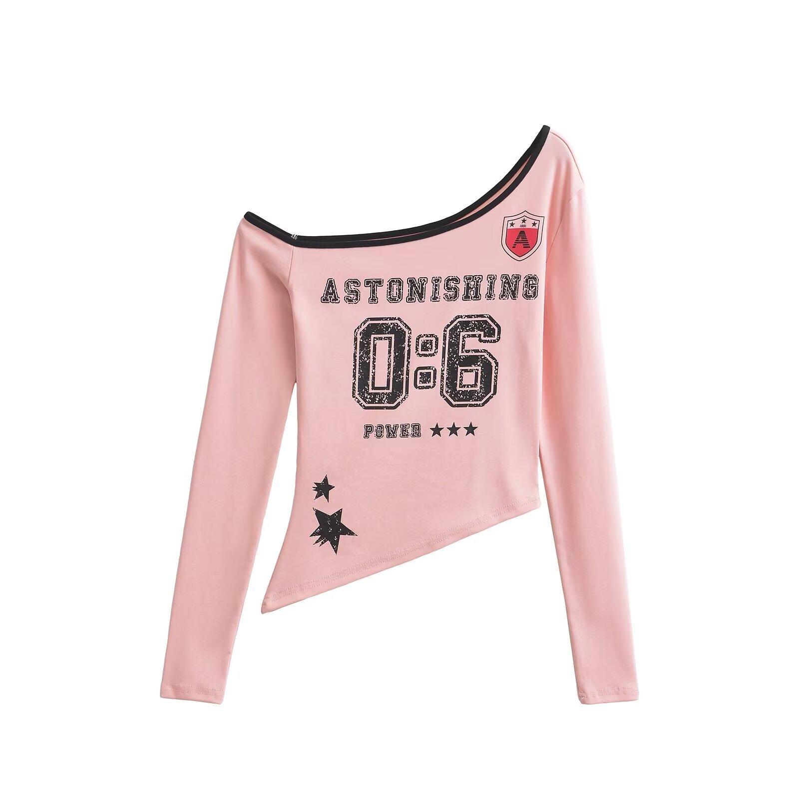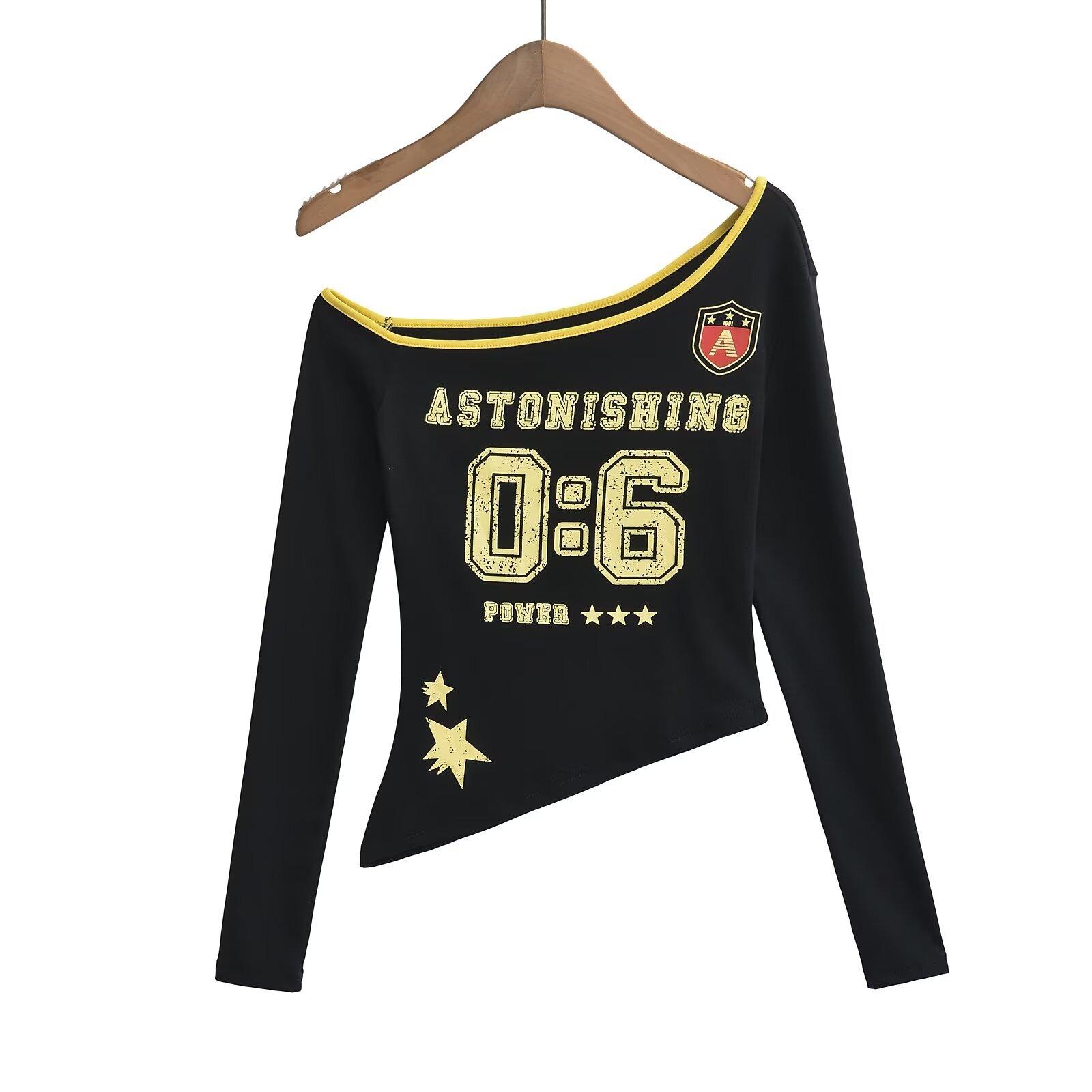 2024 Transfronterizo Estilo Spice Girl Francés Cuello Cruzado Hombro Descubierto Estampado de Letras Color en Contraste Camiseta de Manga Larga Otoño Nuevo Top de Ajuste Ceñido