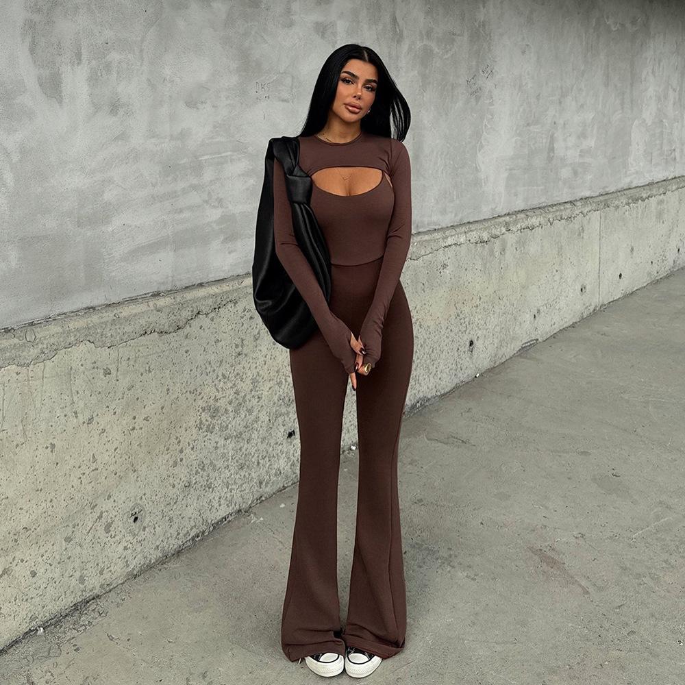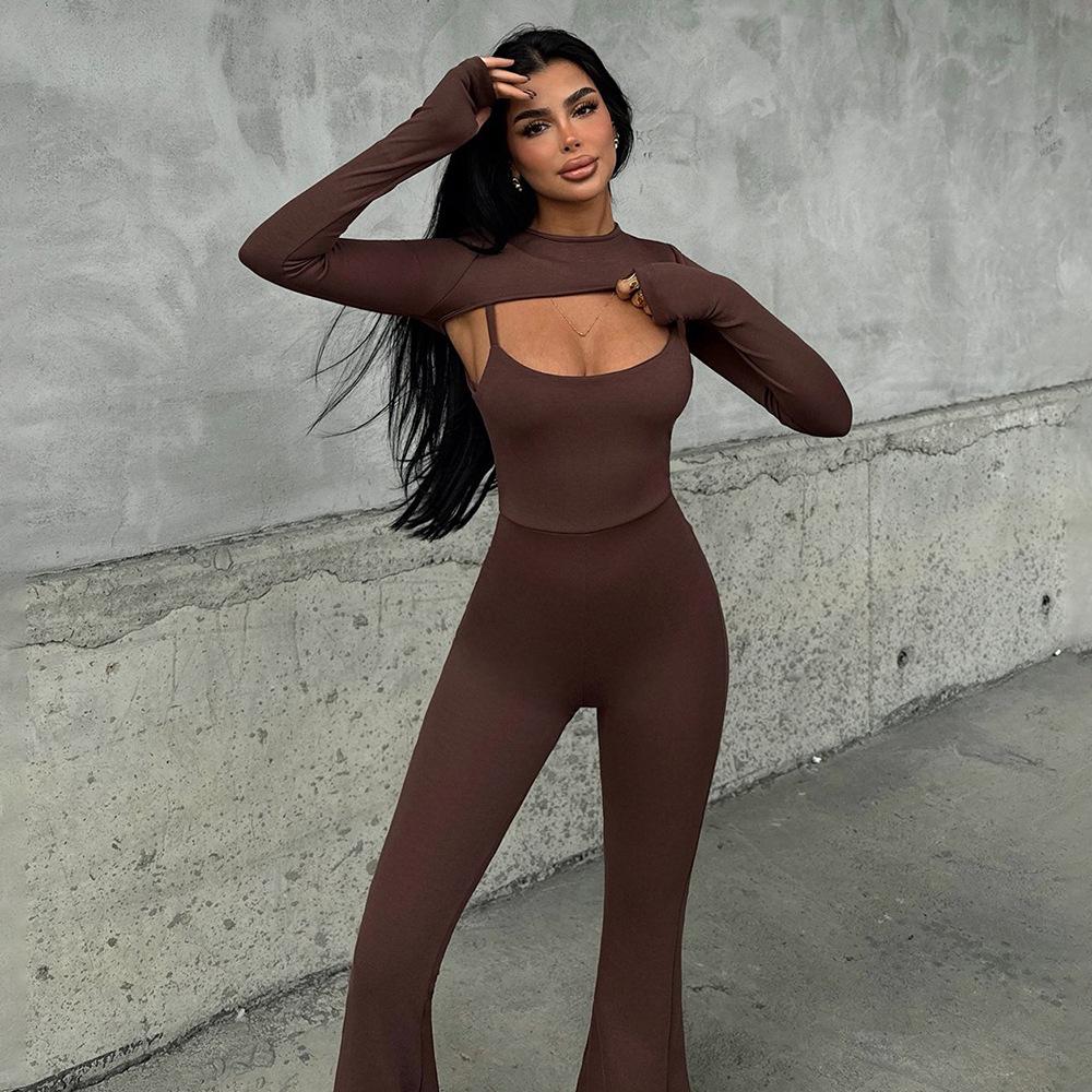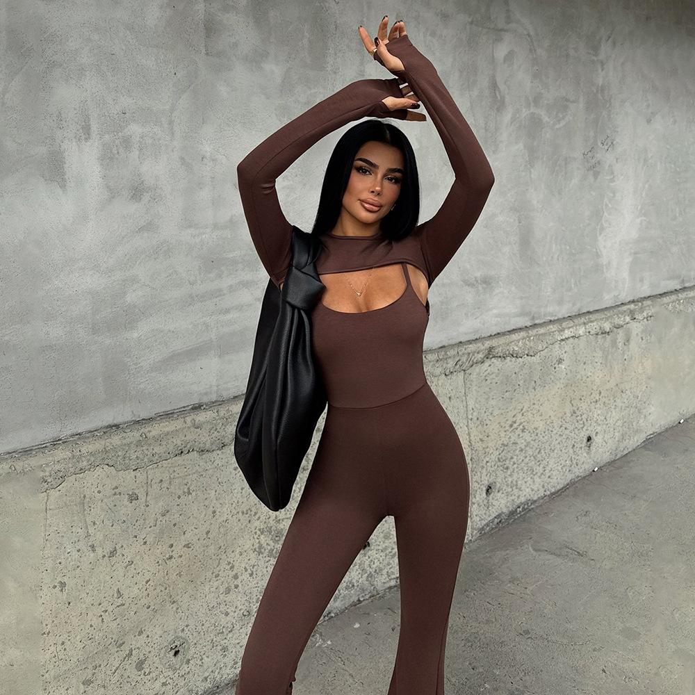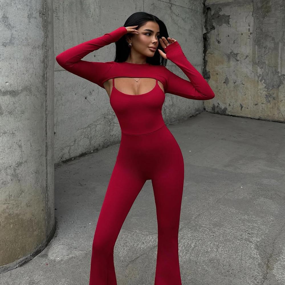 Mono deportivo ajustado de manga larga con hombros descubiertos para mujer, estilo Spice Girl, estilo europeo y americano, de dos piezas, recién llegado