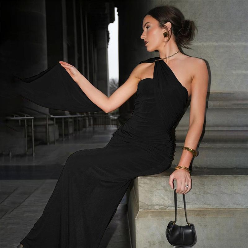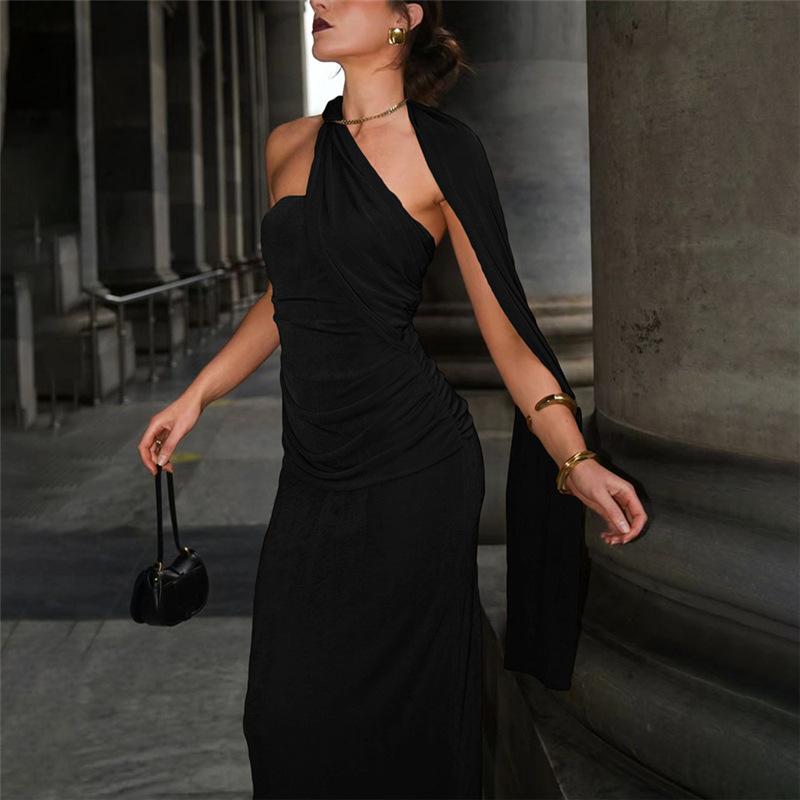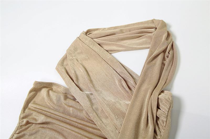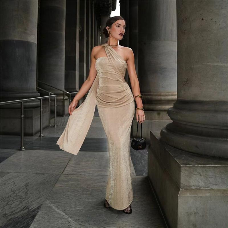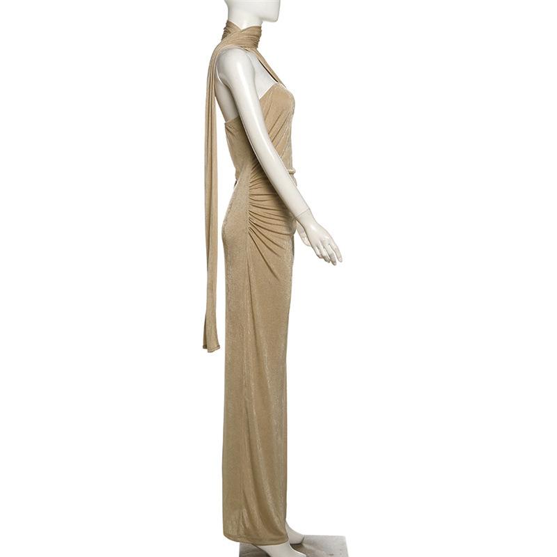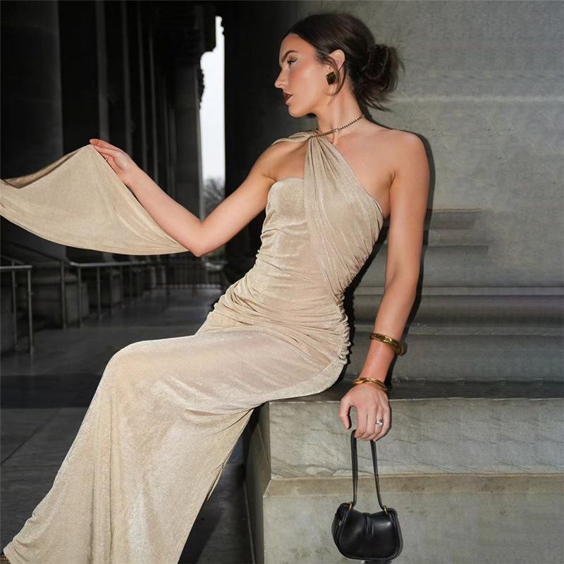 Vestido de noche estilo europeo y americano de invierno 2024, sexy, ajustado, sin espalda, con tirantes finos, plisado, de color liso