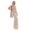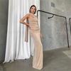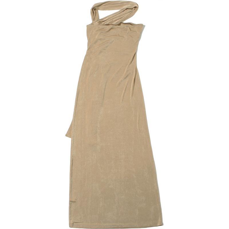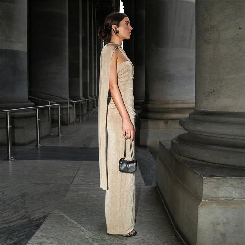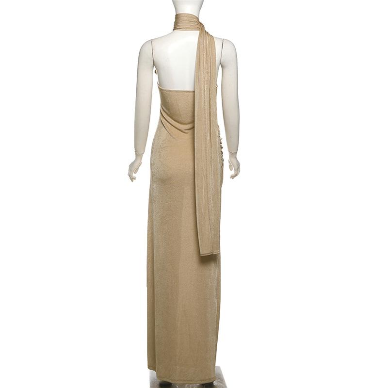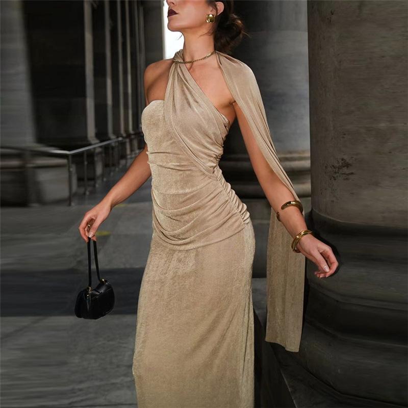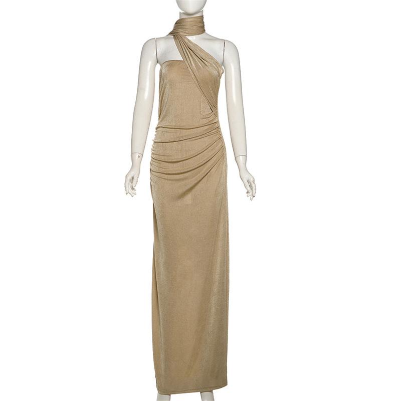 Vestido de noche estilo europeo y americano de invierno 2024, sexy, ajustado, sin espalda, con tirantes finos, plisado, de color liso