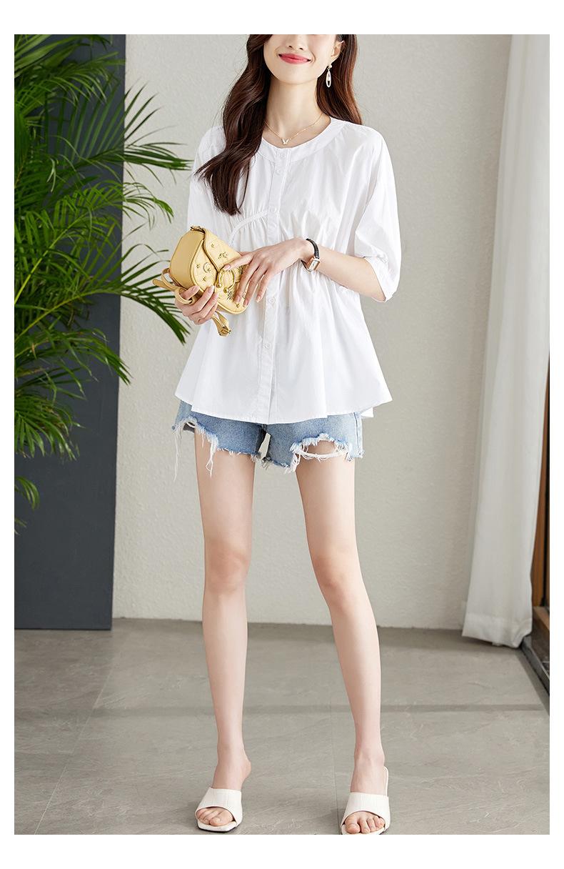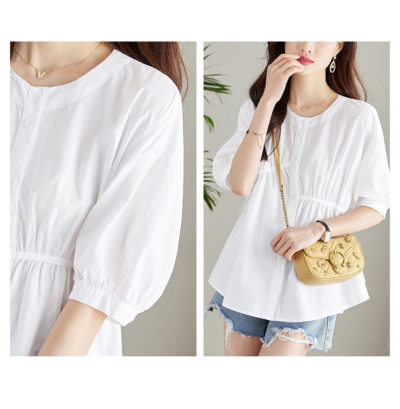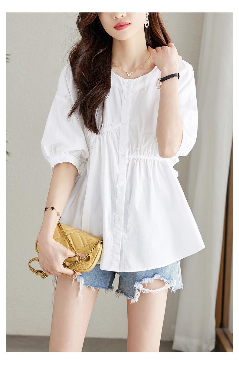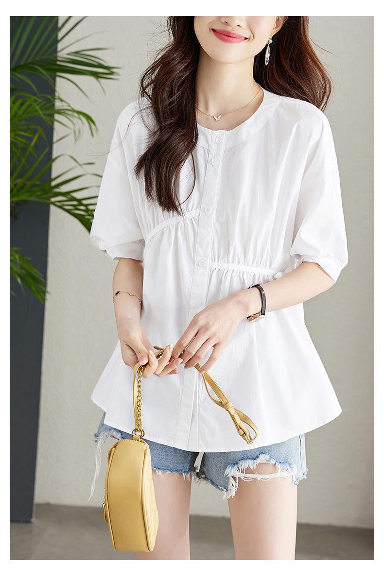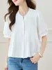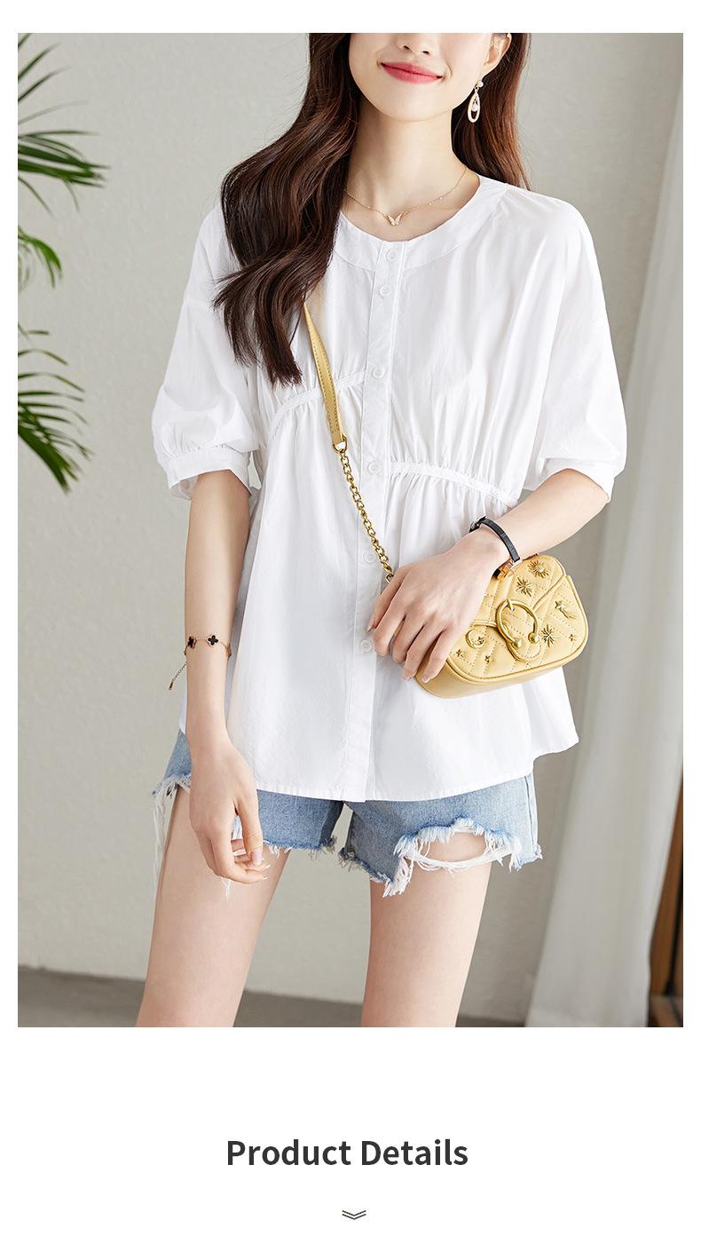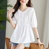 Camisa Blanca Plisada Asimétrica para Mujer Manga Media Verano 2025 Cuello Redondo Cintura Top Baby Doll Camisa Chic Estilo Occidental