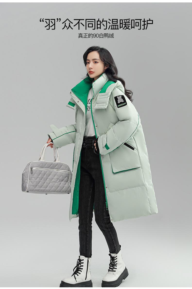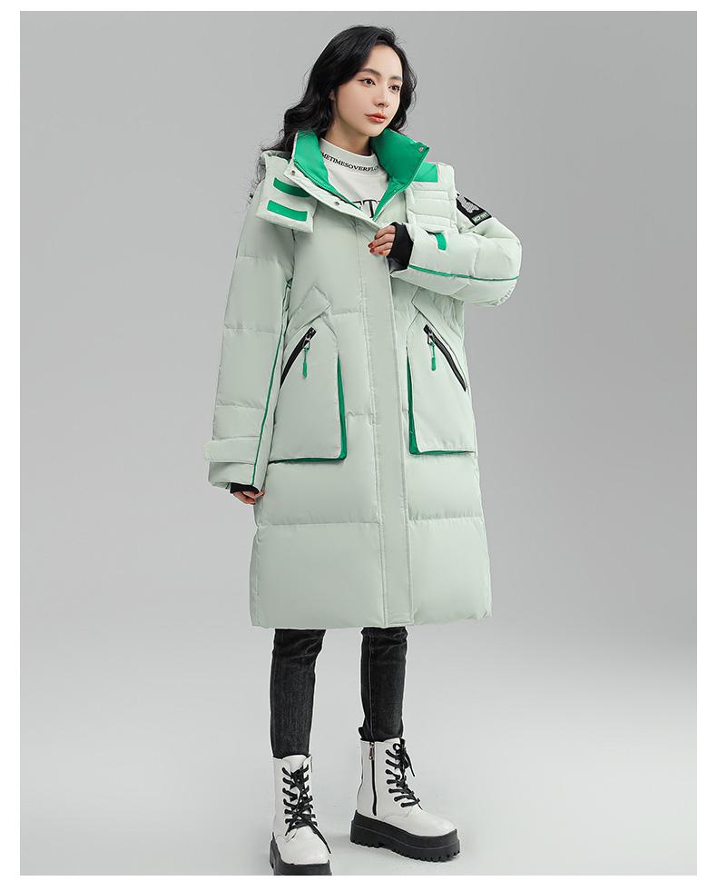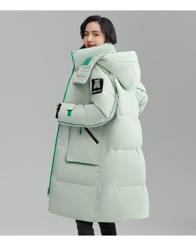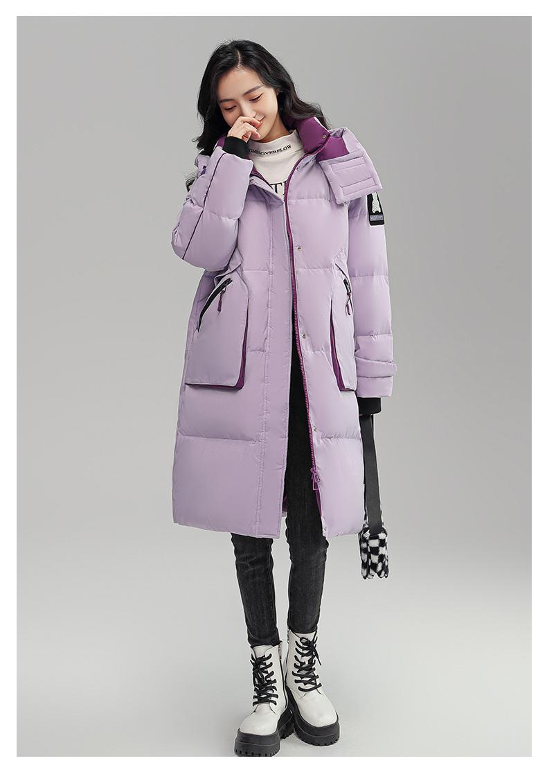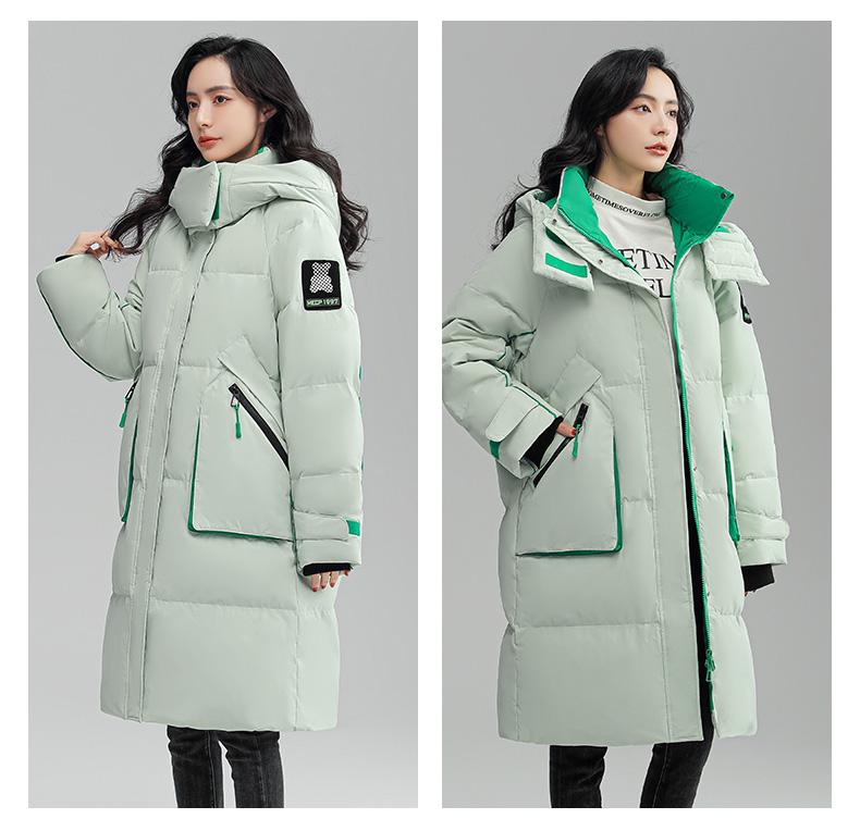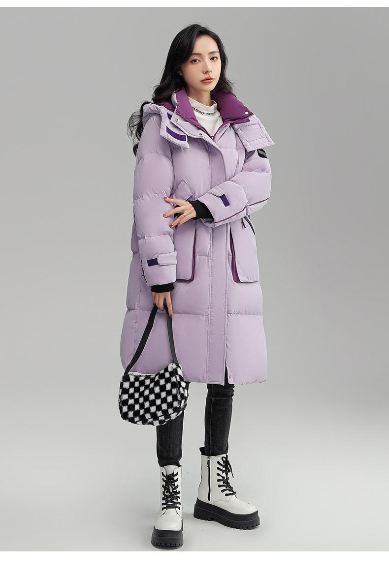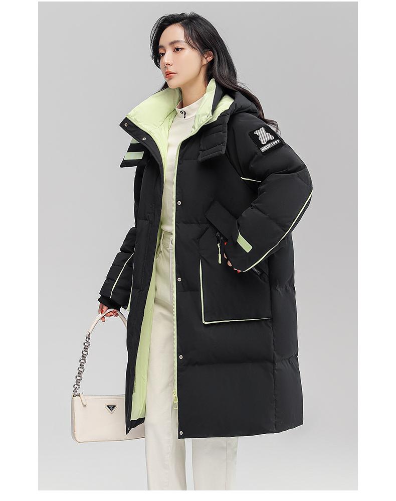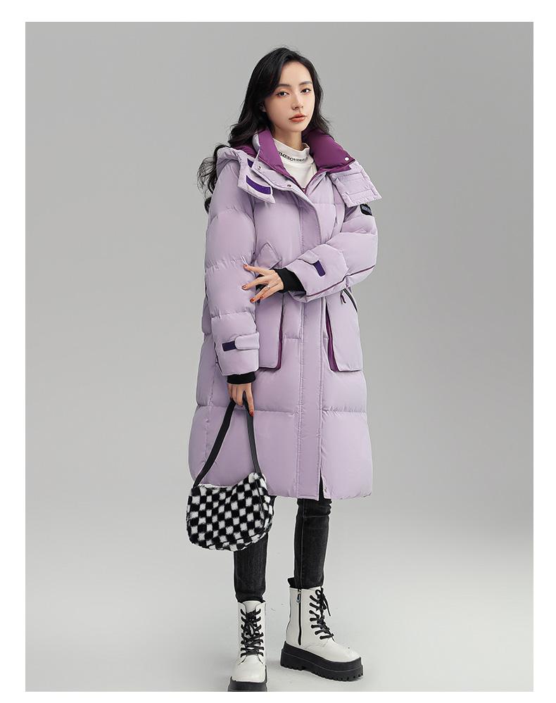 Chaqueta de plumón de pato para mujer de longitud media 2025 Invierno Nueva Moda Color de Contraste Patchwork con Capucha Cálida Chaqueta de plumón de pato