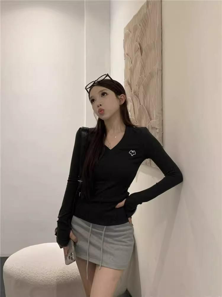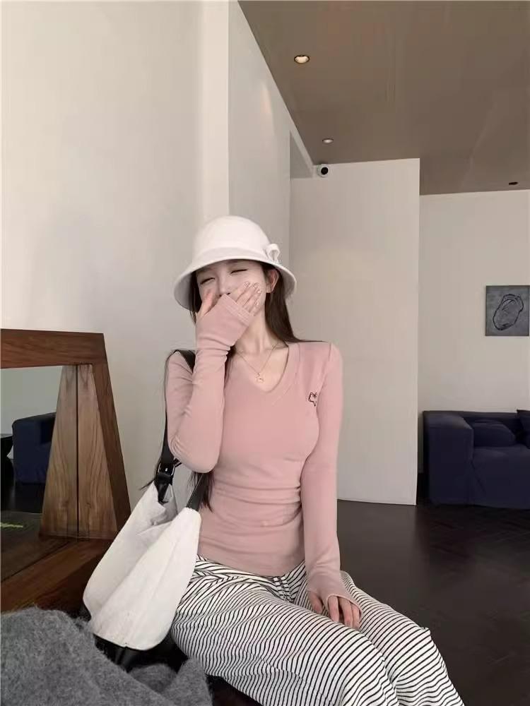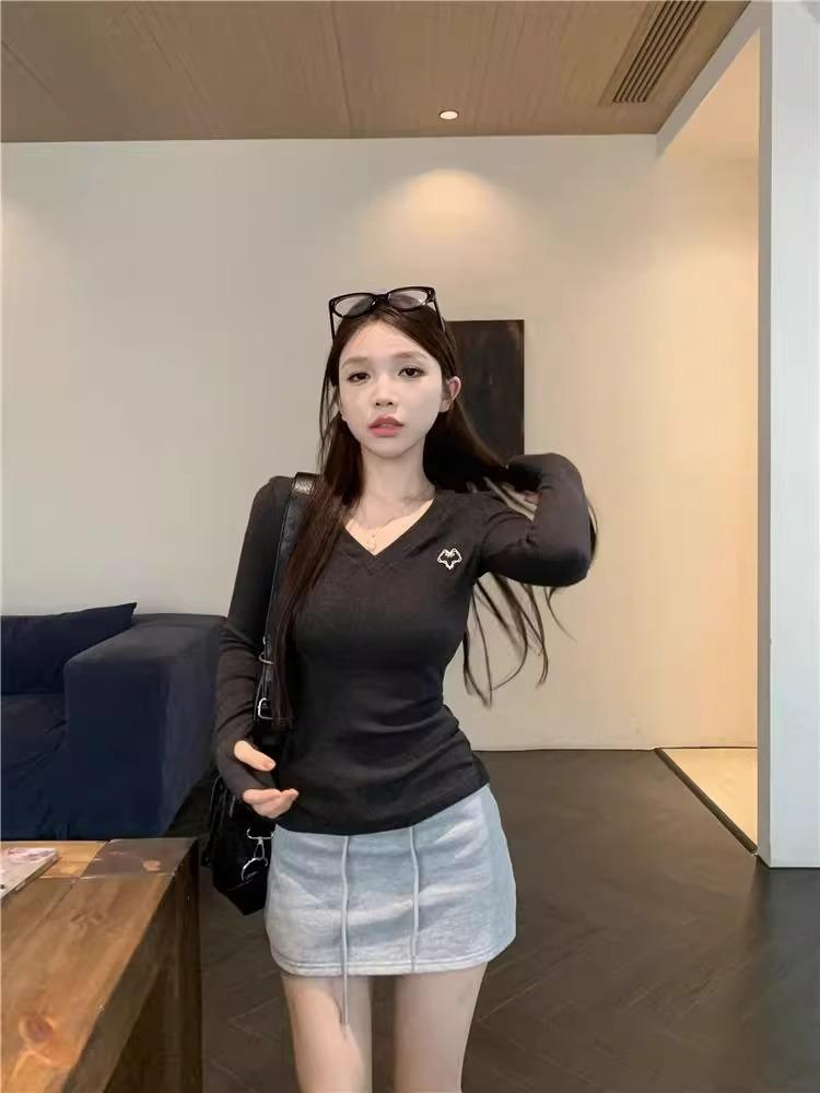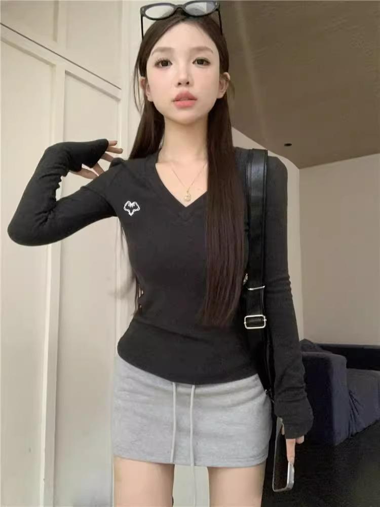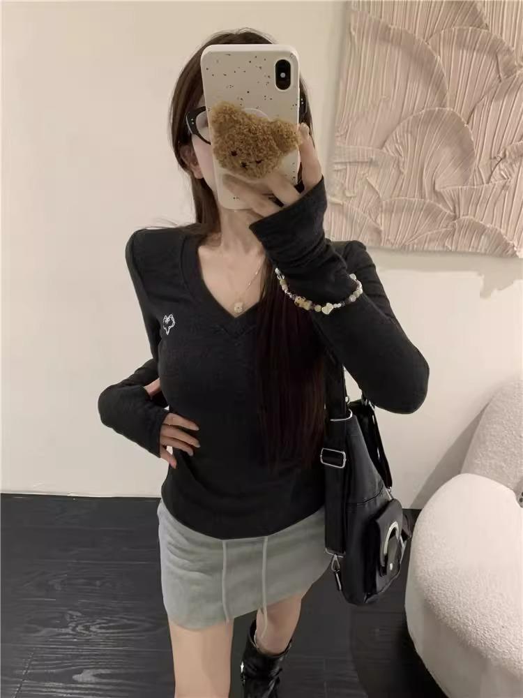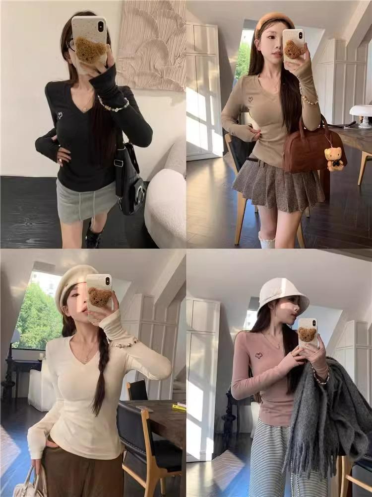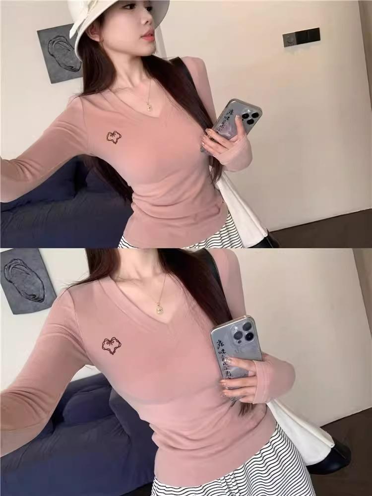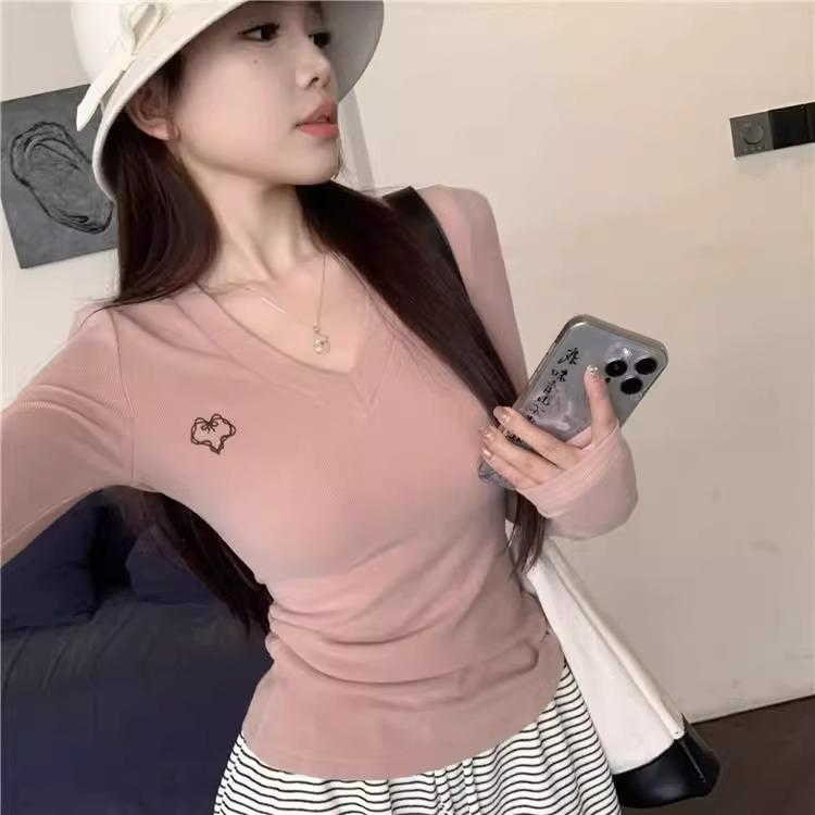 Playera Bordada con Cuello en V para Mujer Primavera y Otoño Manga Larga Dulce Cool Spice Girls Ajustada Adelgazante Primavera y Otoño Playera Base Top Invierno