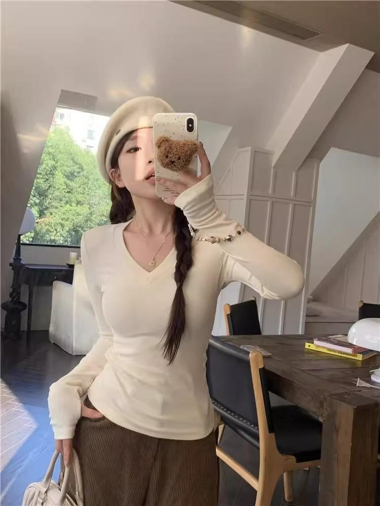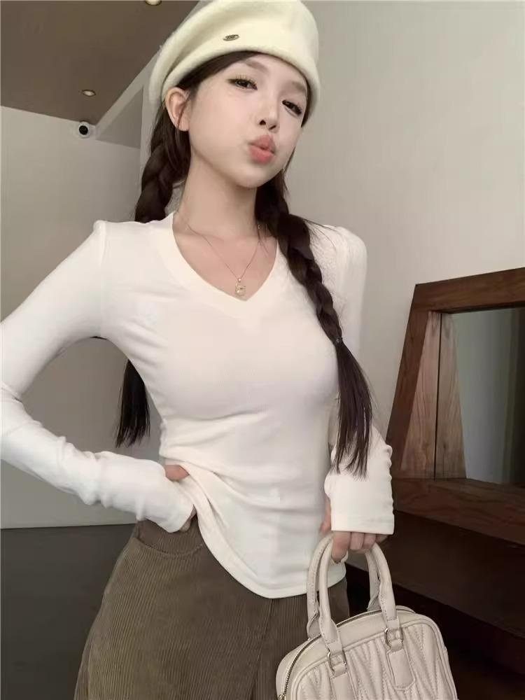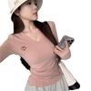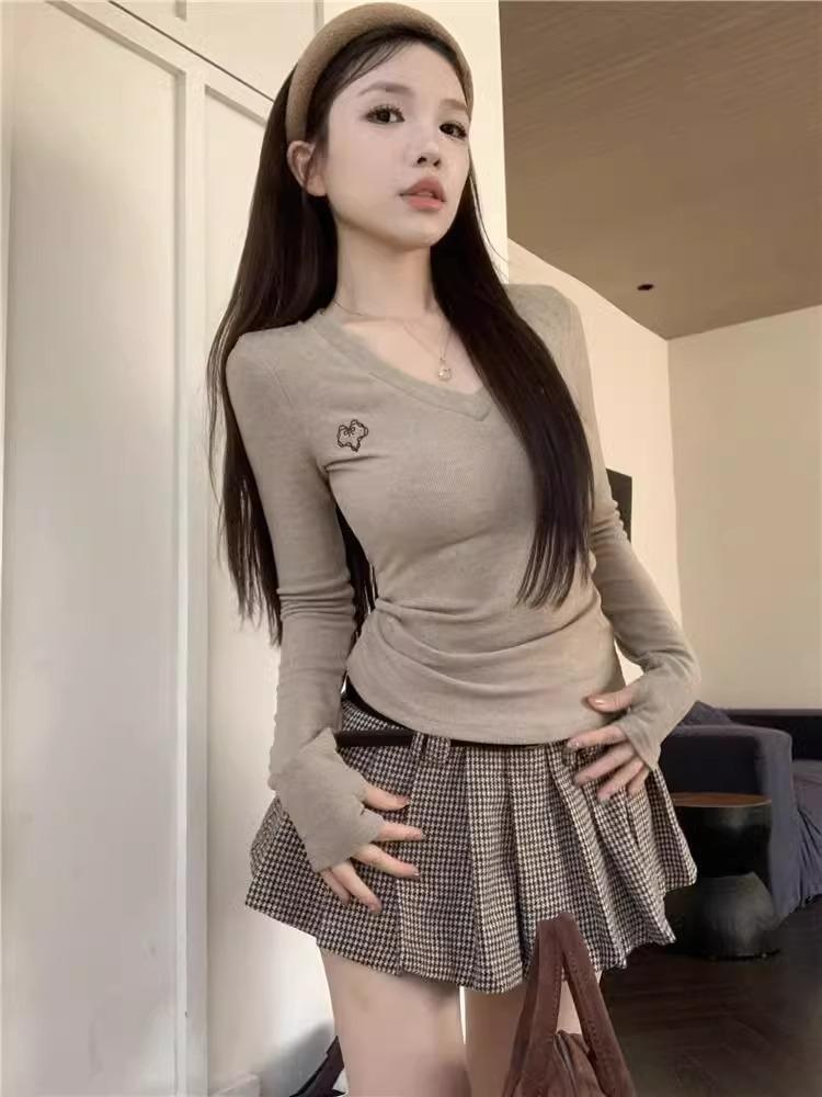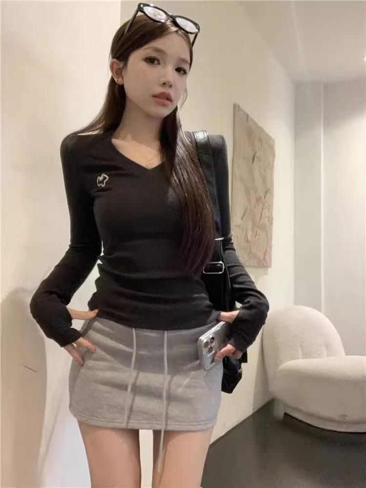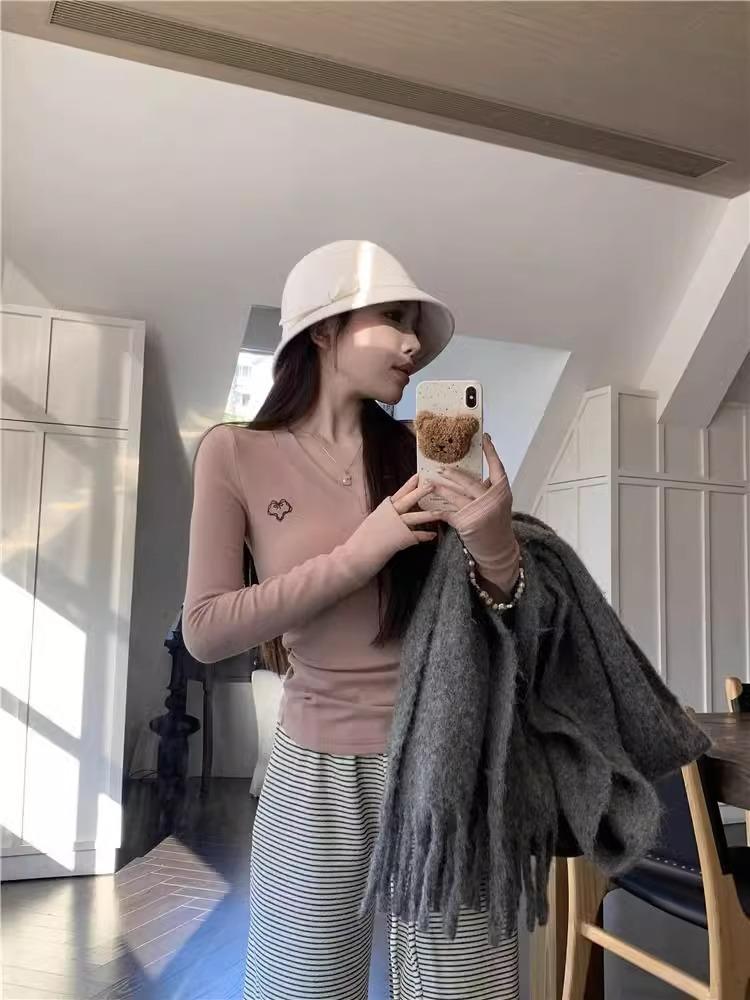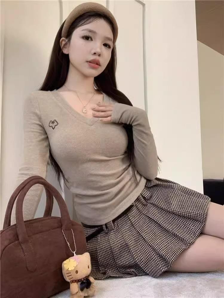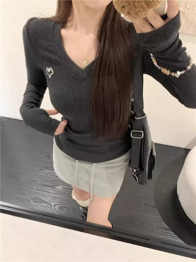 Playera Bordada con Cuello en V para Mujer Primavera y Otoño Manga Larga Dulce Cool Spice Girls Ajustada Adelgazante Primavera y Otoño Playera Base Top Invierno