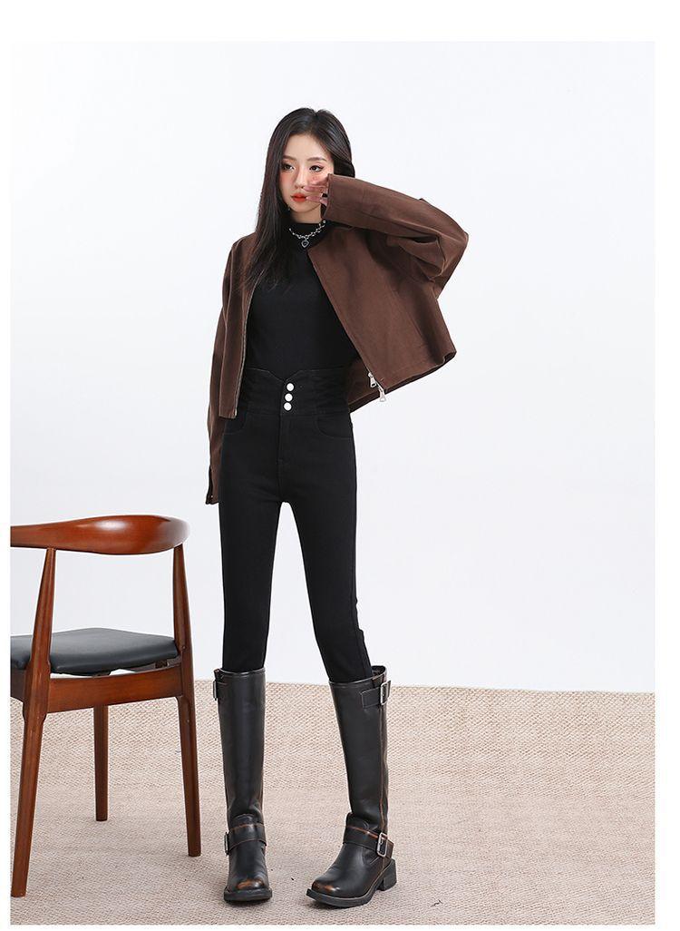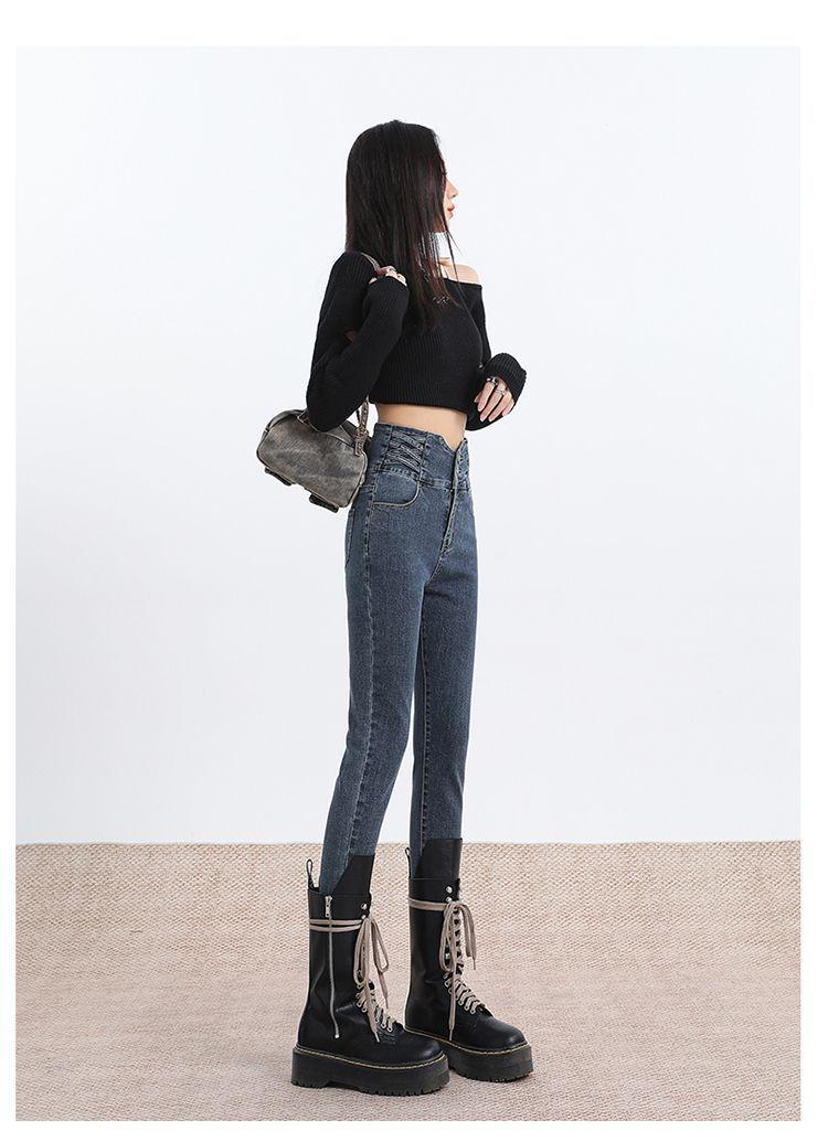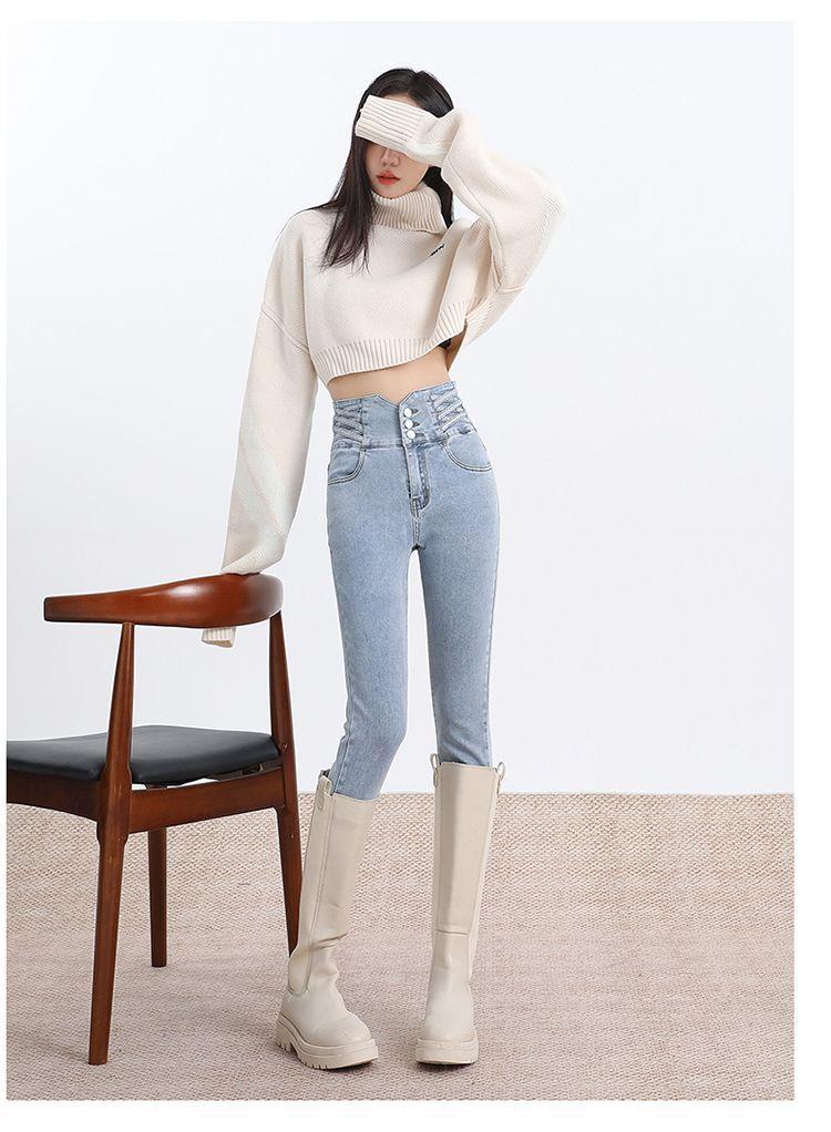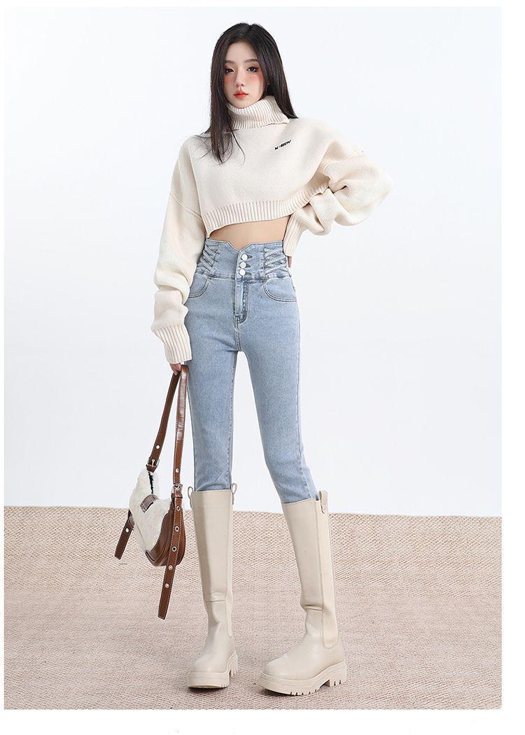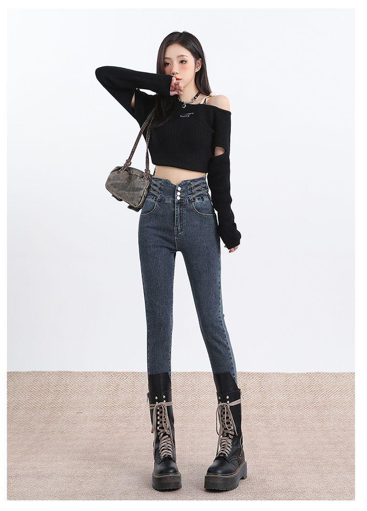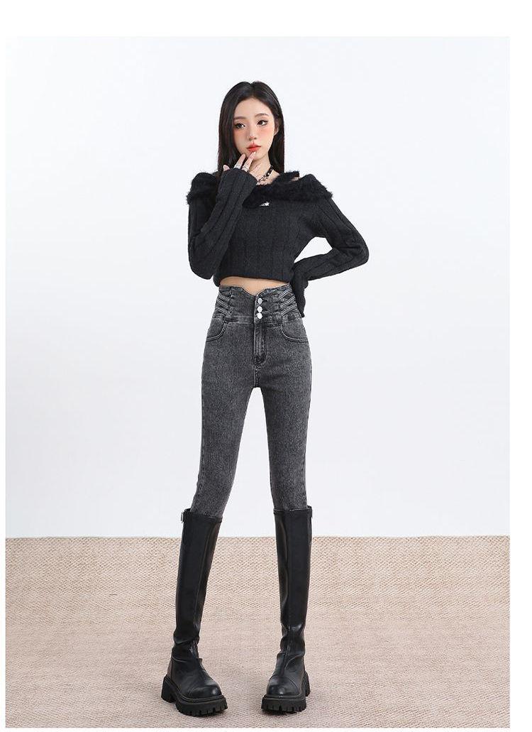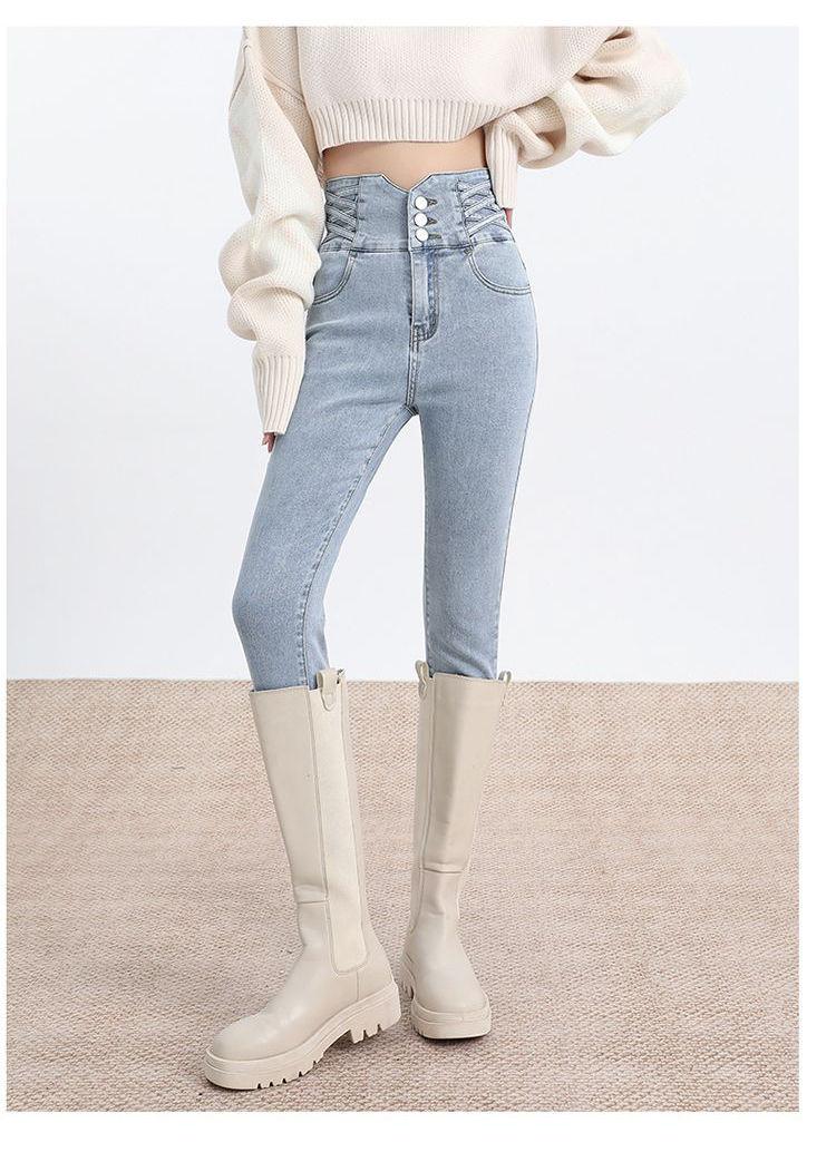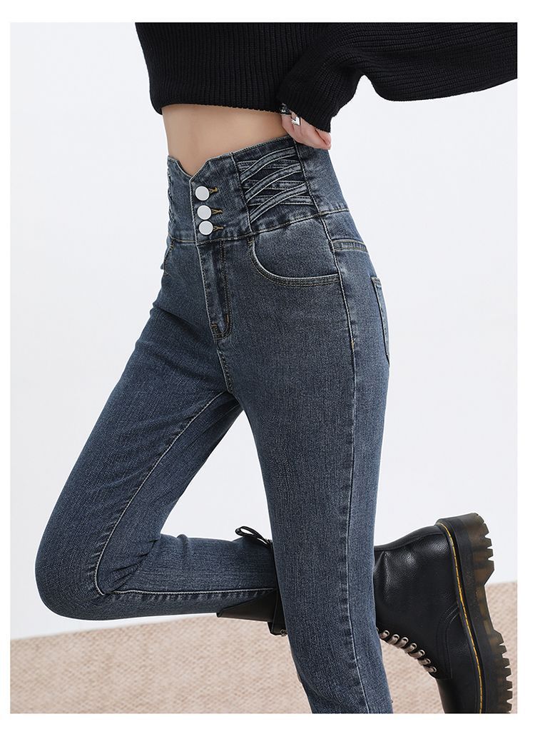 Pantalones vaqueros de cintura alta para mujer, otoño e invierno 2024, nuevos, ajustados, negros, ajustados, ajustados, con forro polar.