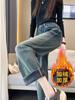 Pantalones vaqueros de pierna ancha con forro polar y cintura alta para mujer, invierno 2024, holgados, adelgazantes, gruesos, retro, de pierna recta