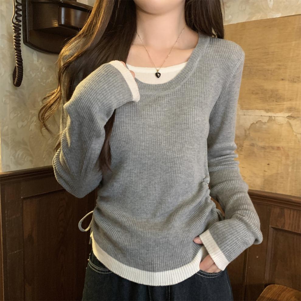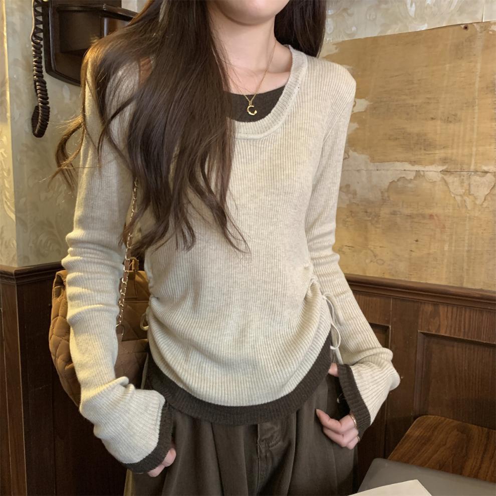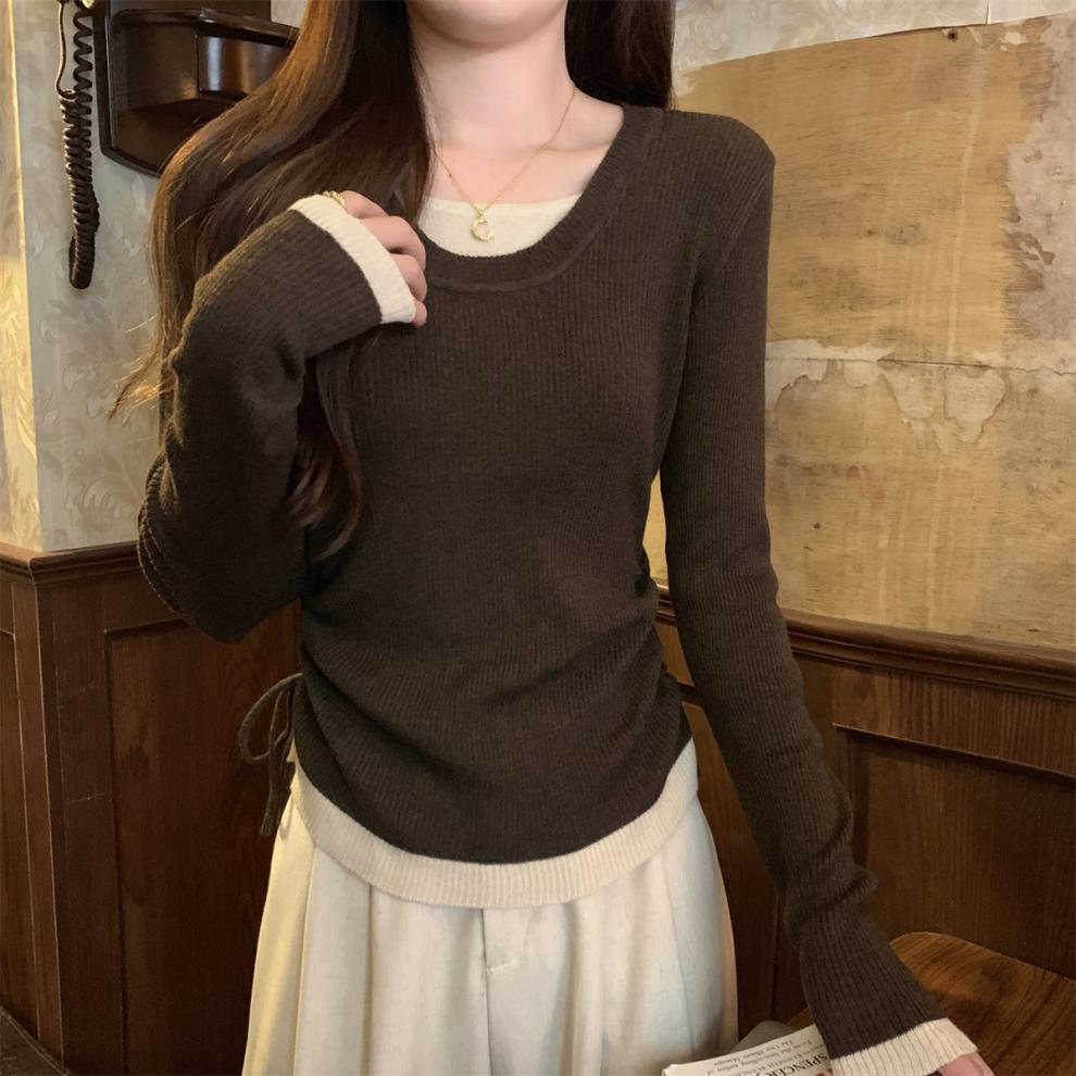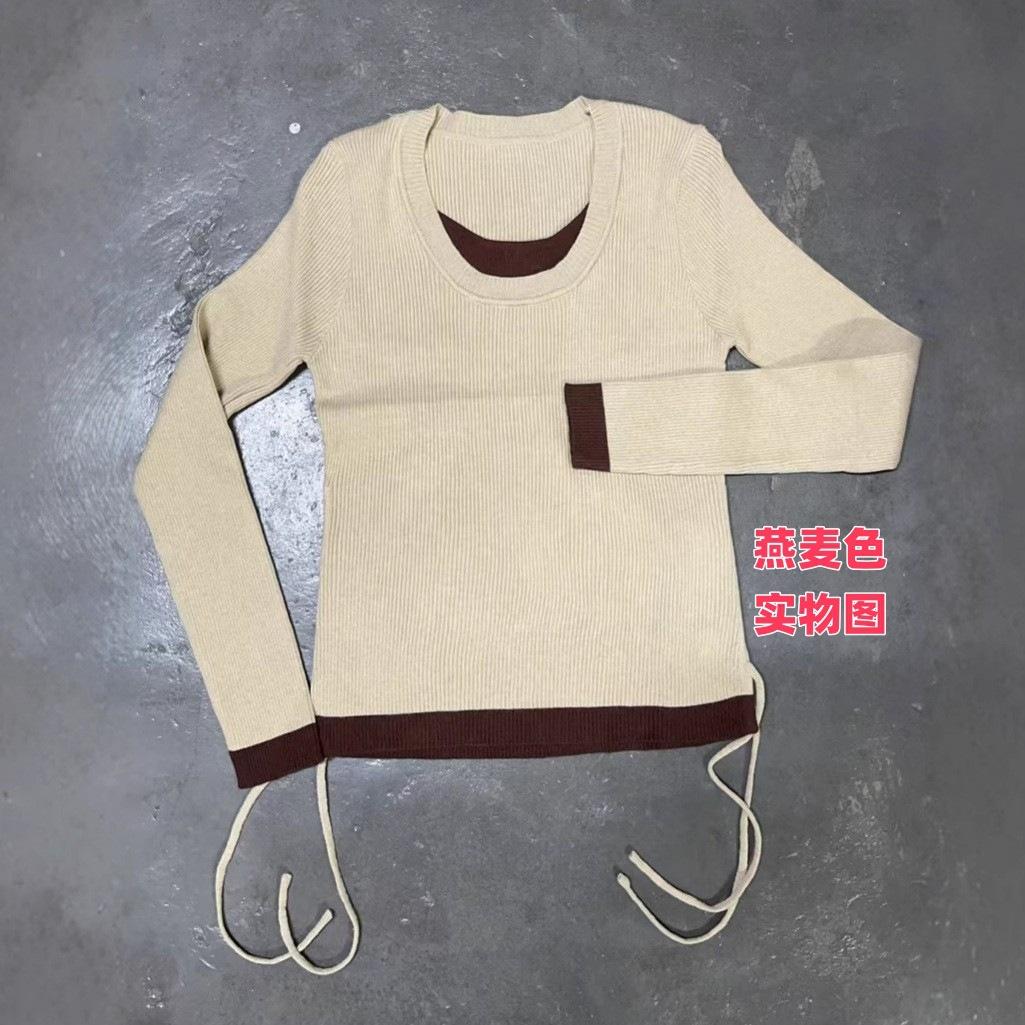 Otoño e invierno 2025 estilo coreano temperamento color contraste cuello U cordón falso dos piezas punto fondo manga larga top