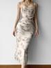 Vestido transfronterizo europeo y americano, elegante, largo, sin espalda, con tirantes anchos, color liso, sin mangas, con plumas.