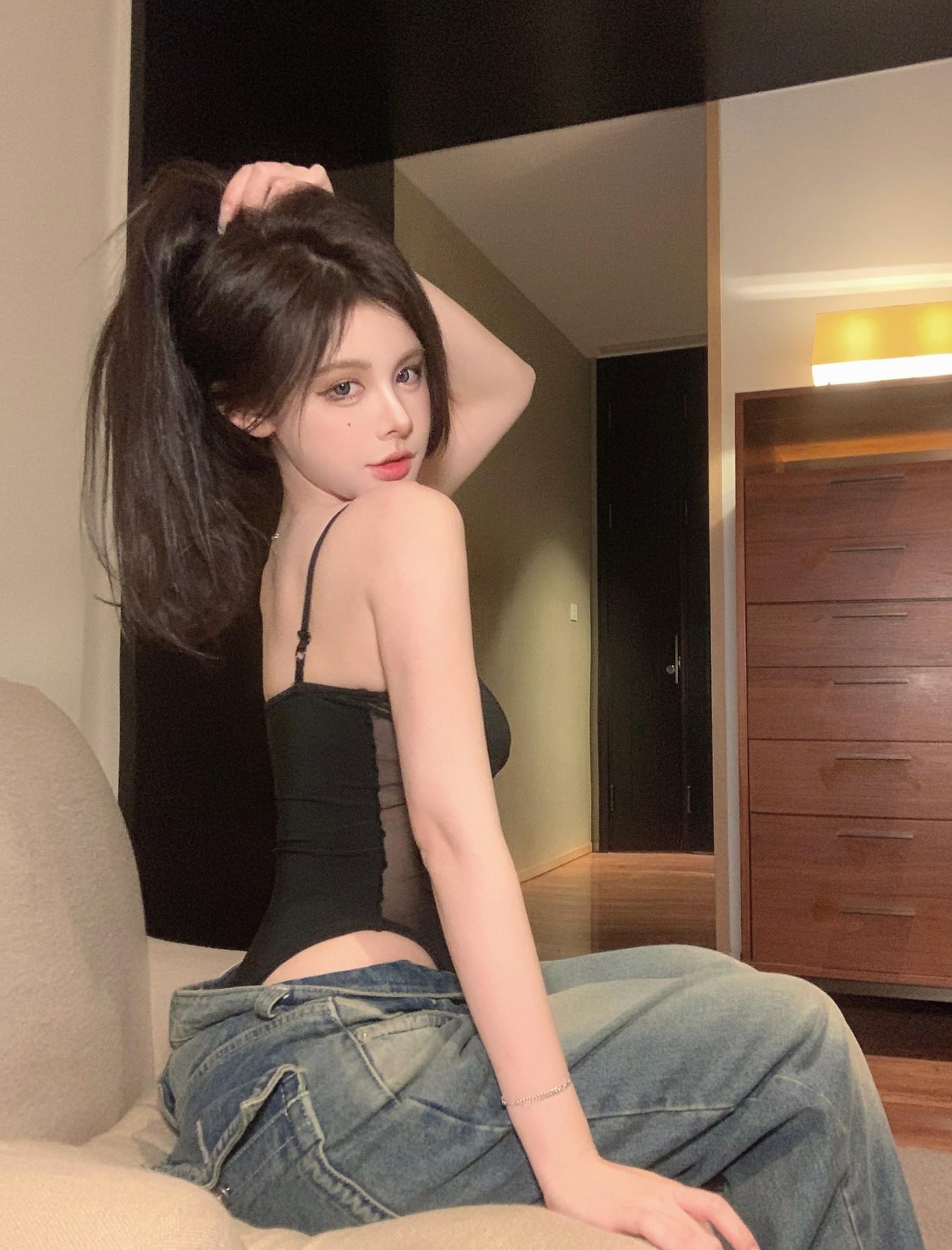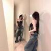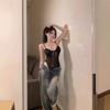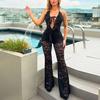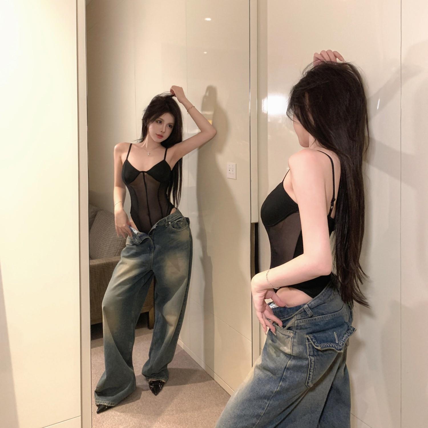 Diseño Sling Corte bajo Deseo puro Perspectiva Spice Girl Sling Costuras de malla negra Espalda descubierta Mono elegante Mujer