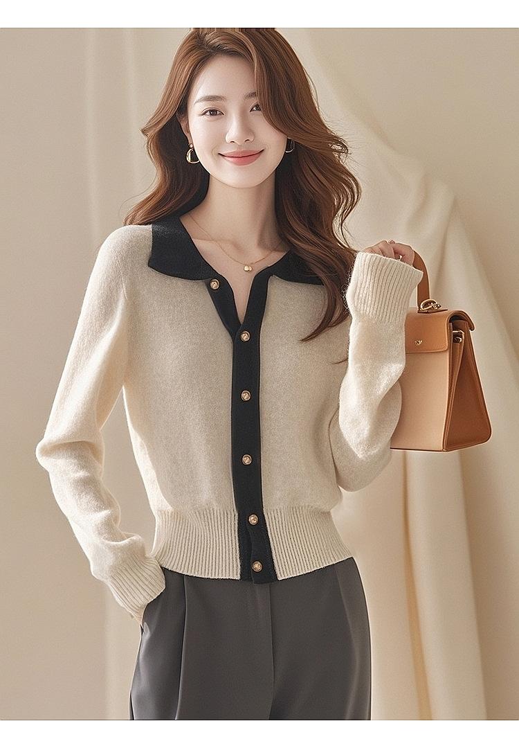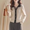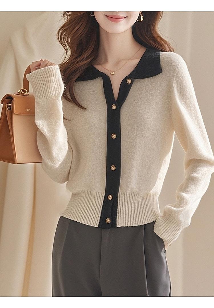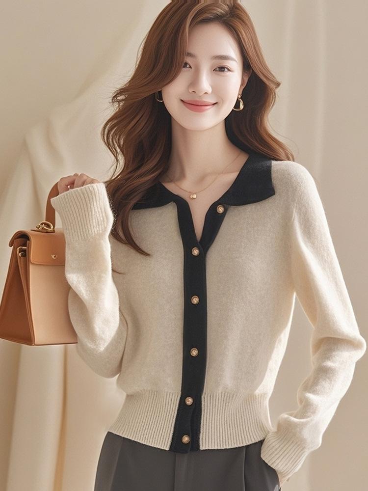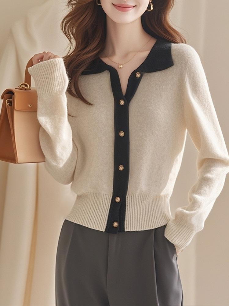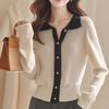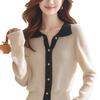 2024 Invierno Nuevo Cárdigan de Punto con Solapa Tops para Mujer Color Contraste Suave Ceroso Cálido Casual Suéter de Manga Larga