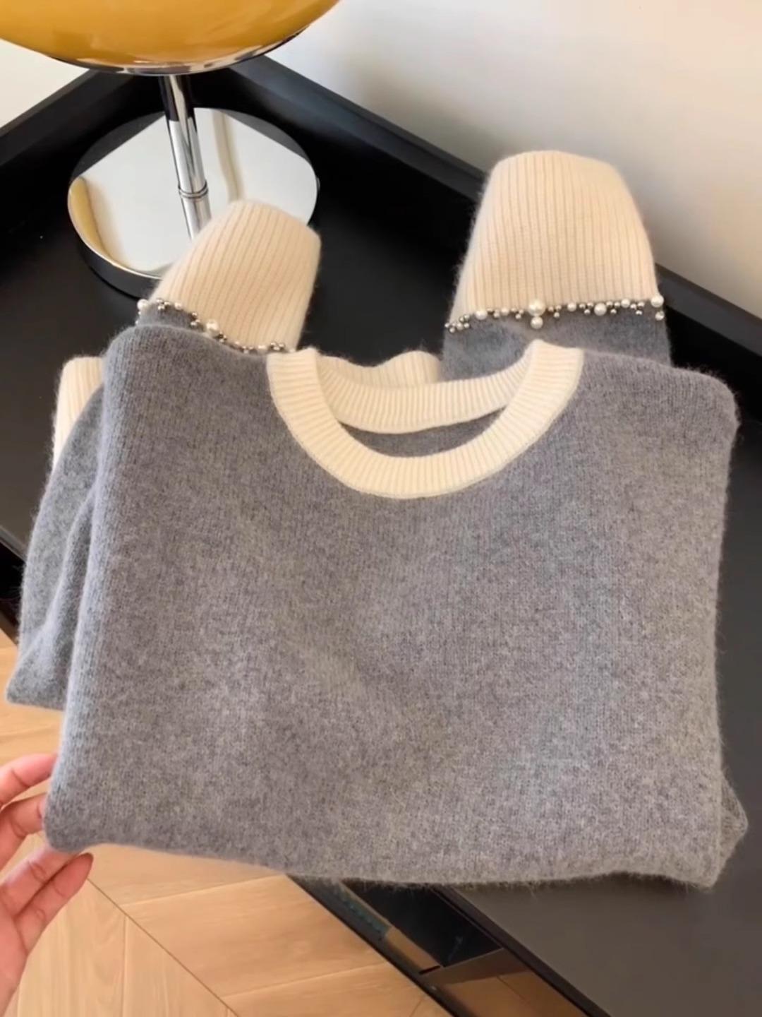 Suéter holgado de estilo perezoso con bloques de color para mujer, diseño de otoño e invierno, puños de nicho con cuentas, estilo francés