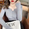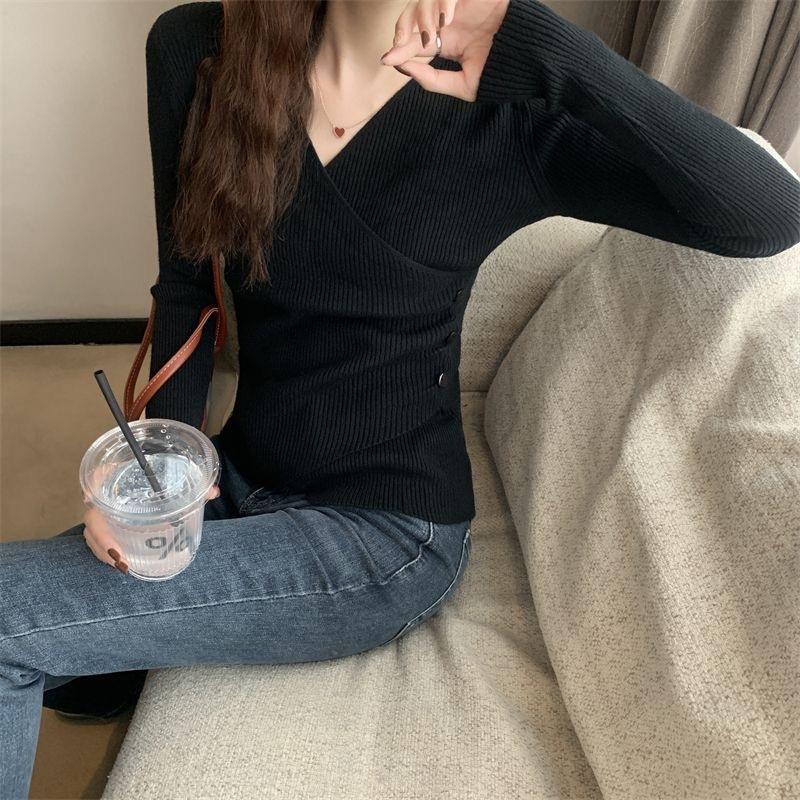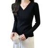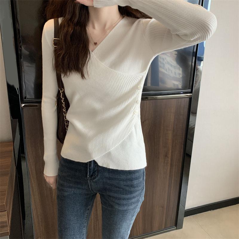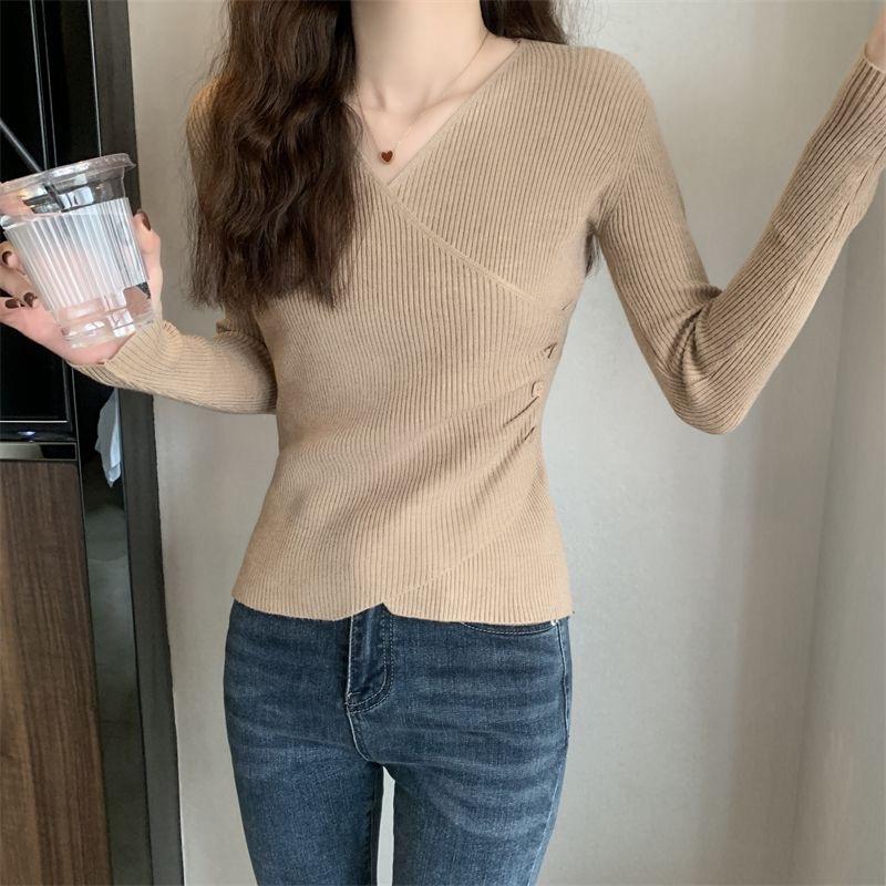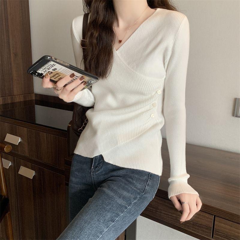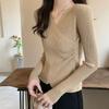 Camisa básica con escote en V cruzado para mujer, primavera y otoño, nuevo estilo, diseño de punto, estilo occidental, interior corto, manga larga, irregular