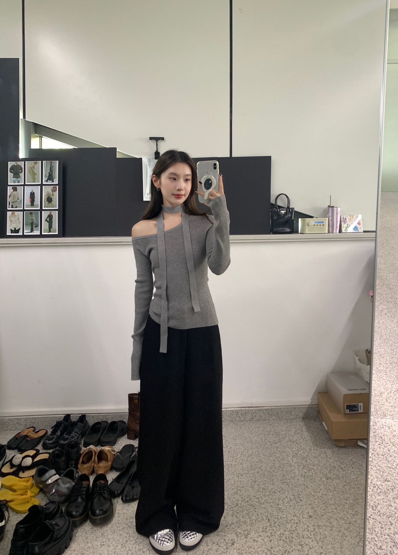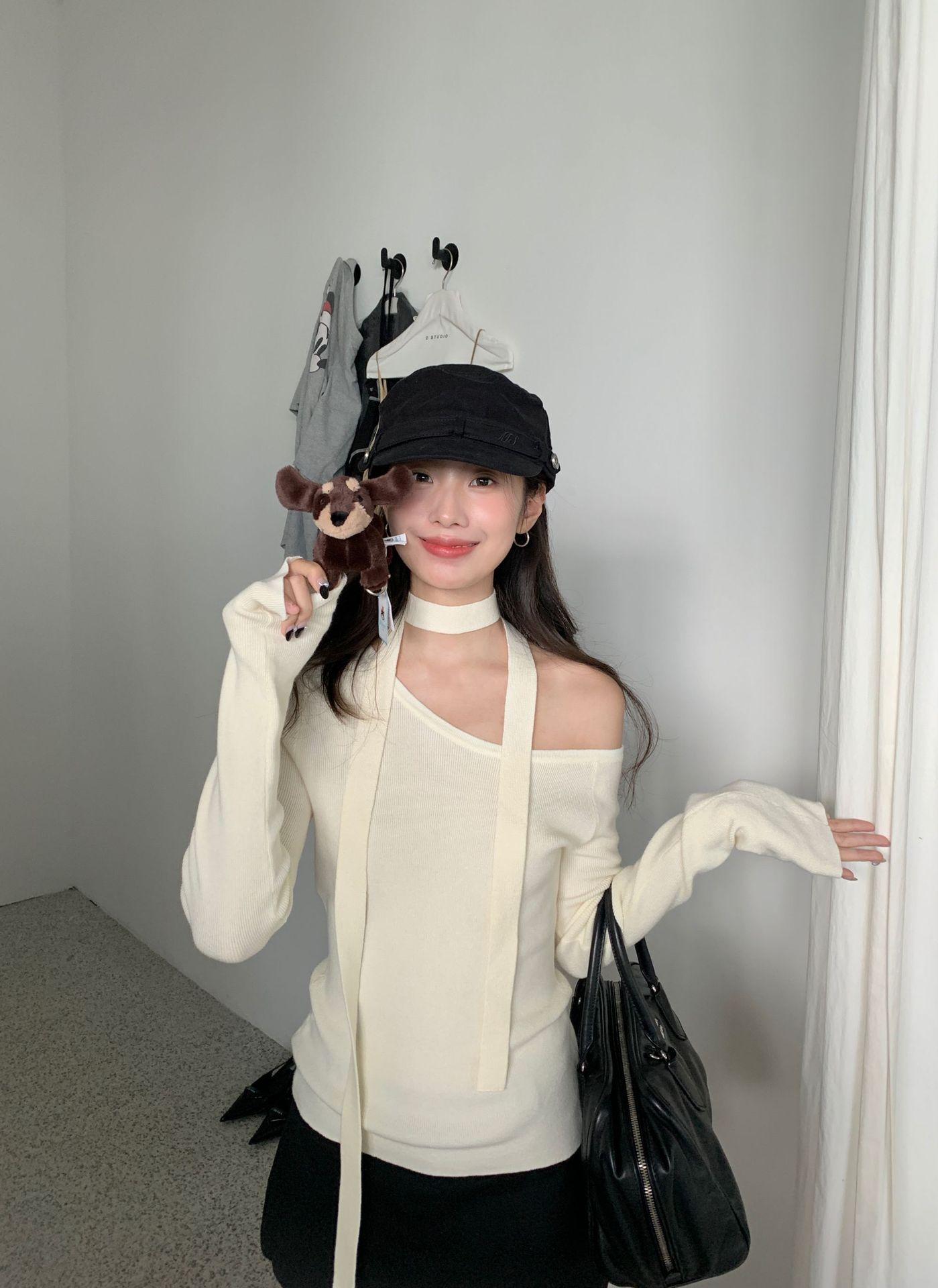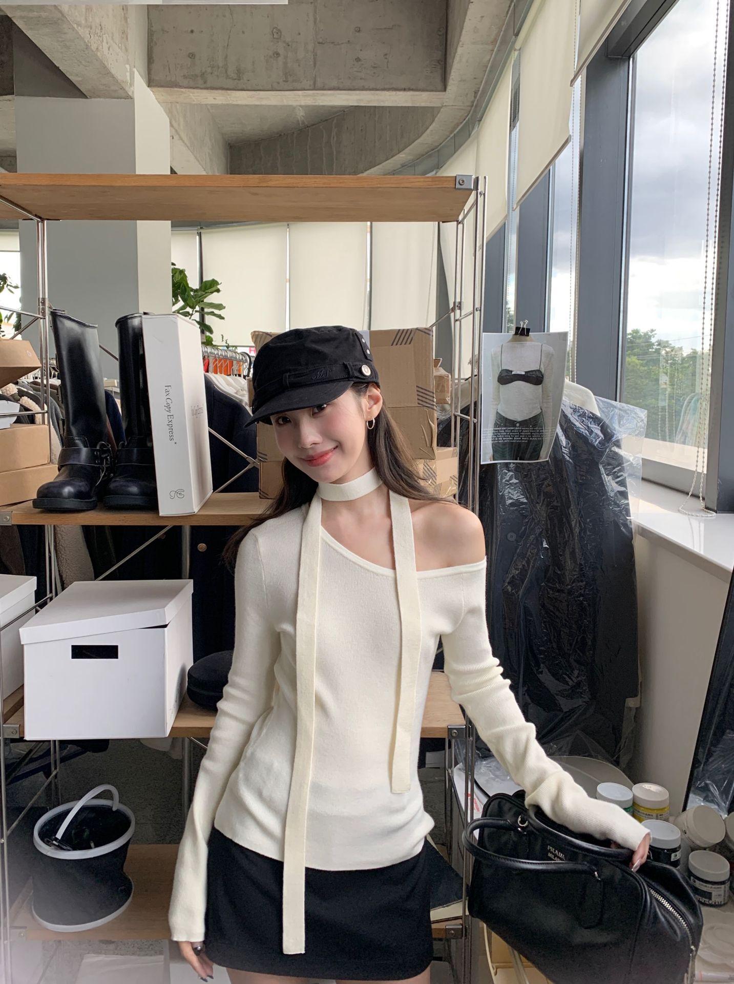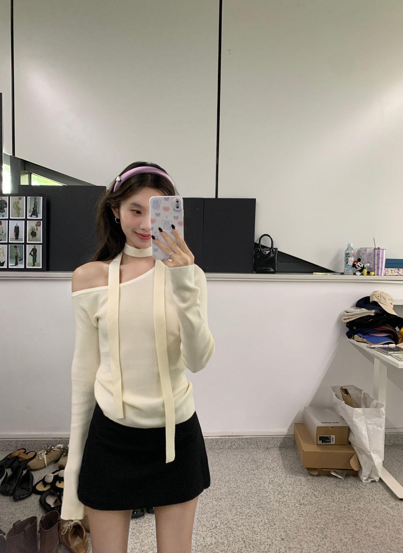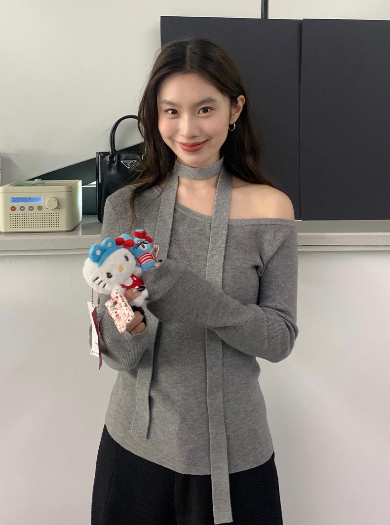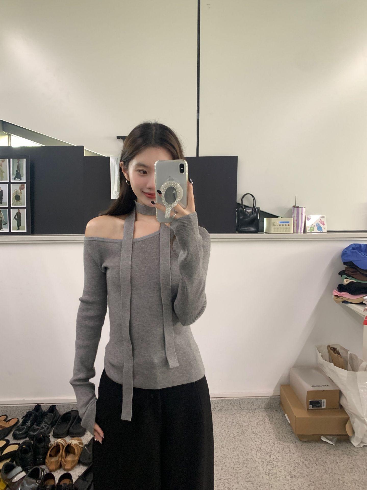 Nuevo diseño de otoño, camiseta ajustada adelgazante con hombros descubiertos y cuello colgante de Spice Girl para mujer
