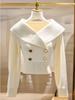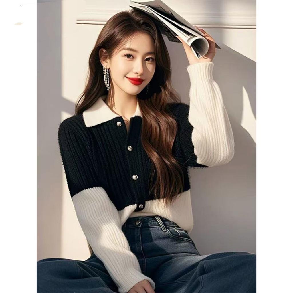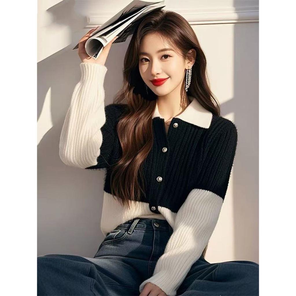 Suéter de punto con solapa y contraste de color para mujer, otoño e invierno 2024, estilo coreano, elegante, adelgazante, cárdigan de punto