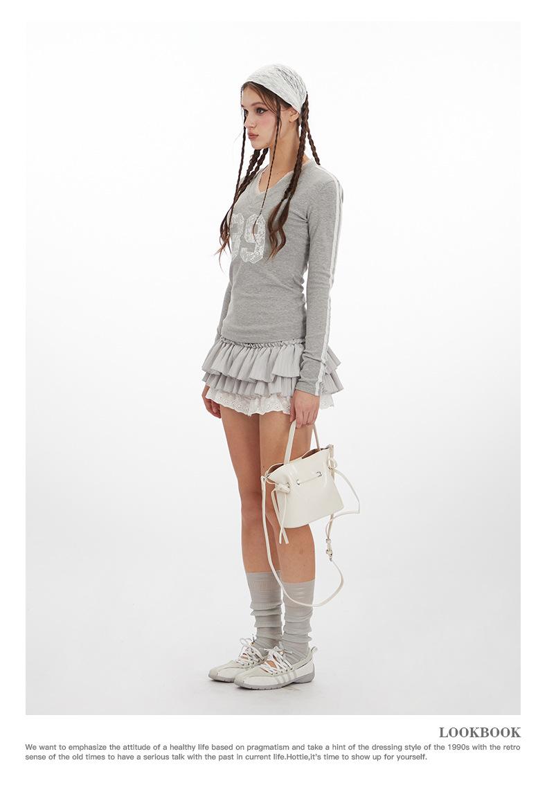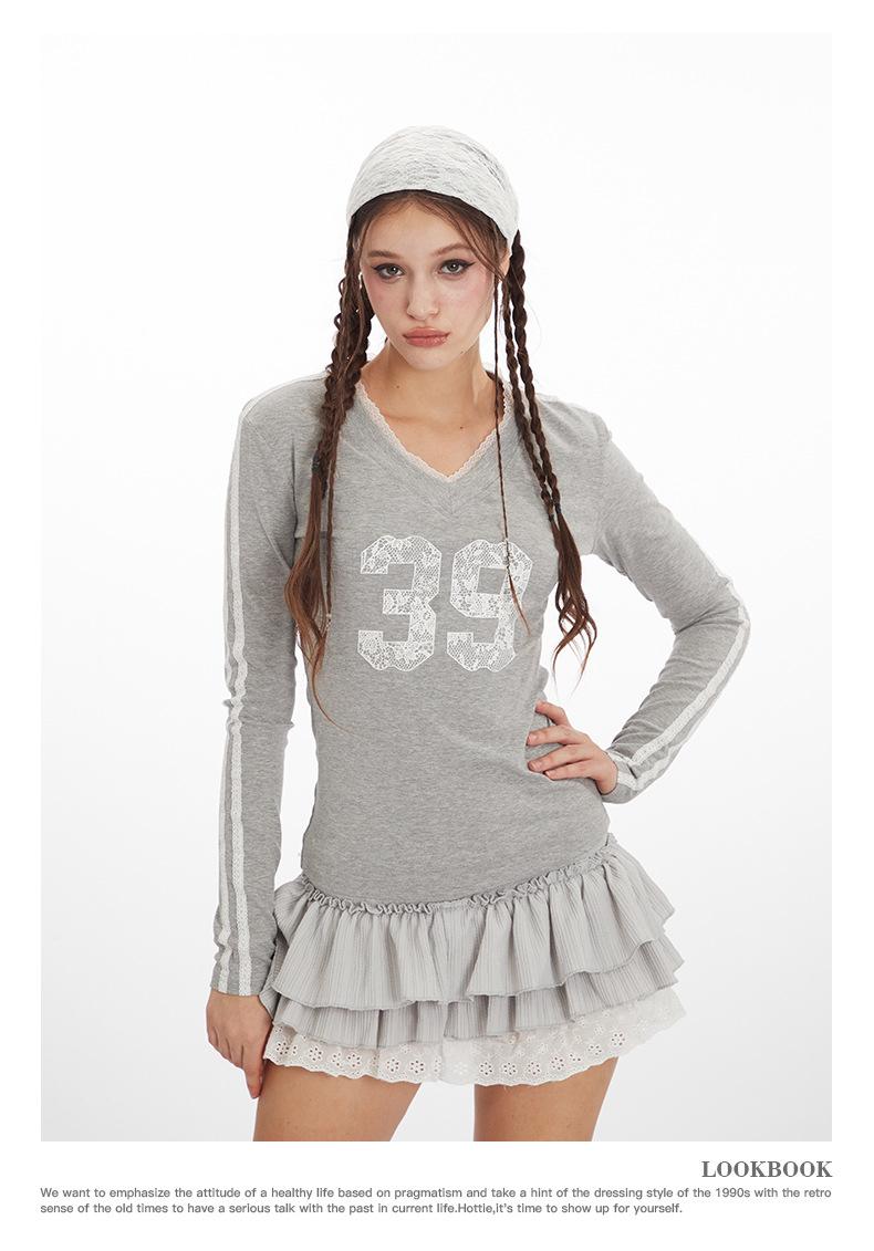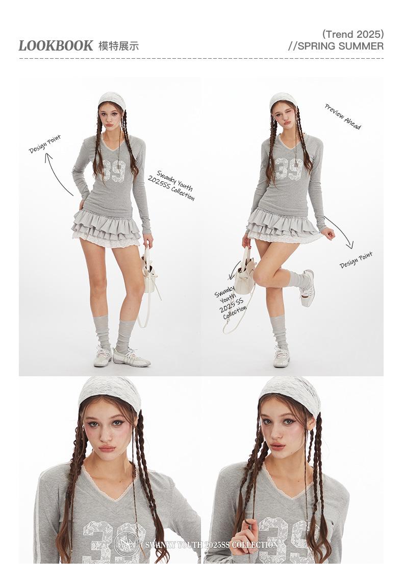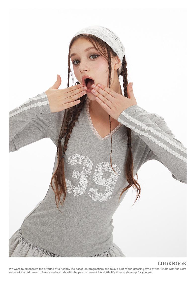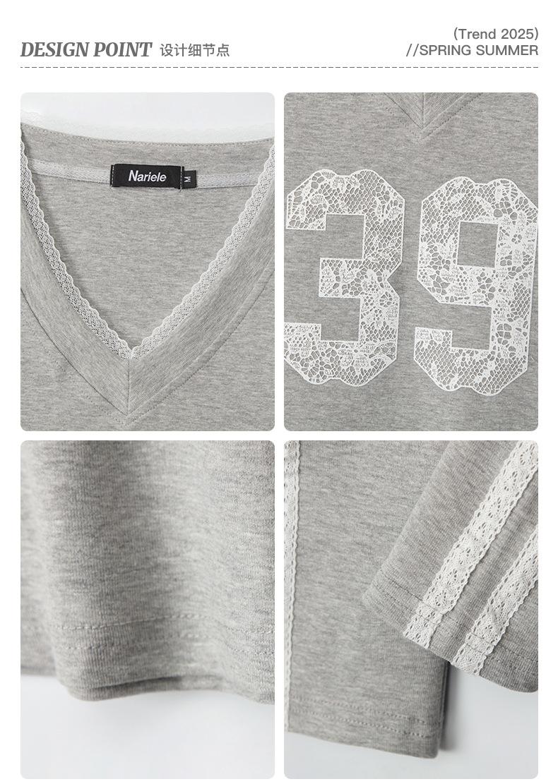 HeyHenry 2025 - Camiseta ajustada de manga corta y larga con cuello en V y diseño de costura de encaje europeo y americano para chica sexy