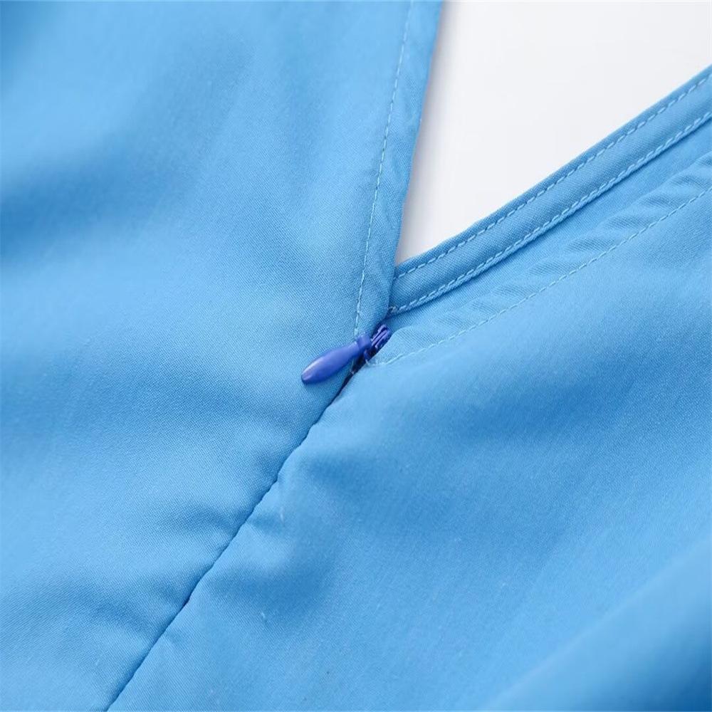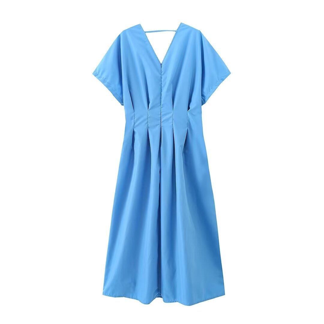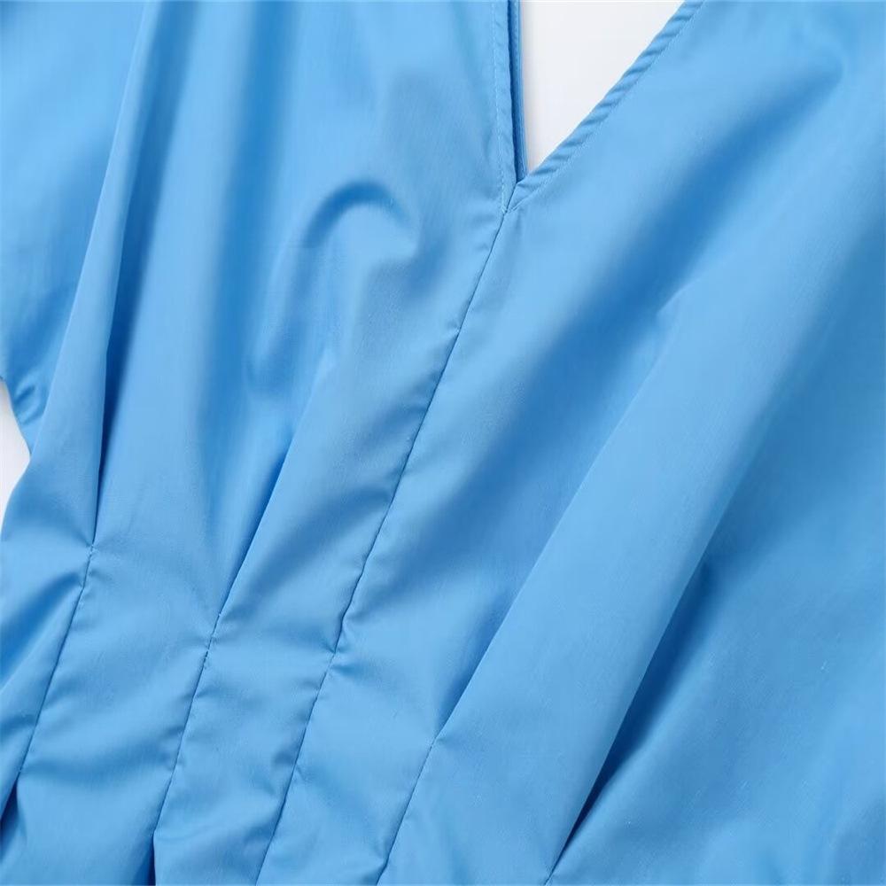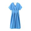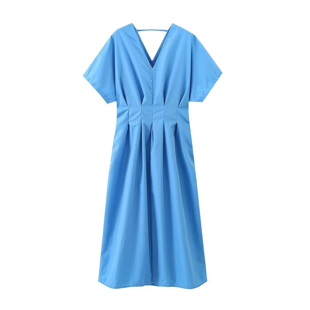 Suministro Transfronterizo Ropa de Verano para Mujer Estilo Europeo y Americano Moda Europea y Americana Elegante Cuello en V Color Puro Cintura Plisada Vestido de Bajo Amplio