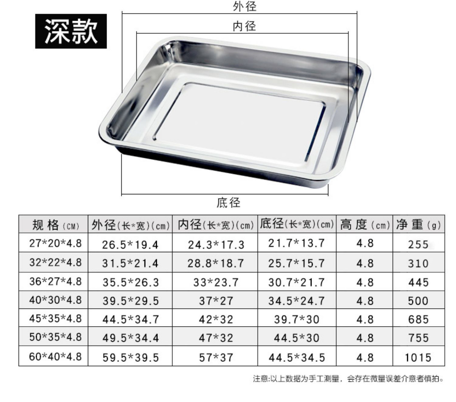 Non-magnetic deep plate 45*35*4.8cm, Non-magnetic deep dish 50×35×4.8cm (304), Non-magnetic shallow dish 32×22...