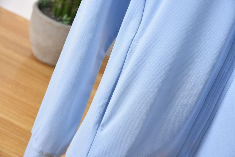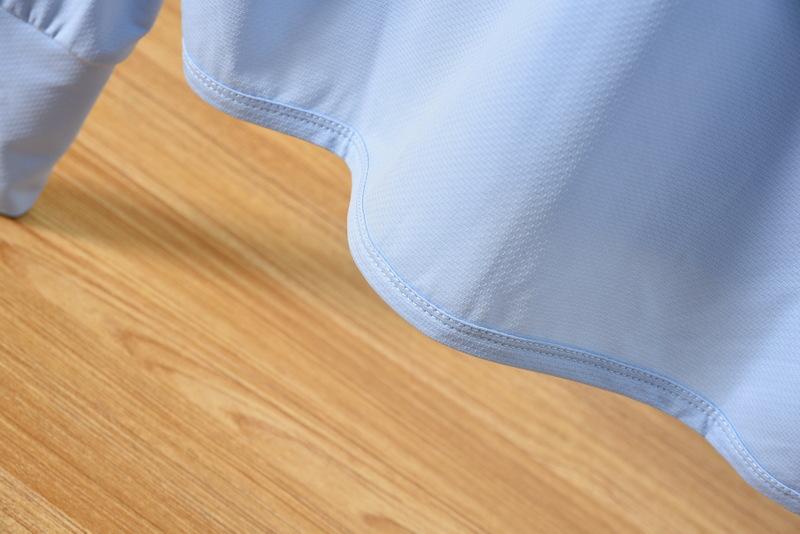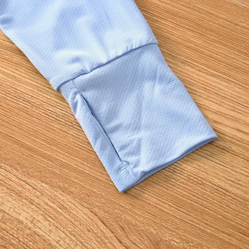 Los puños tienen orificios para los pulgares, lo que ayuda a que las mangas se envuelvan alrededor del dorso de las manos.