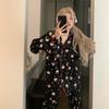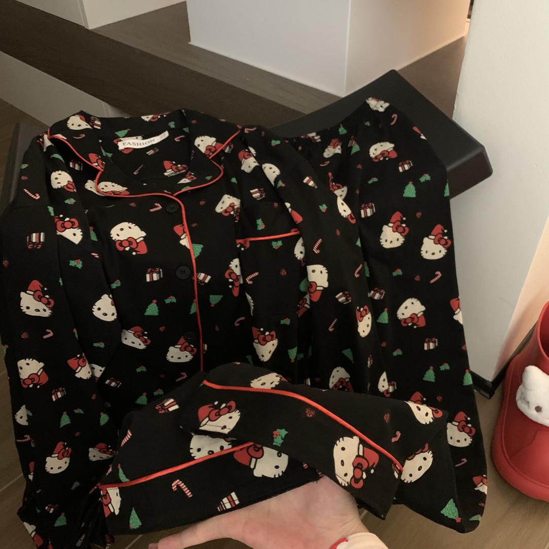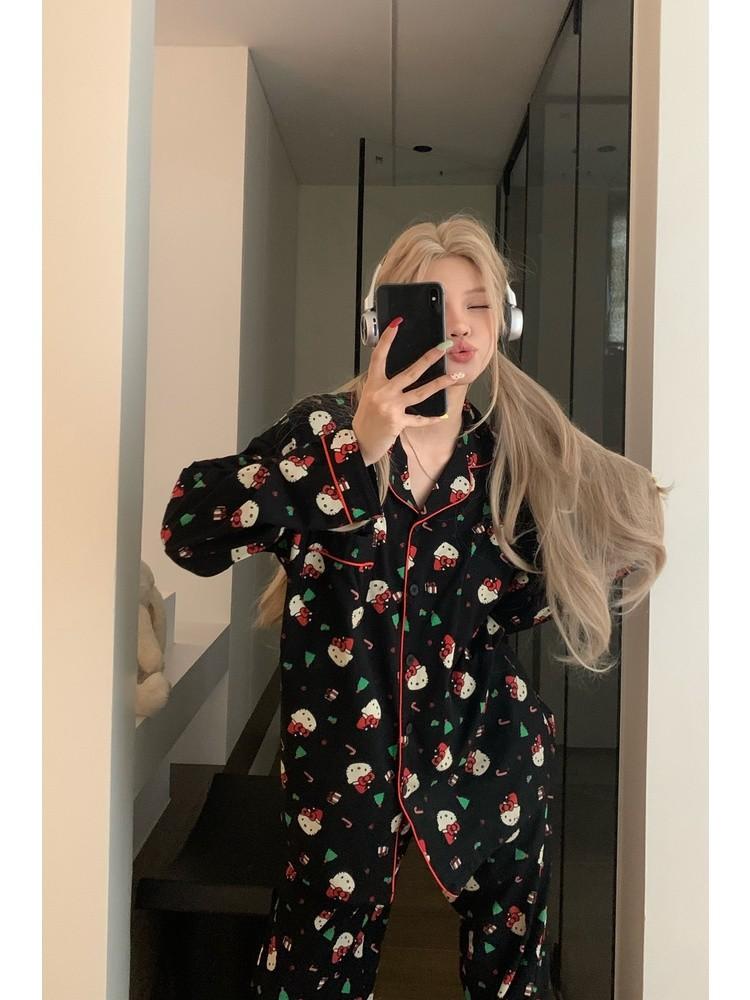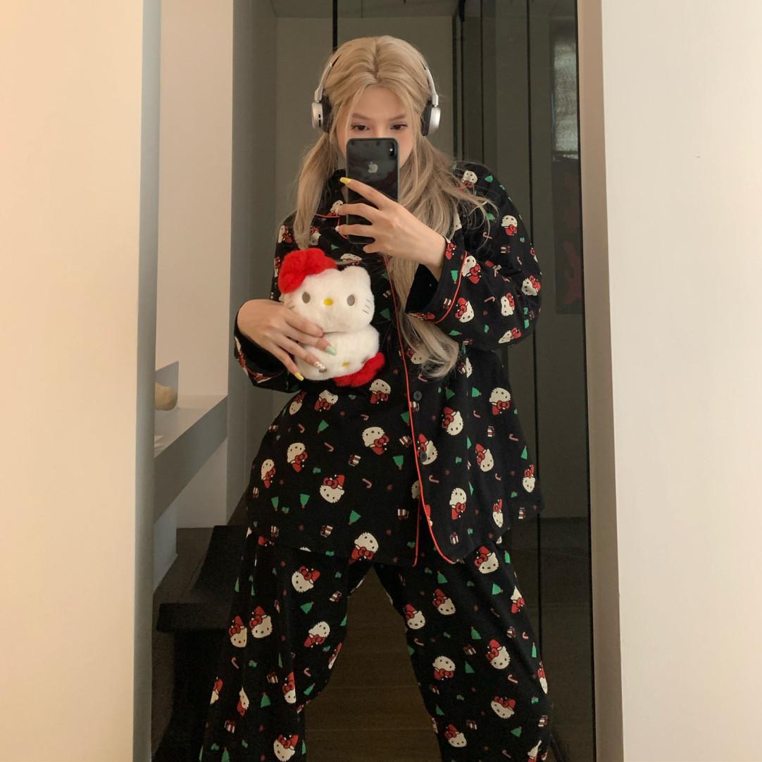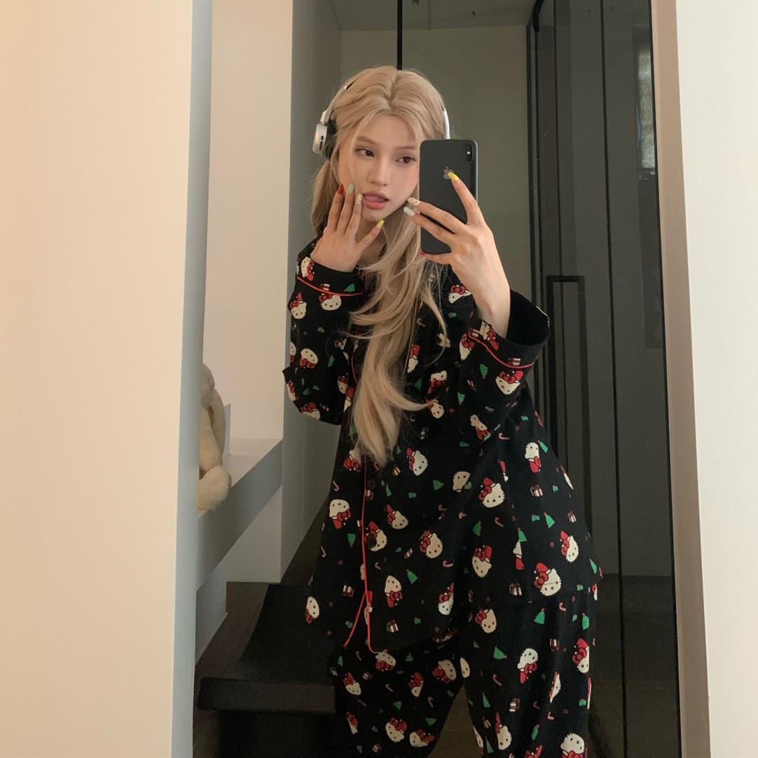 Pijama Estilo Coreano Estilo Ins para Mujer Primavera y Otoño Día Negro Navidad Gato Manga Larga Pantalones Estudiante Dibujos Animados Traje Ropa de Casa