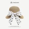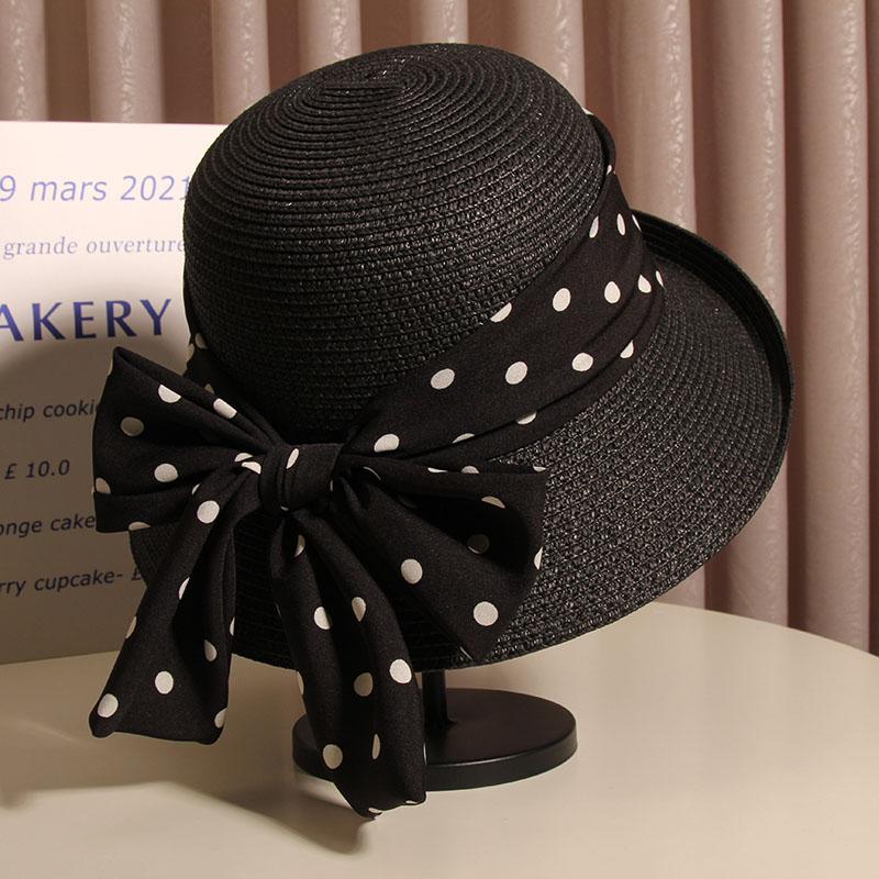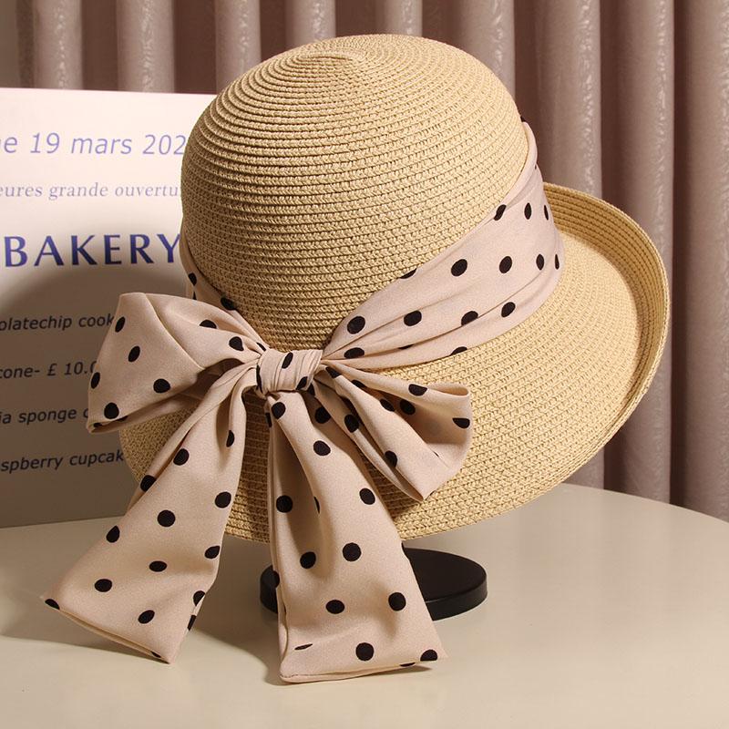 Elegante sombrero de paja retro francés Hepburn con lunares y lazo para mujer, verano, vacaciones junto al mar, sombrero de cubo de playa a prueba de sol