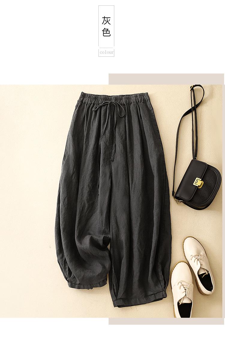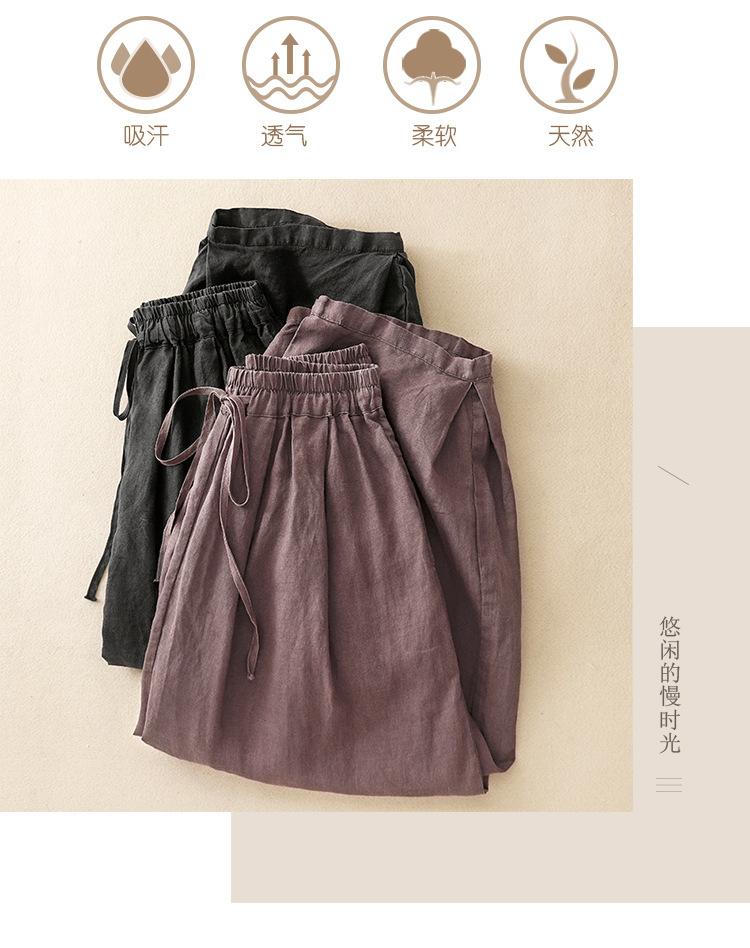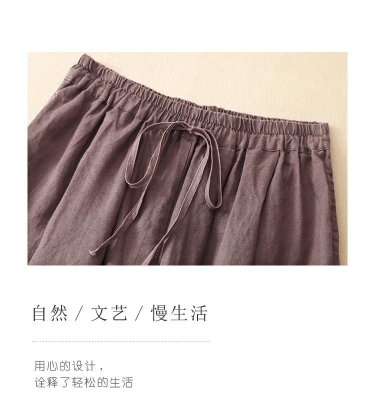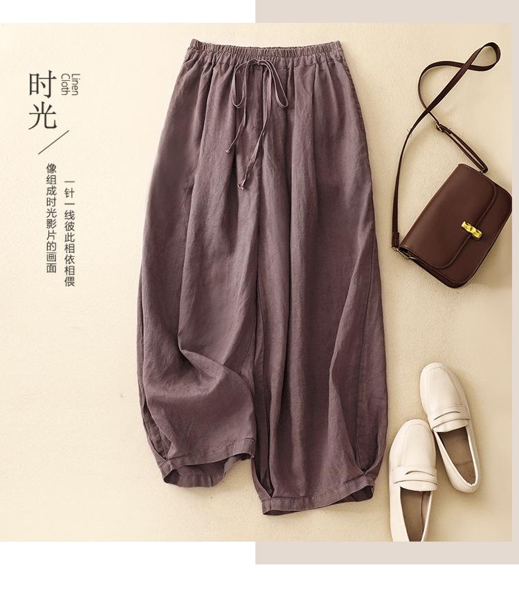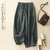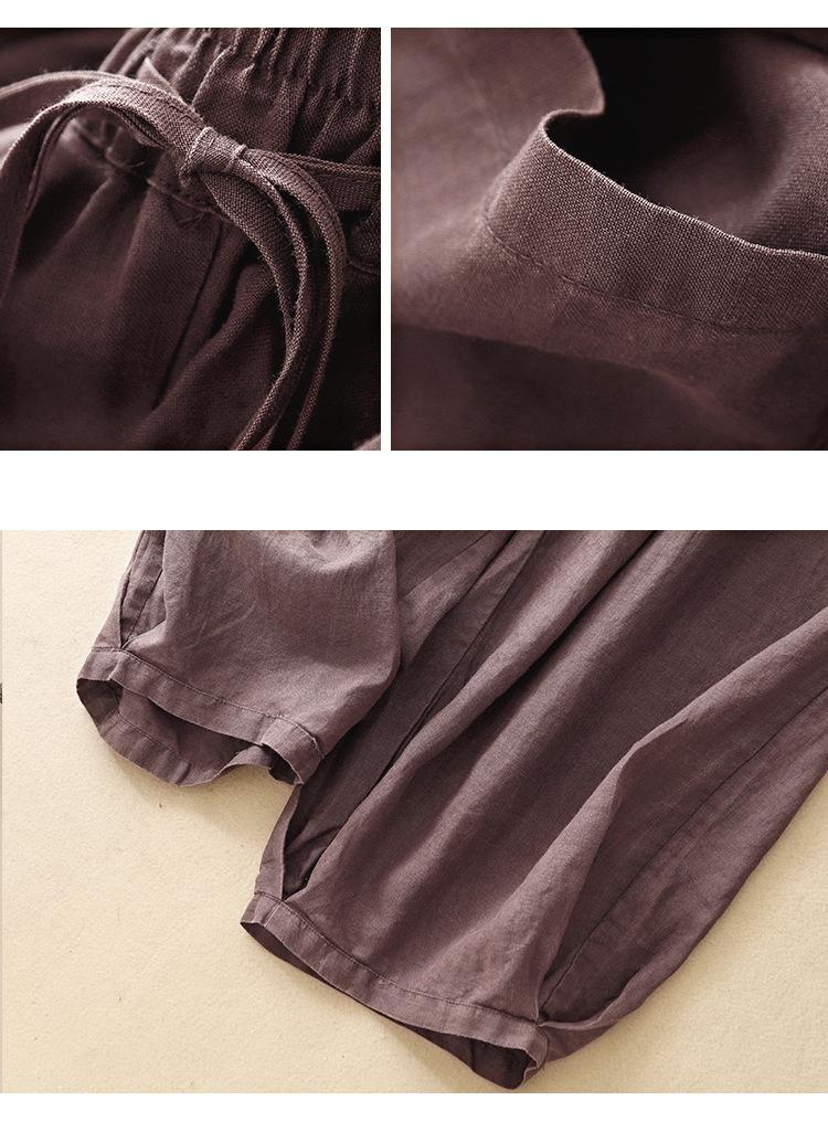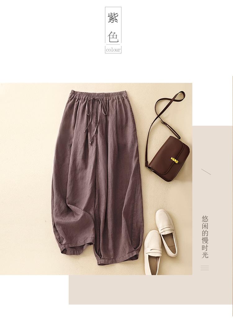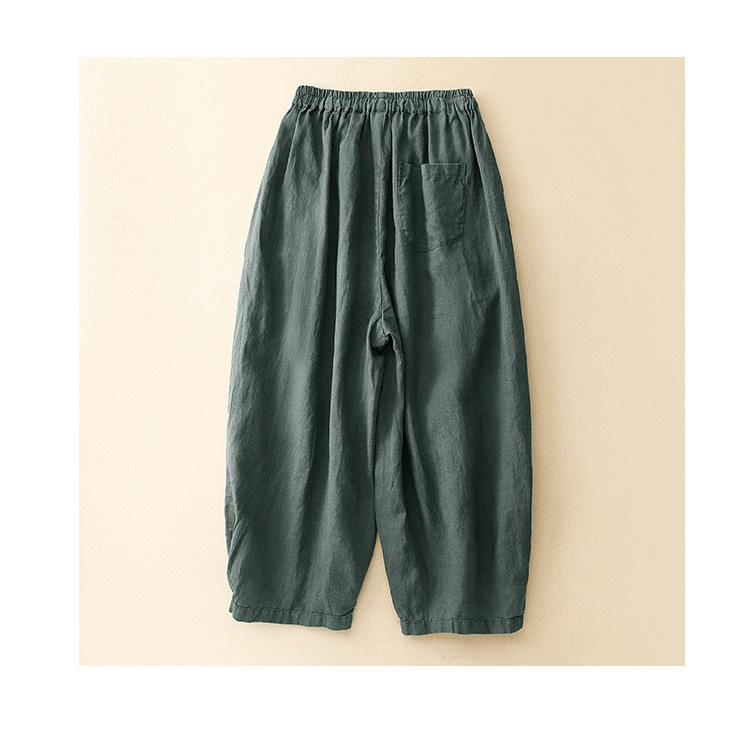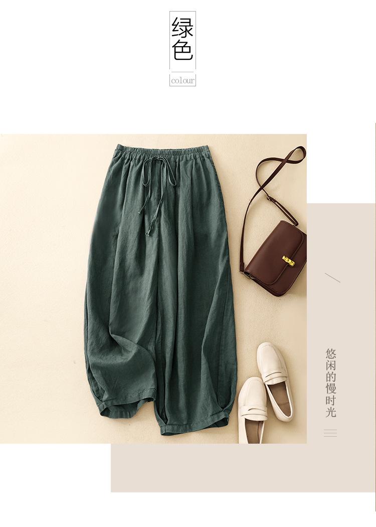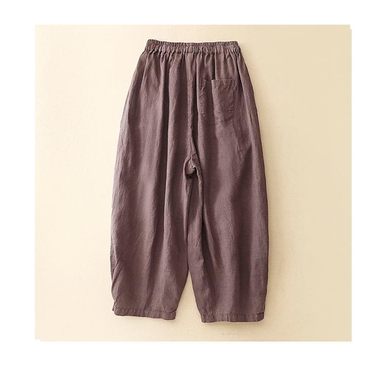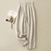 Pantalones casuales recortados con cintura elástica de color sólido, sueltos, retro, literarios, de algodón y lino, de verano 2024, para mujer
