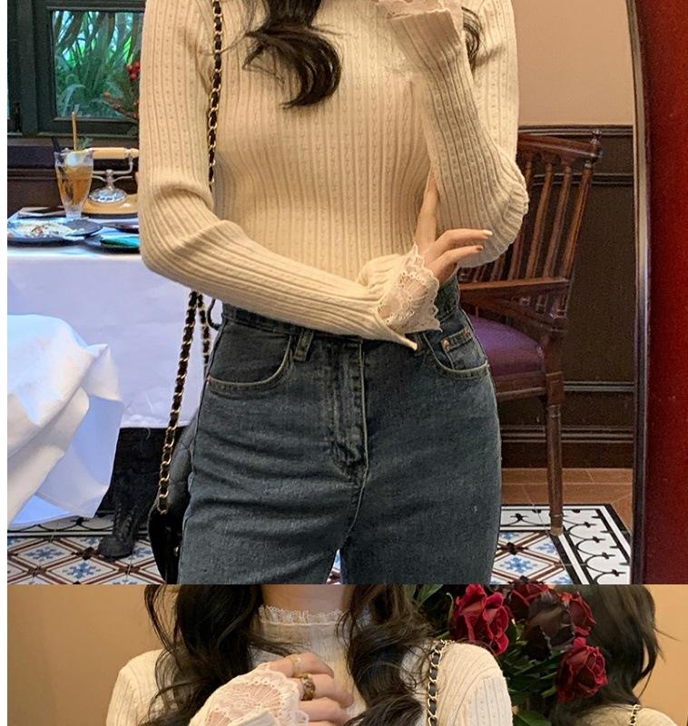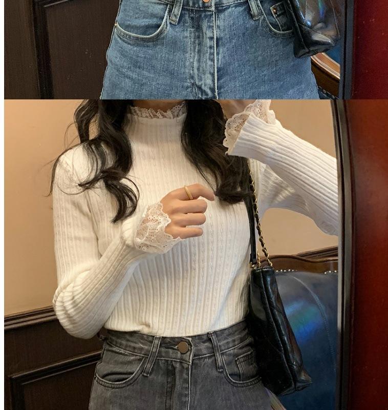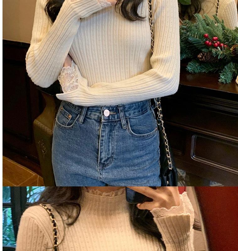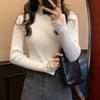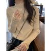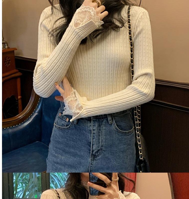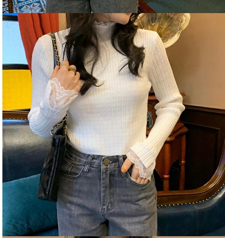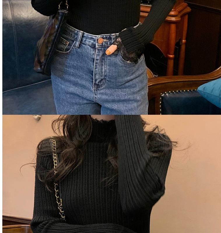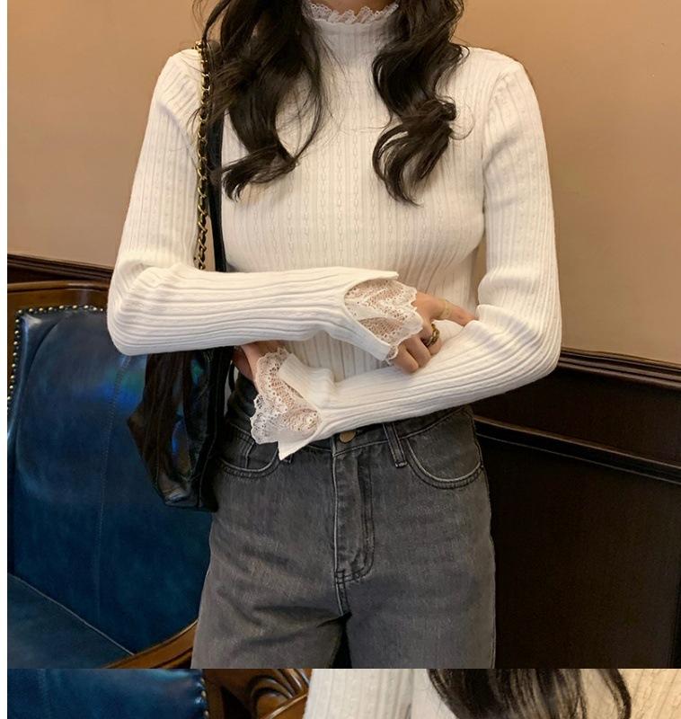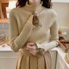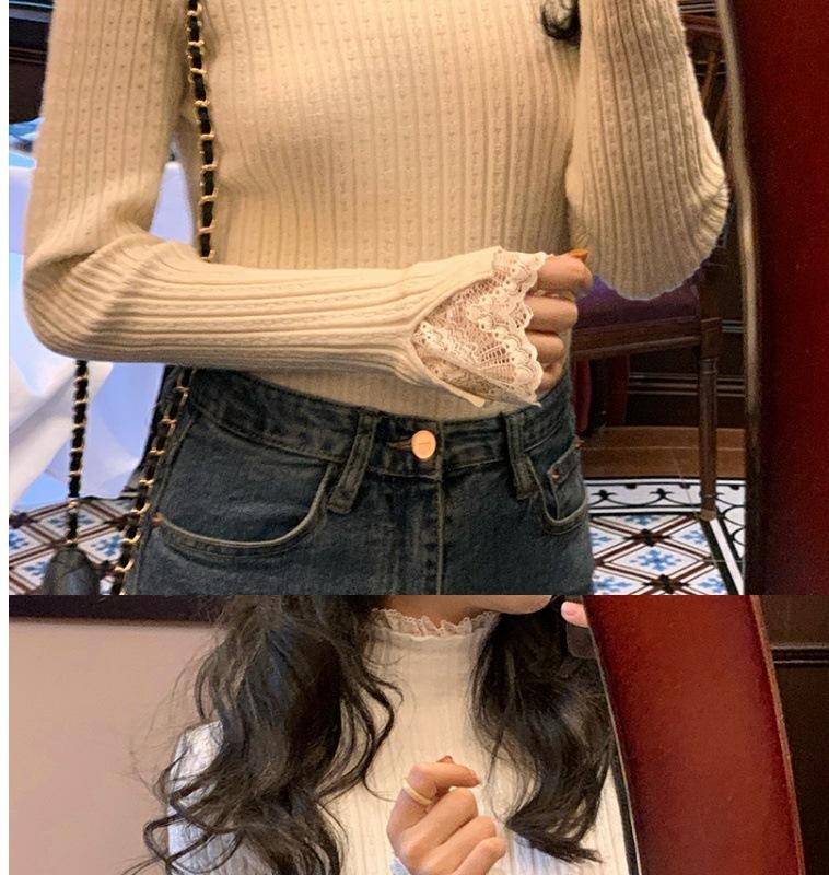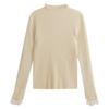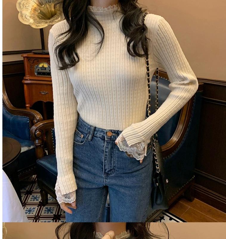 Camisa de base de encaje para mujer, otoño e invierno, cuello medio alto, corte entallado, suéter elegante, color albaricoque, suéter de manga larga.
