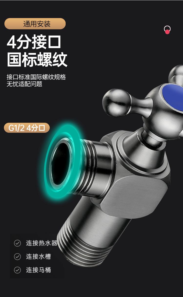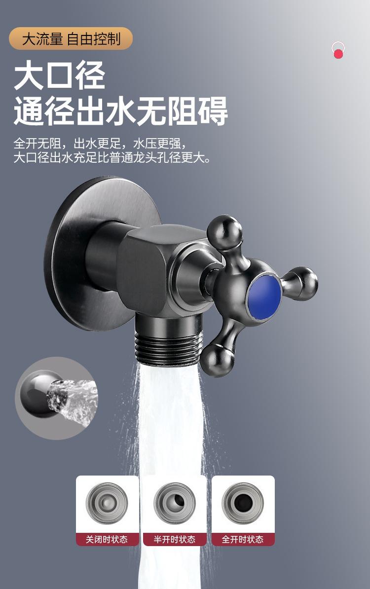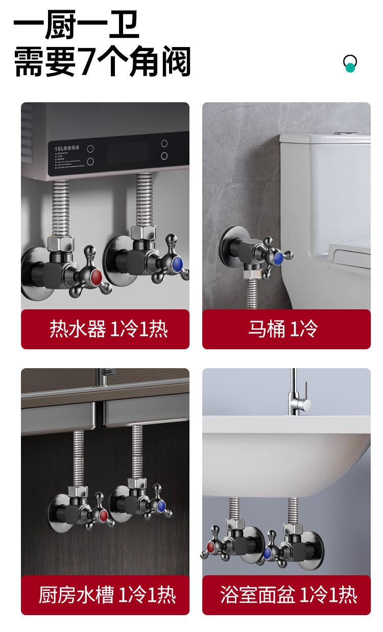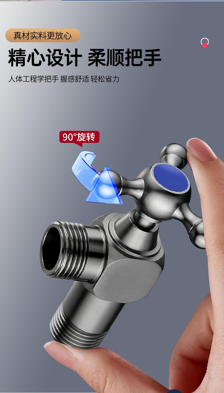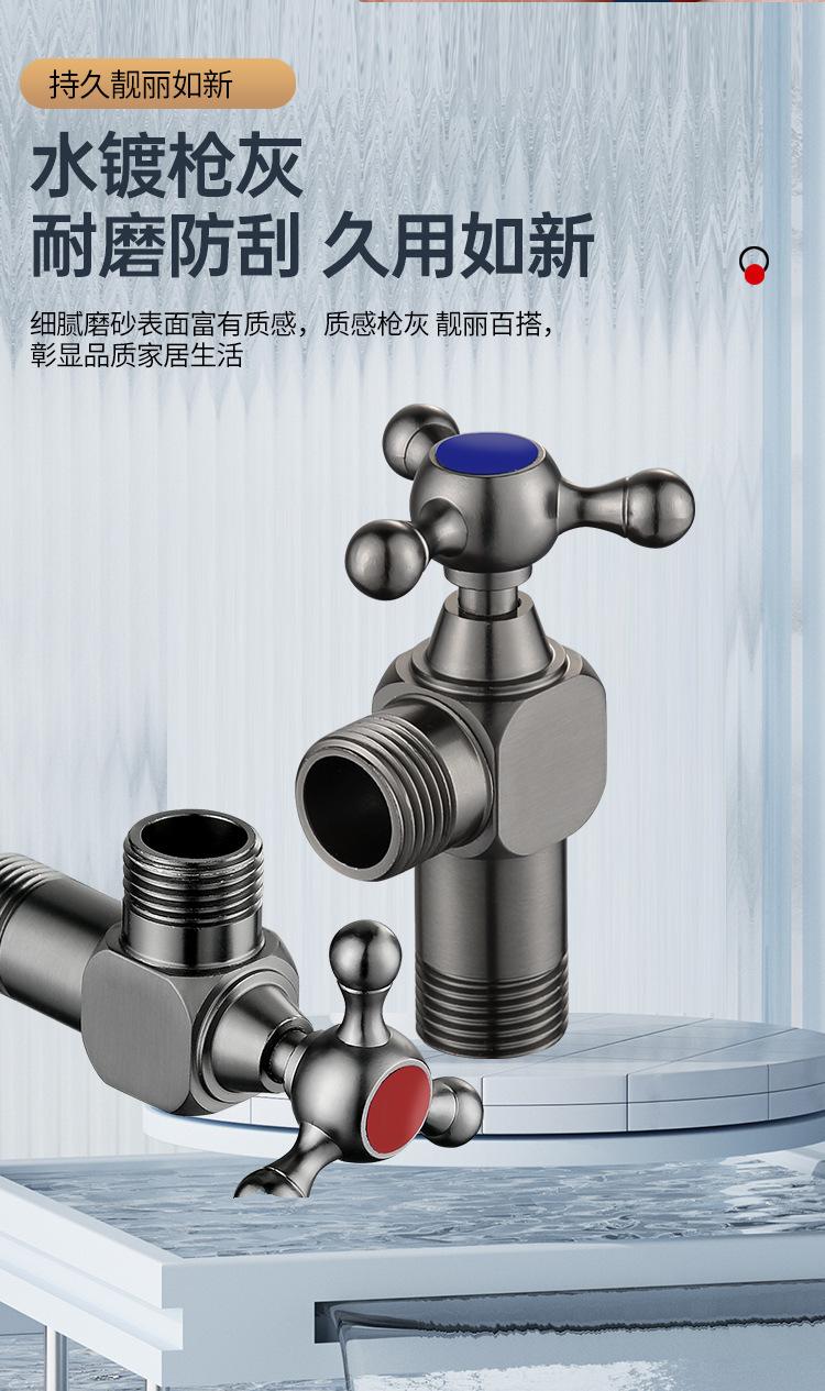 Válvula de ángulo de flujo grande con núcleo de bola totalmente abierto, todo de cobre, calentador de agua a gas para agua fría y caliente, válvula de bola especial, interruptor de válvula triangular de 4 puntos